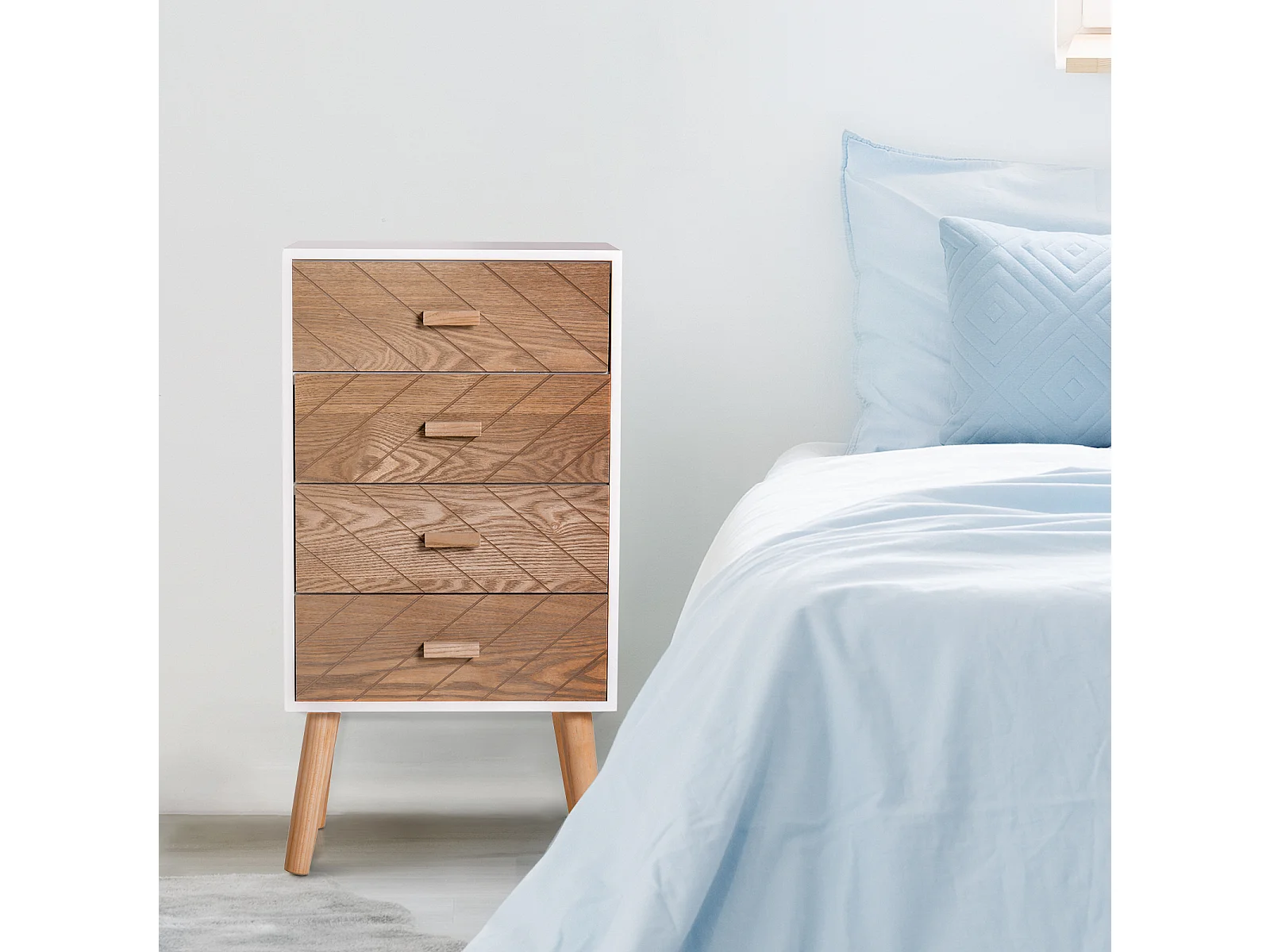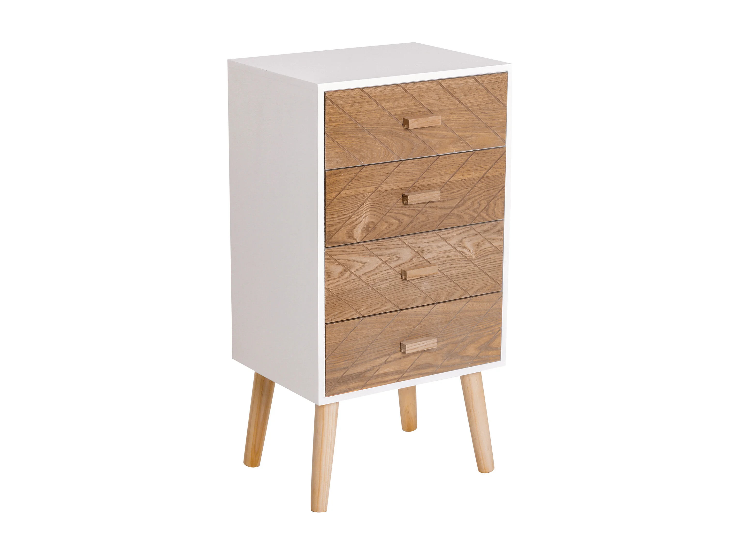 Meuble de rangement chiffonnier design scandinave 40L x 30l x 75H cm 4 tiroirs bois massif pin MDF blanc et hêtre motif graphique