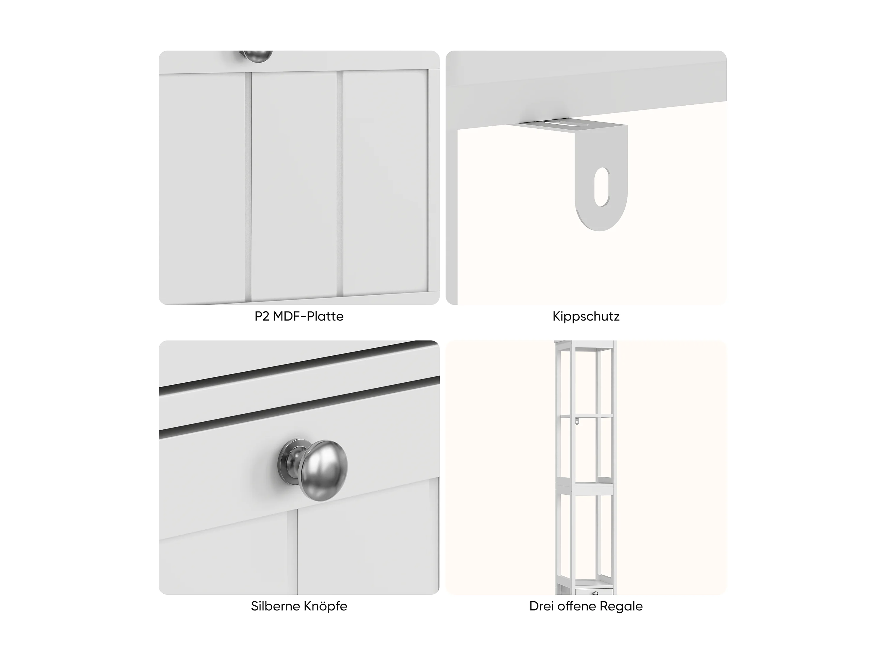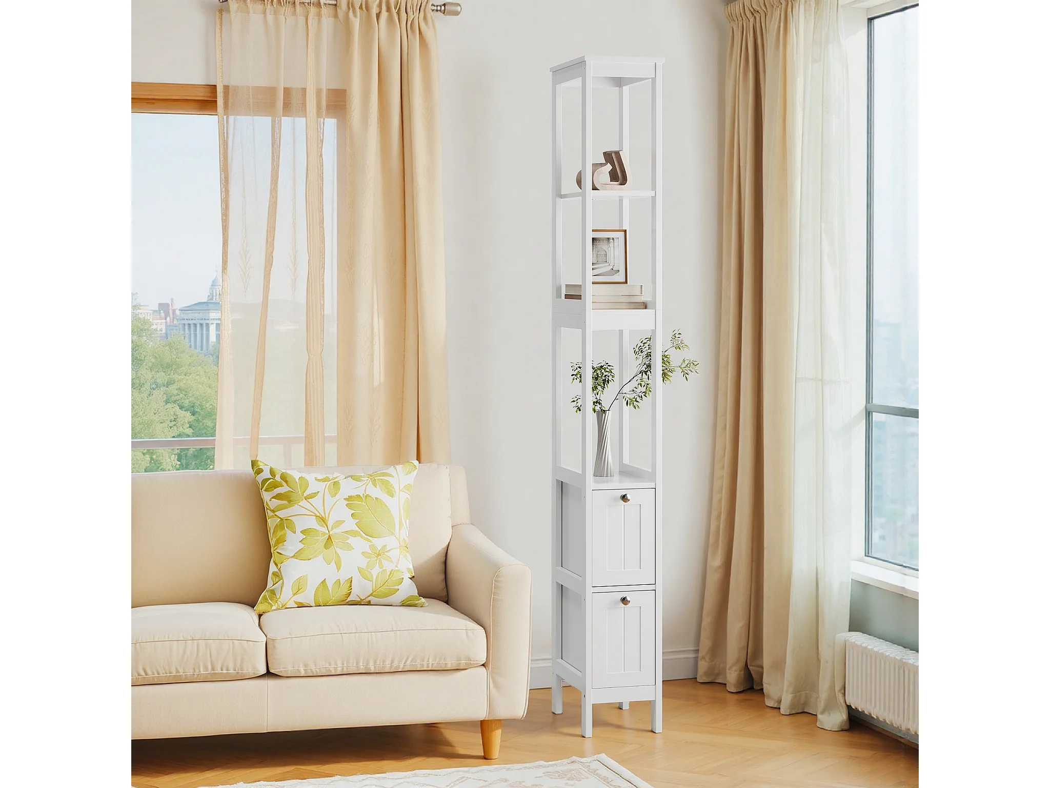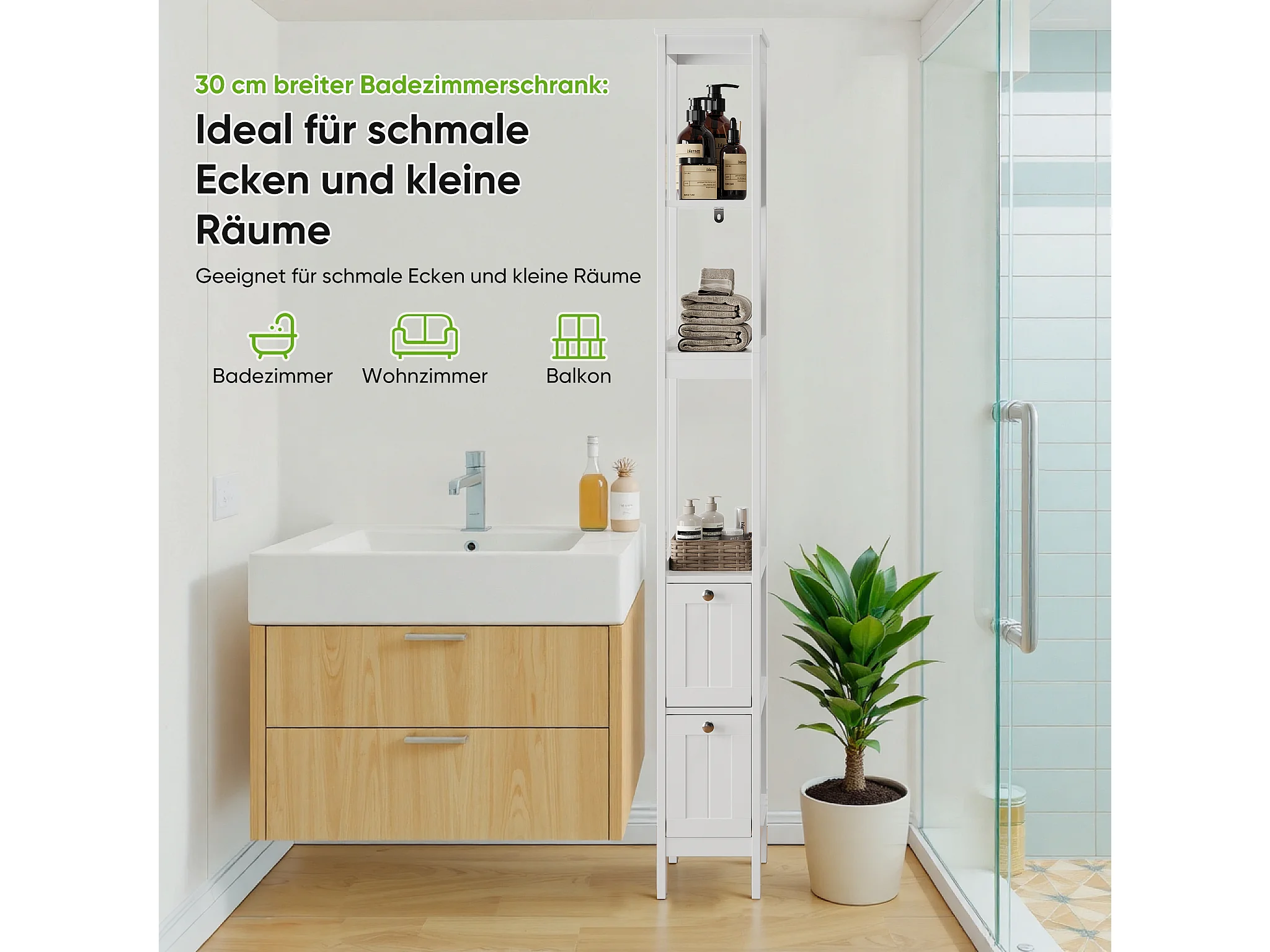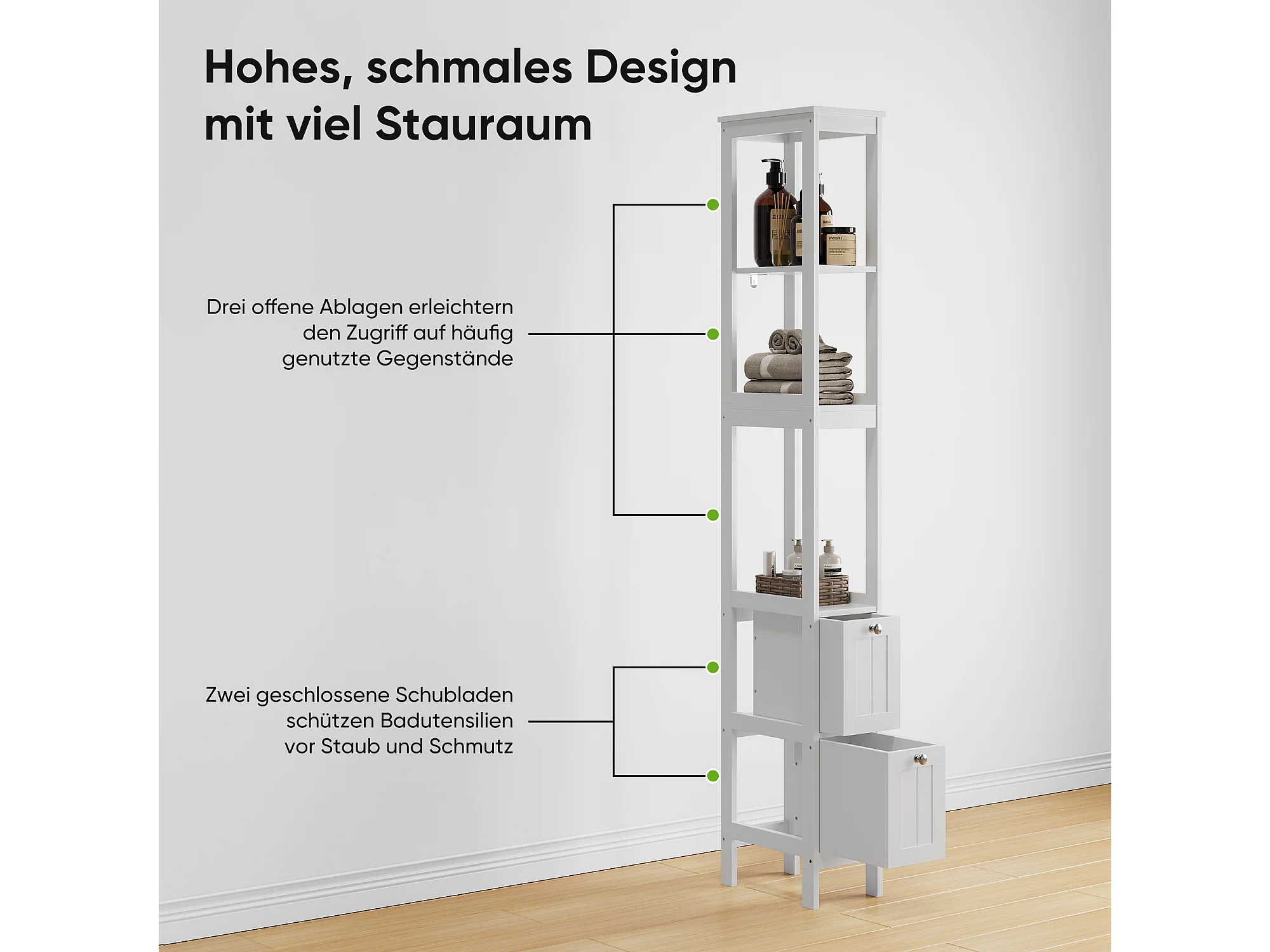 Meuble de salle de bain étroit, avec 2 tiroirs et 3 étagères ouvertes, bois, blanc (30x30x141.2 cm)
