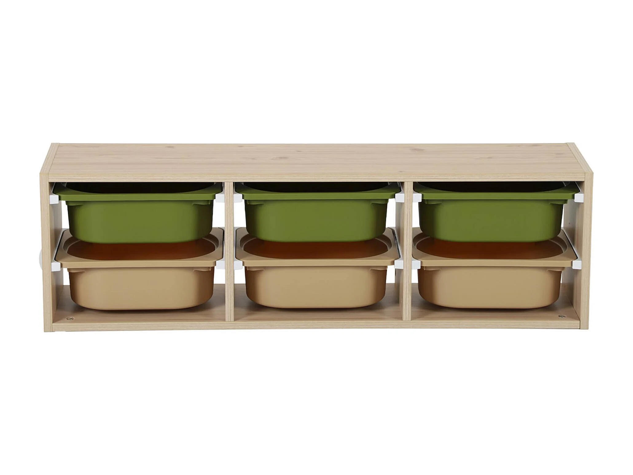 Meuble de rangement naturel pour enfant. 6 bacs en plastique vert olive taupe - Sora
