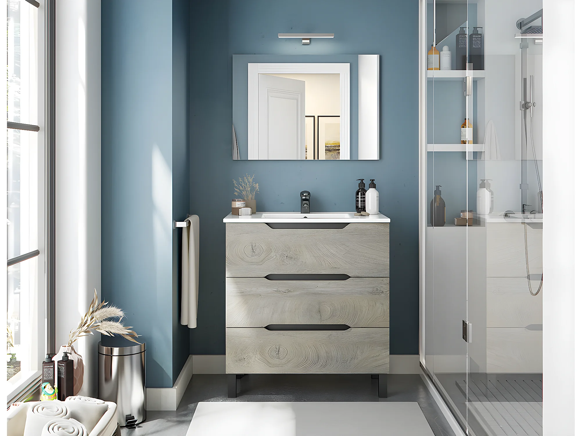 Meuble de salle de bain 80cm avec 3 tiroirs sans poignée coloris chêne à nœuds - Longueur 80 x Profondeur 45 x Hauteur 86 cm