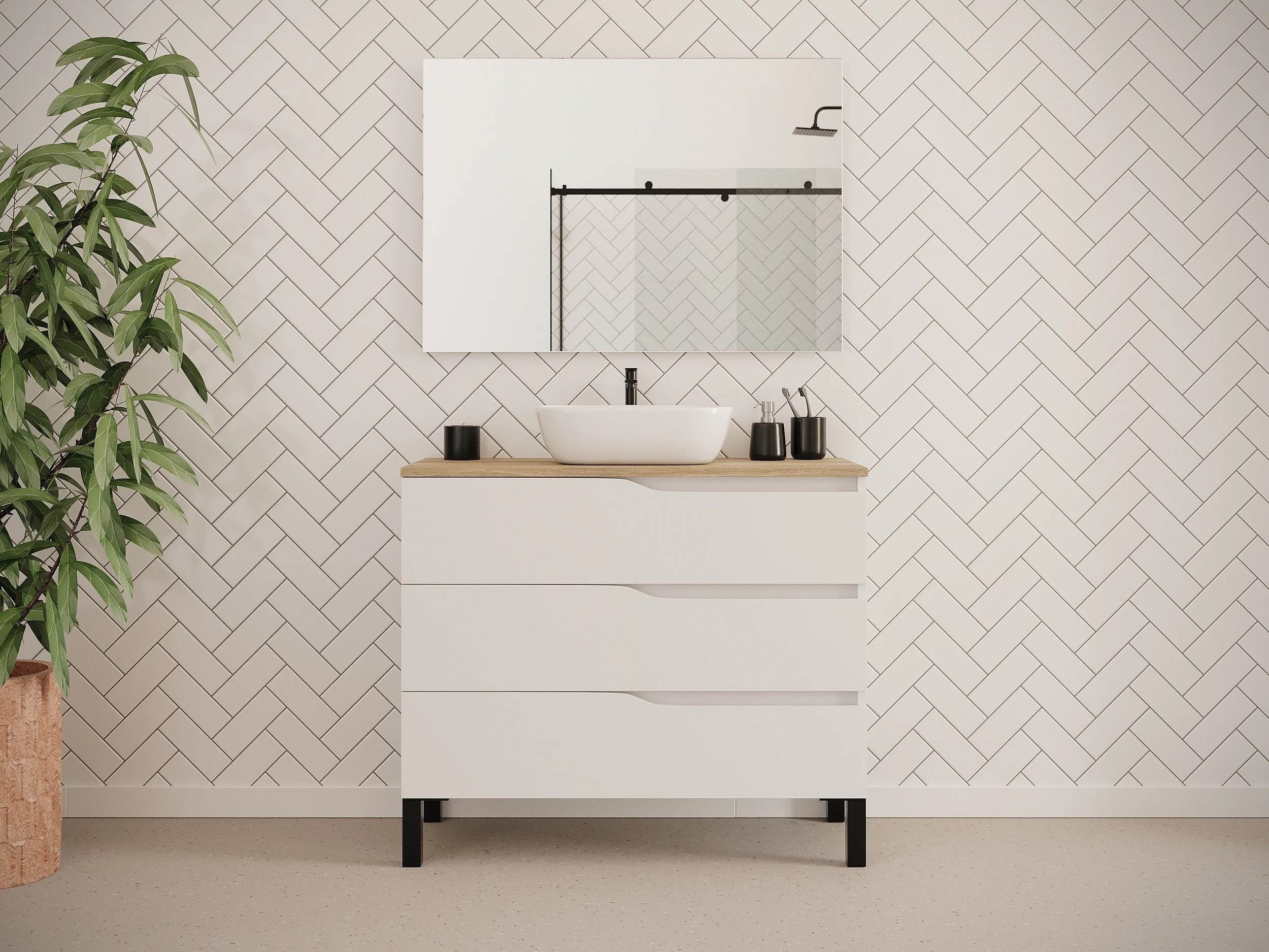 Meuble de salle de bain 90cm avec plateau miel et vasque à poser zeus - 3 tiroirs - blanc - MATA