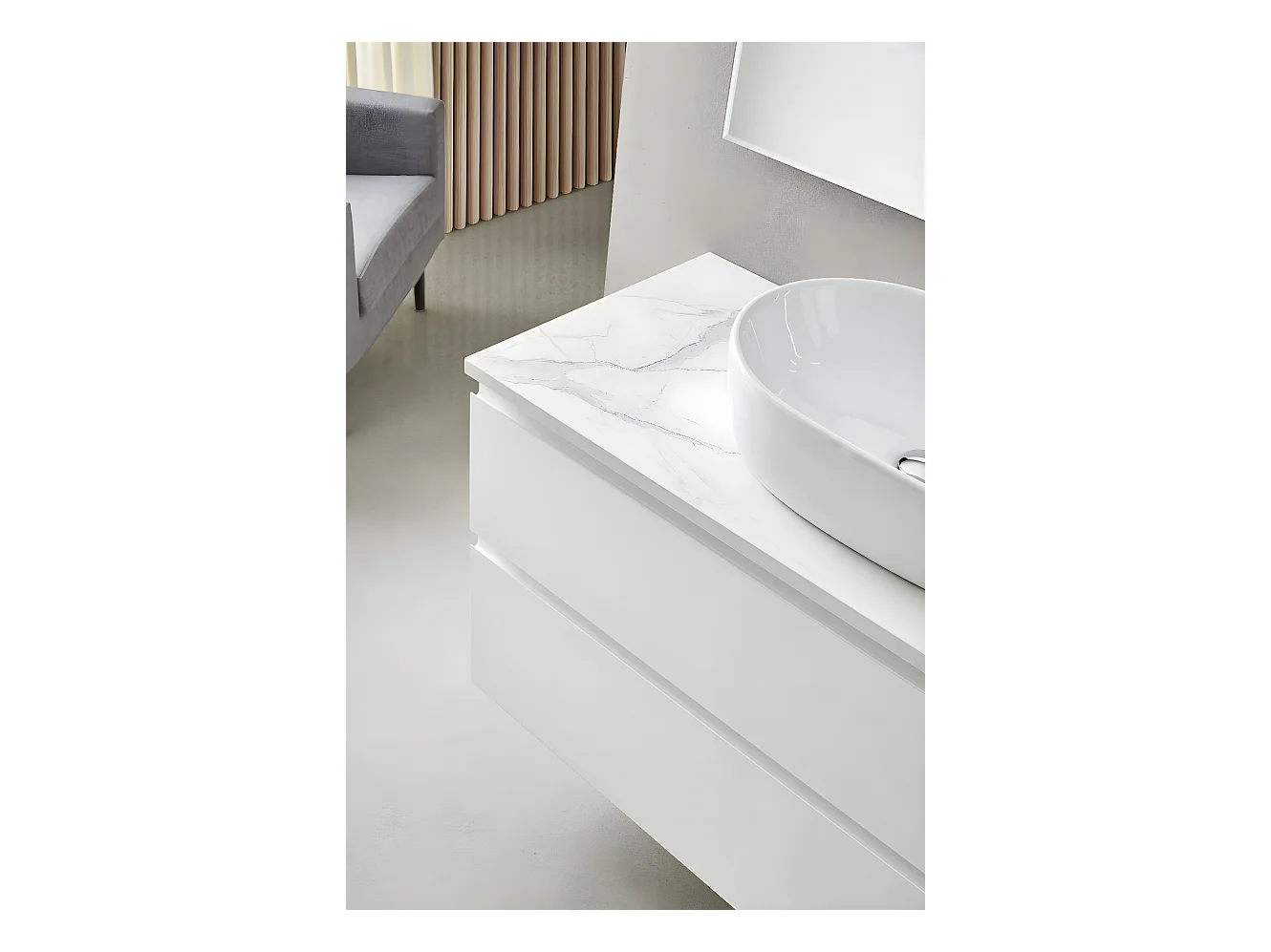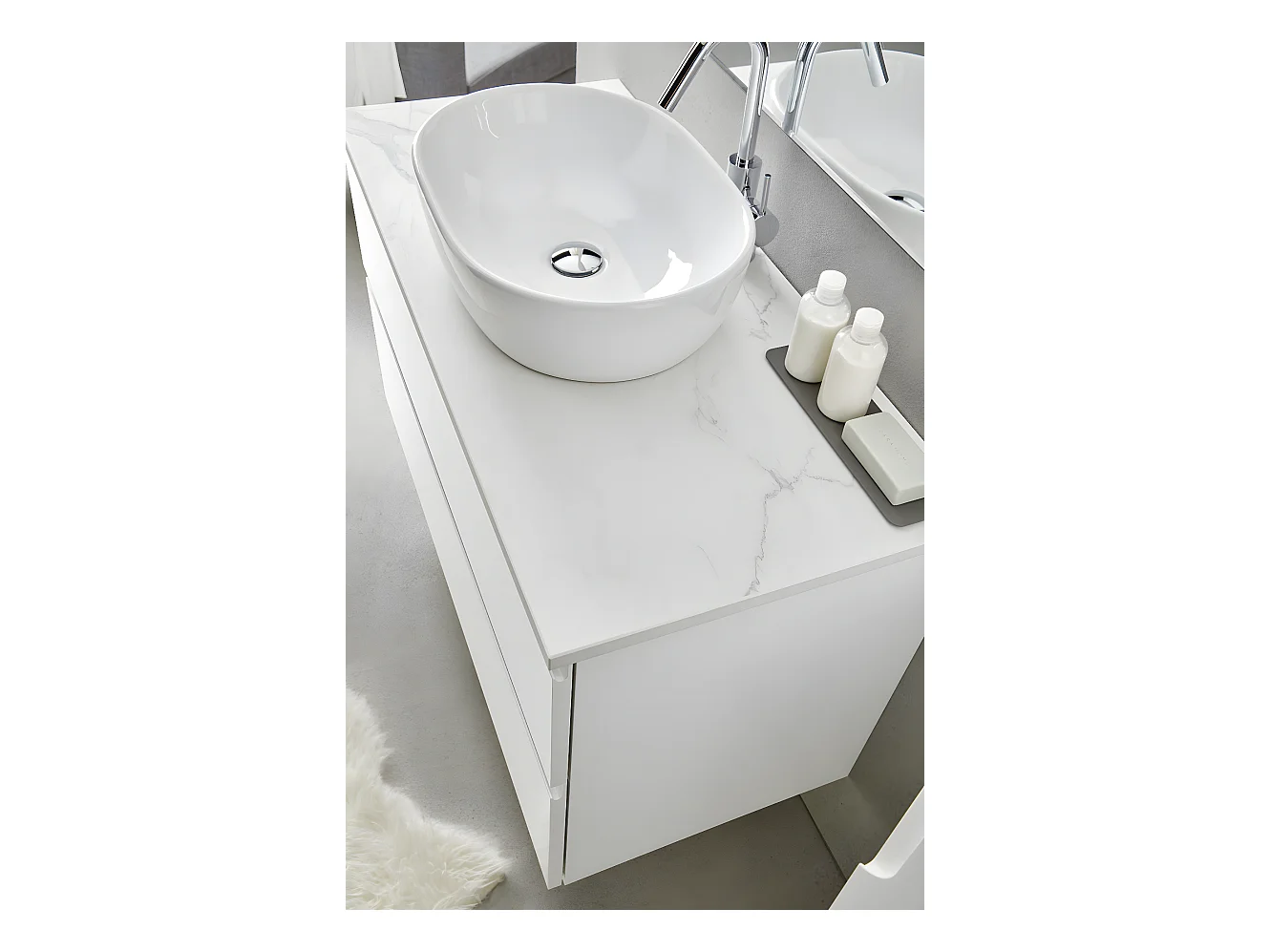Meuble de salle de bain avec 2 tiroirs suspendus avec plan Marbre Blanc + vasque à poser - Longueur 60 x Hauteur 56 x Profondeur 46 cm