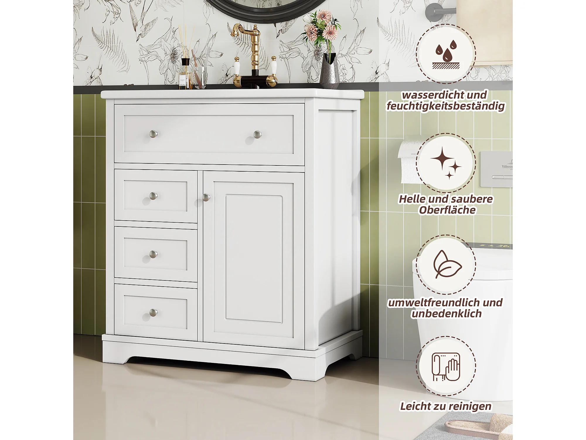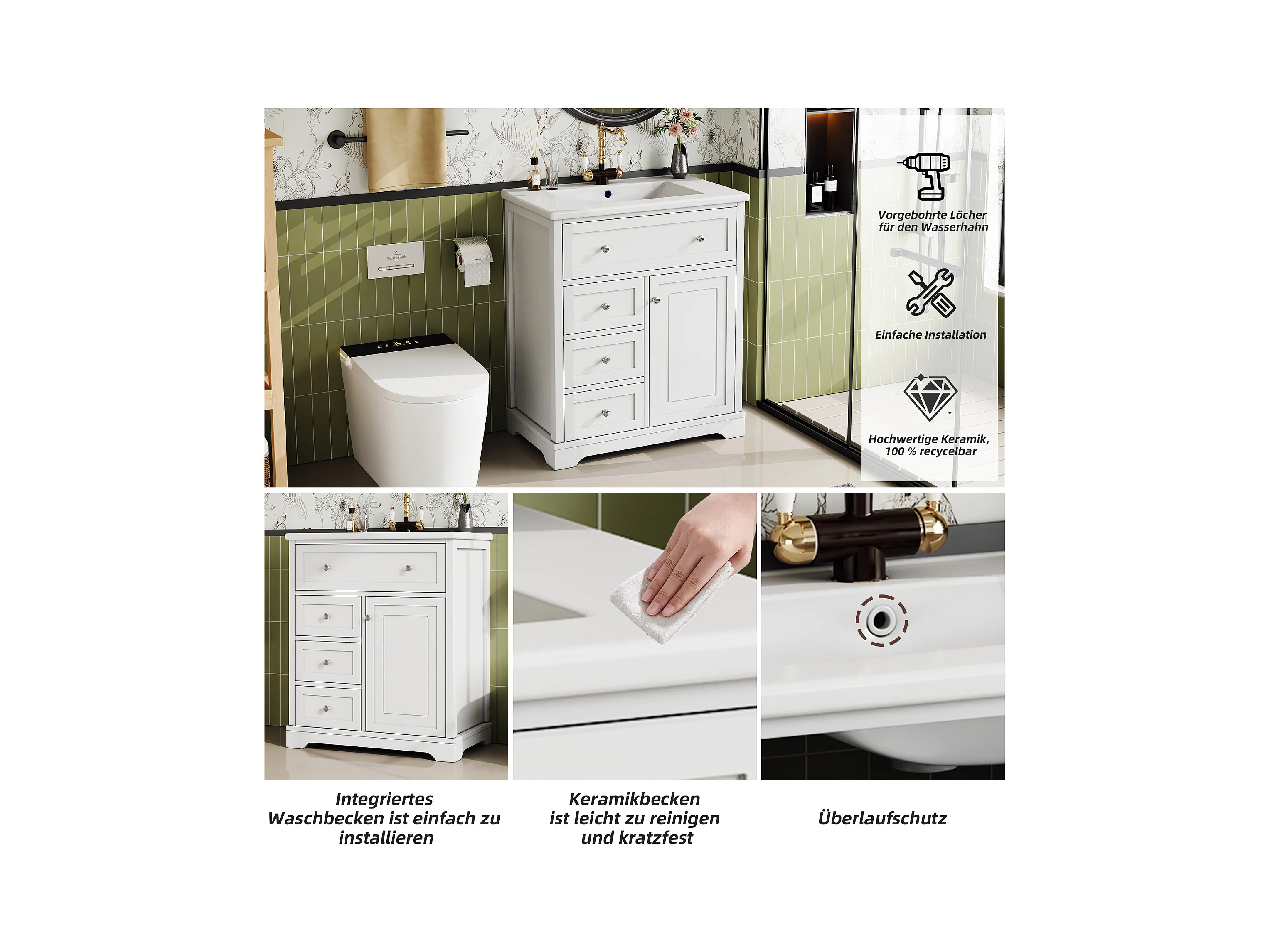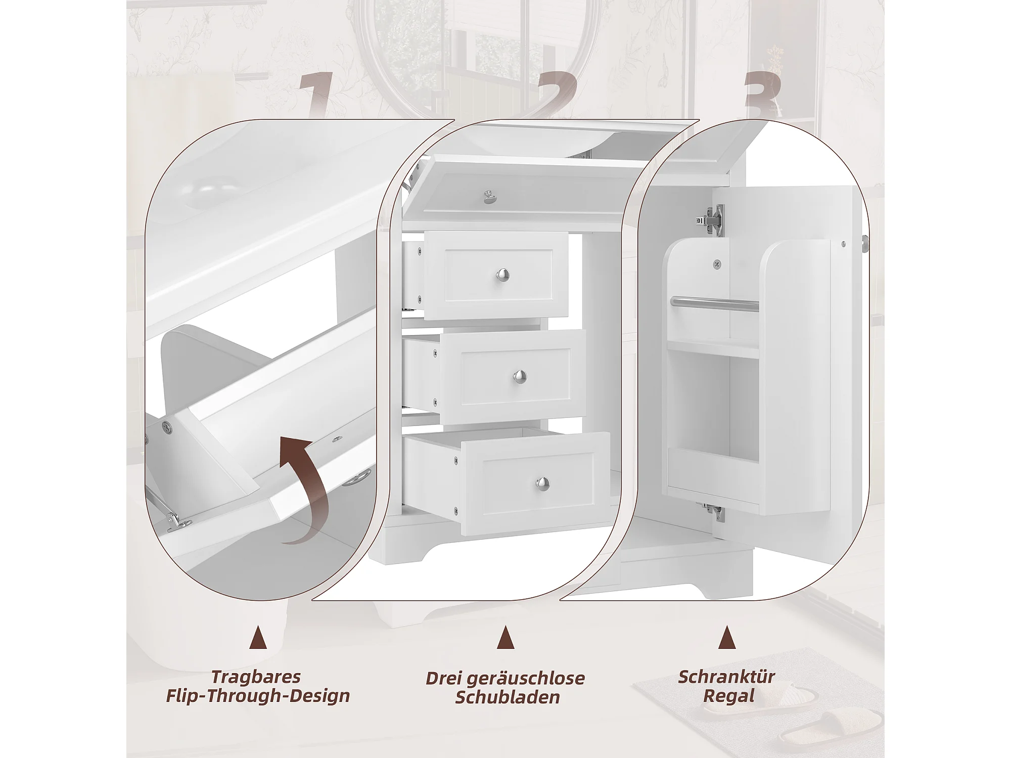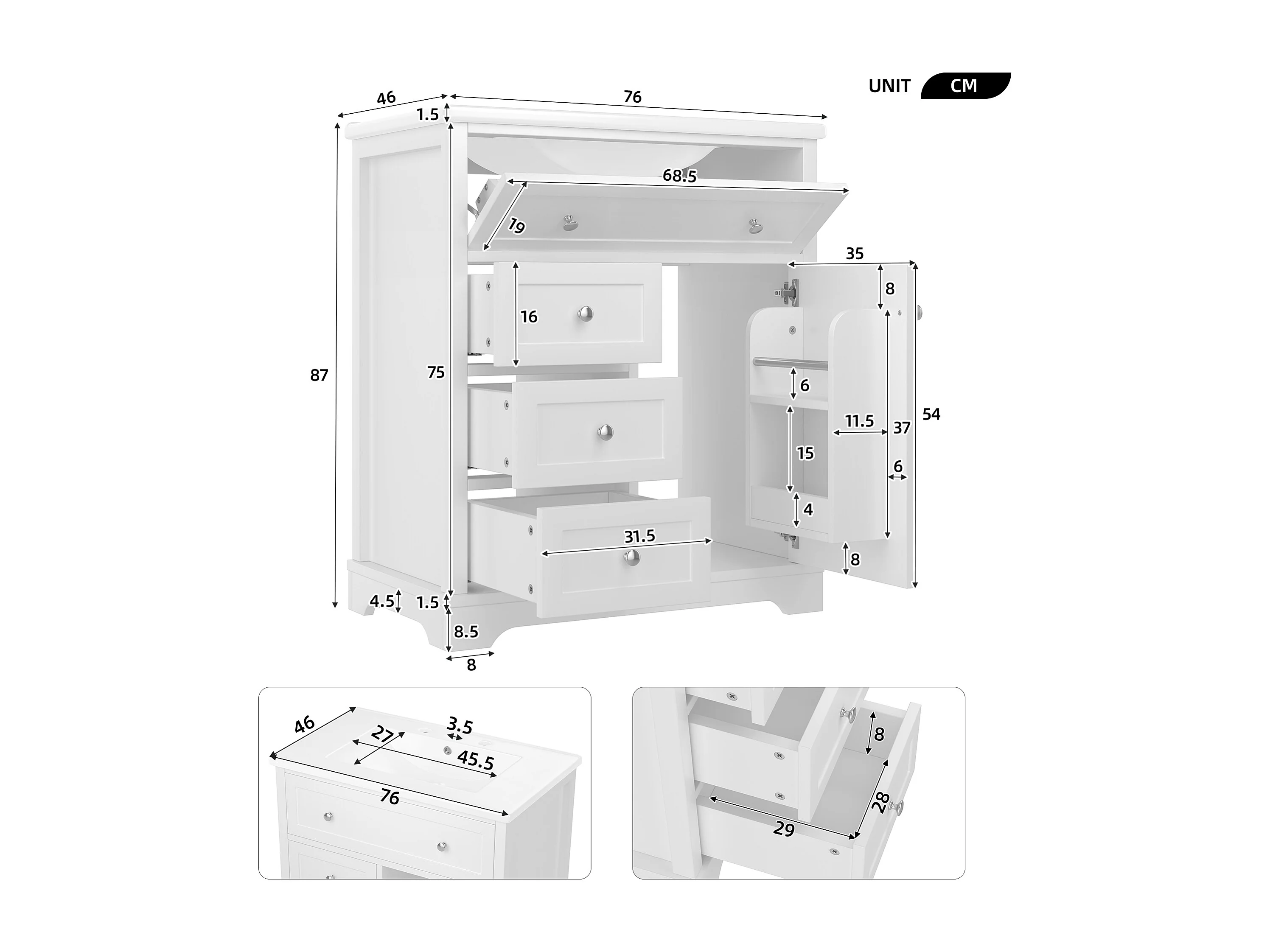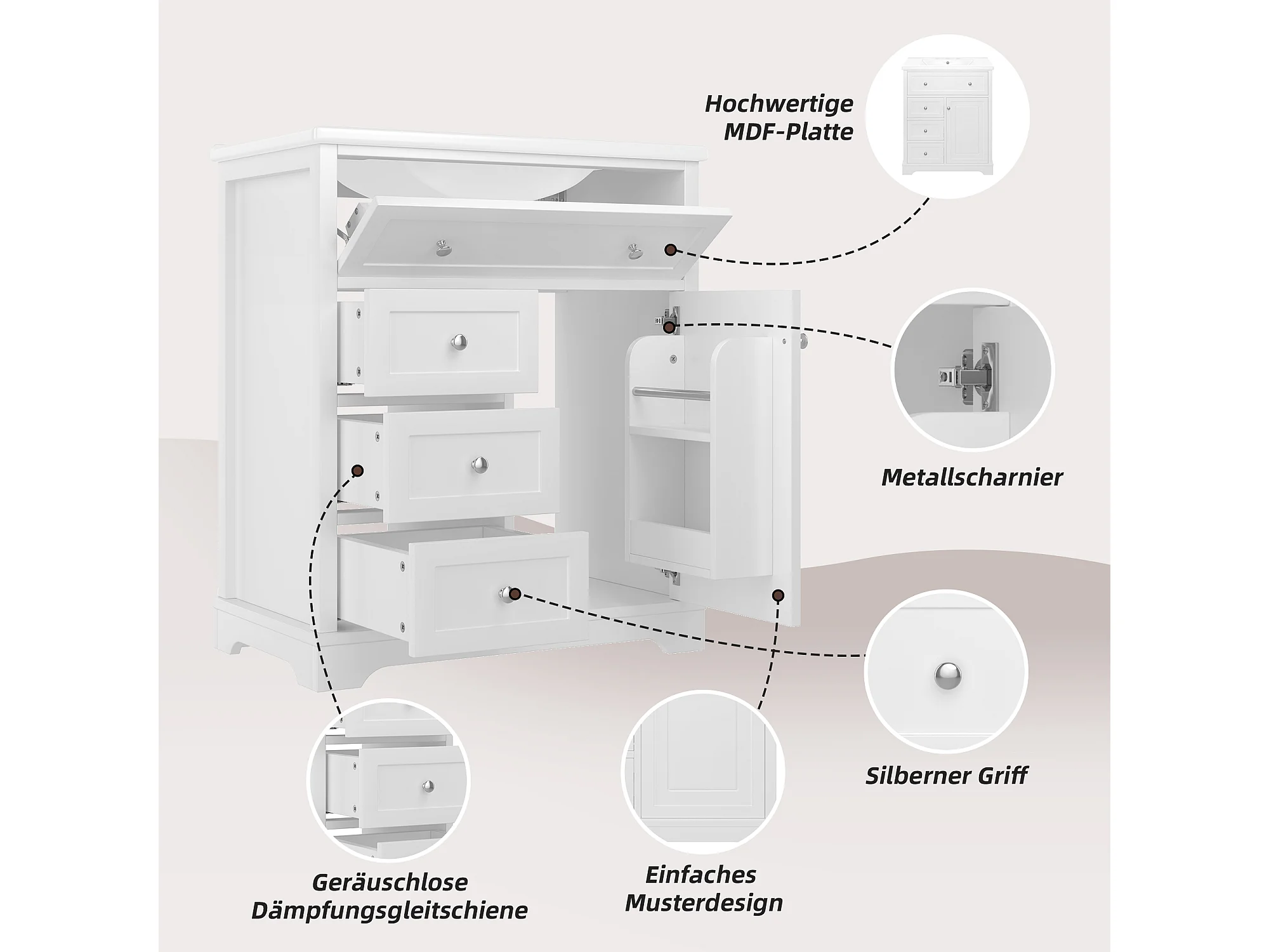 Meuble de salle de bain avec lavabo, peinture résistante à l'humidité, tiroirs à fermeture douce, étagères réglables, blanc, (76x46x87 cm)