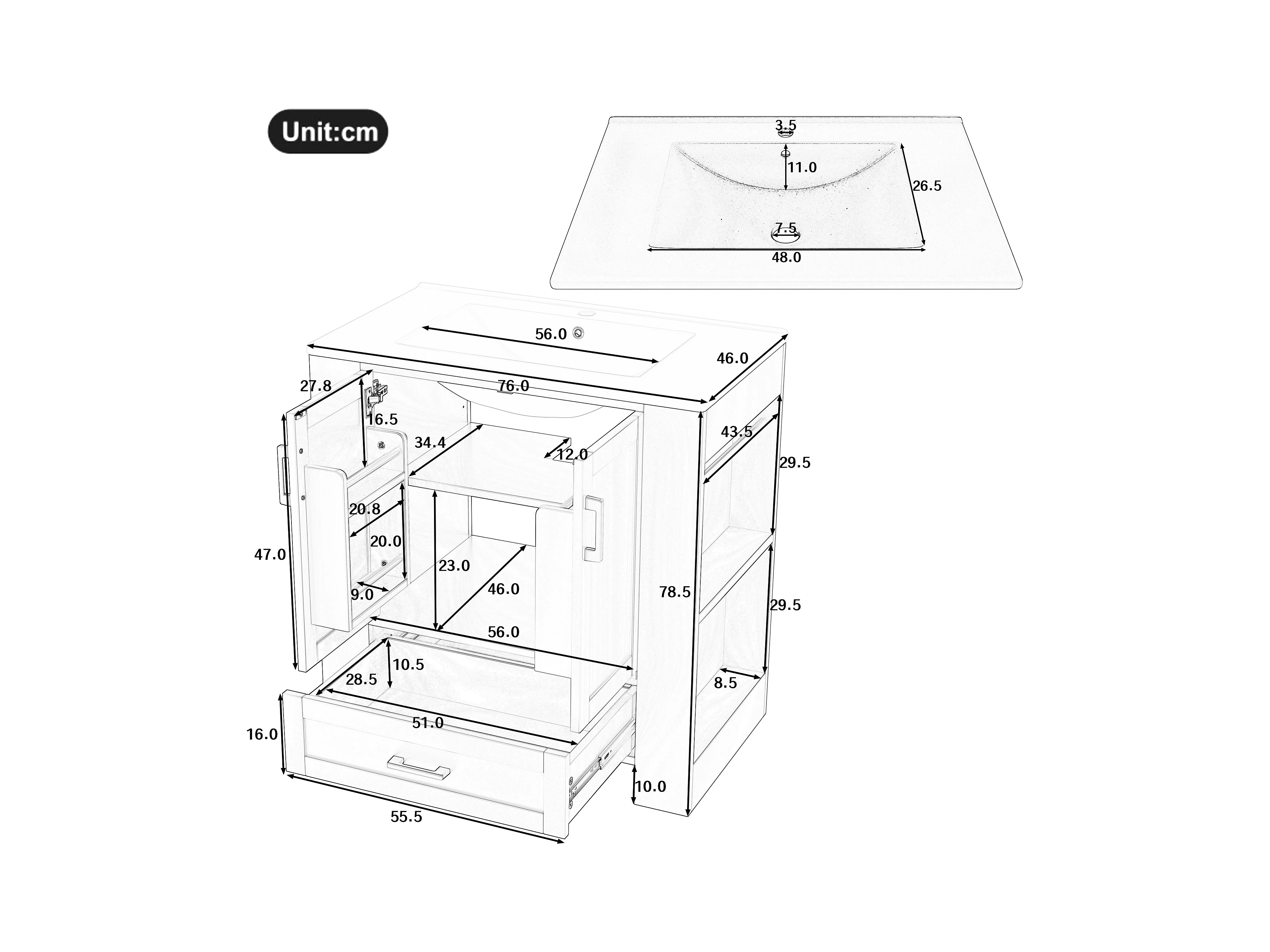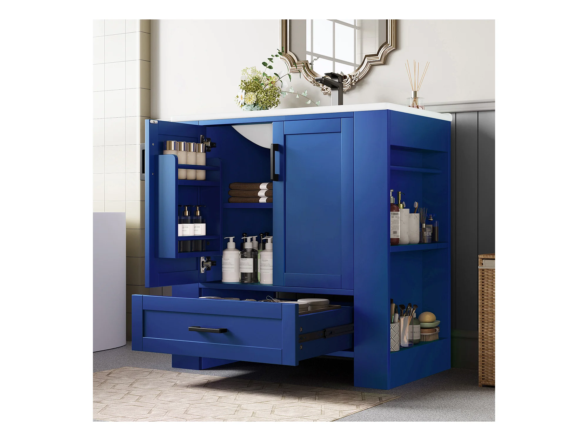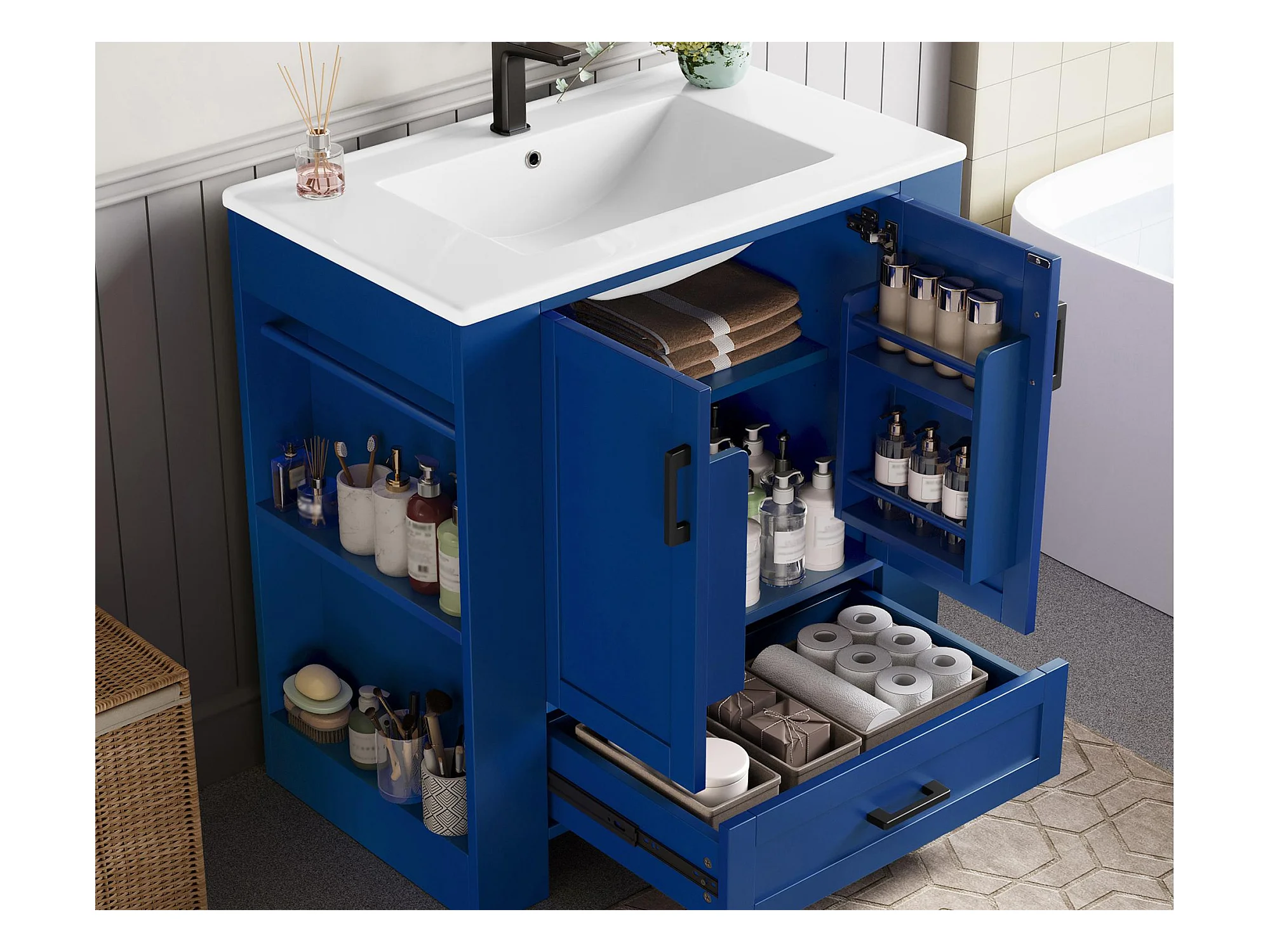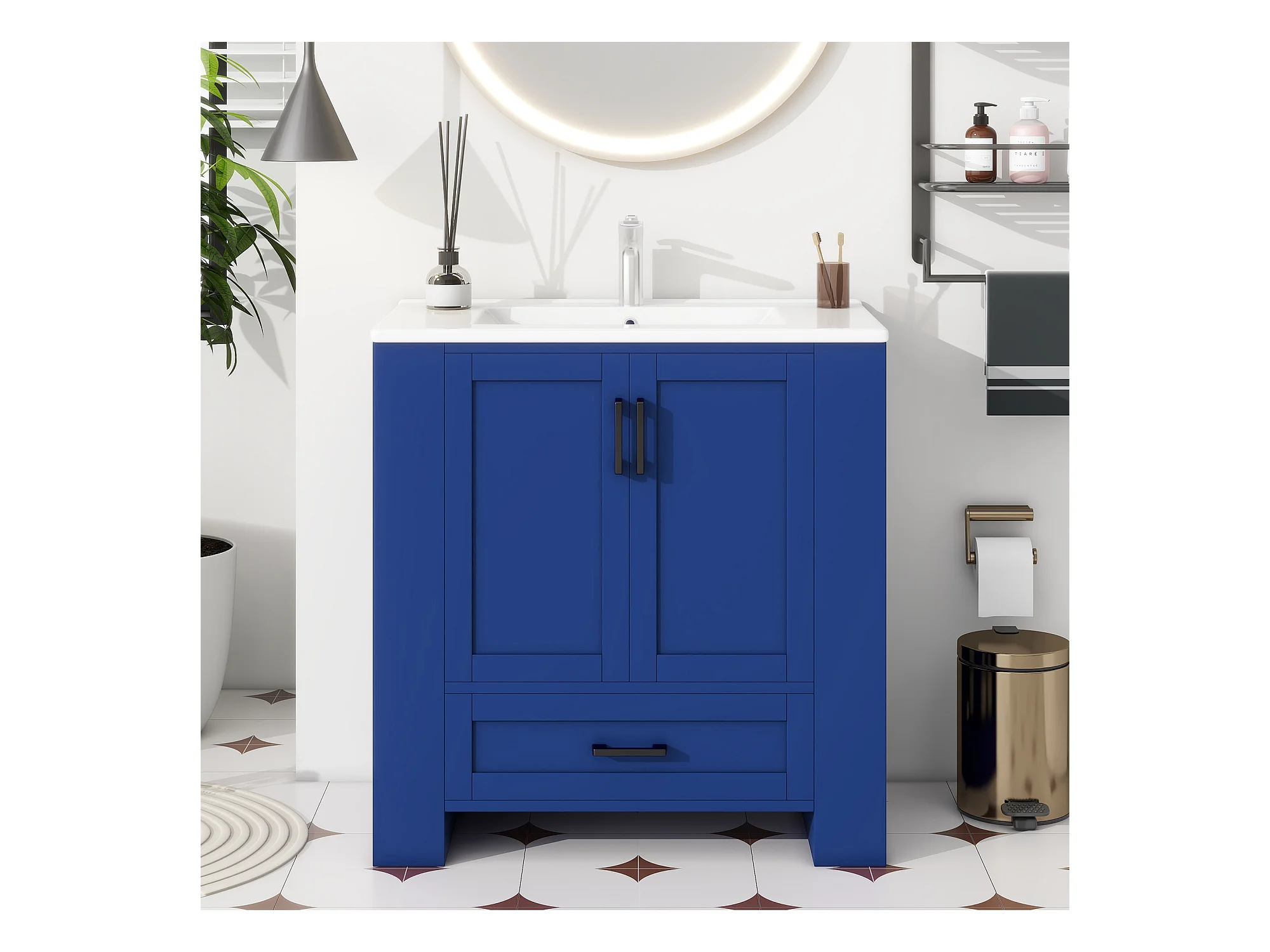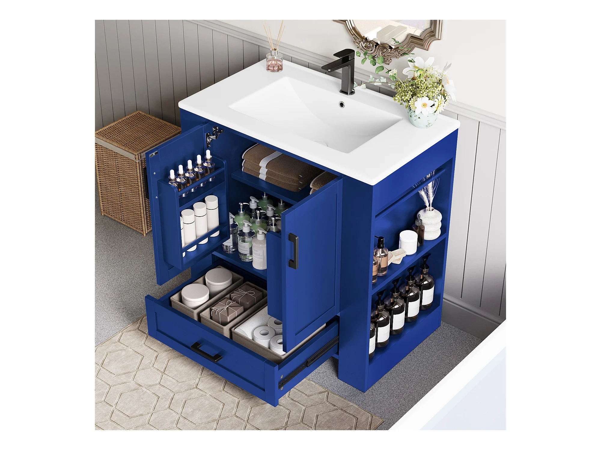 Meuble de salle de bain avec une vasque en céramique - avec 2 portes et 1 tiroir - Étagères ouvertes - bleu(robinet non inclus)