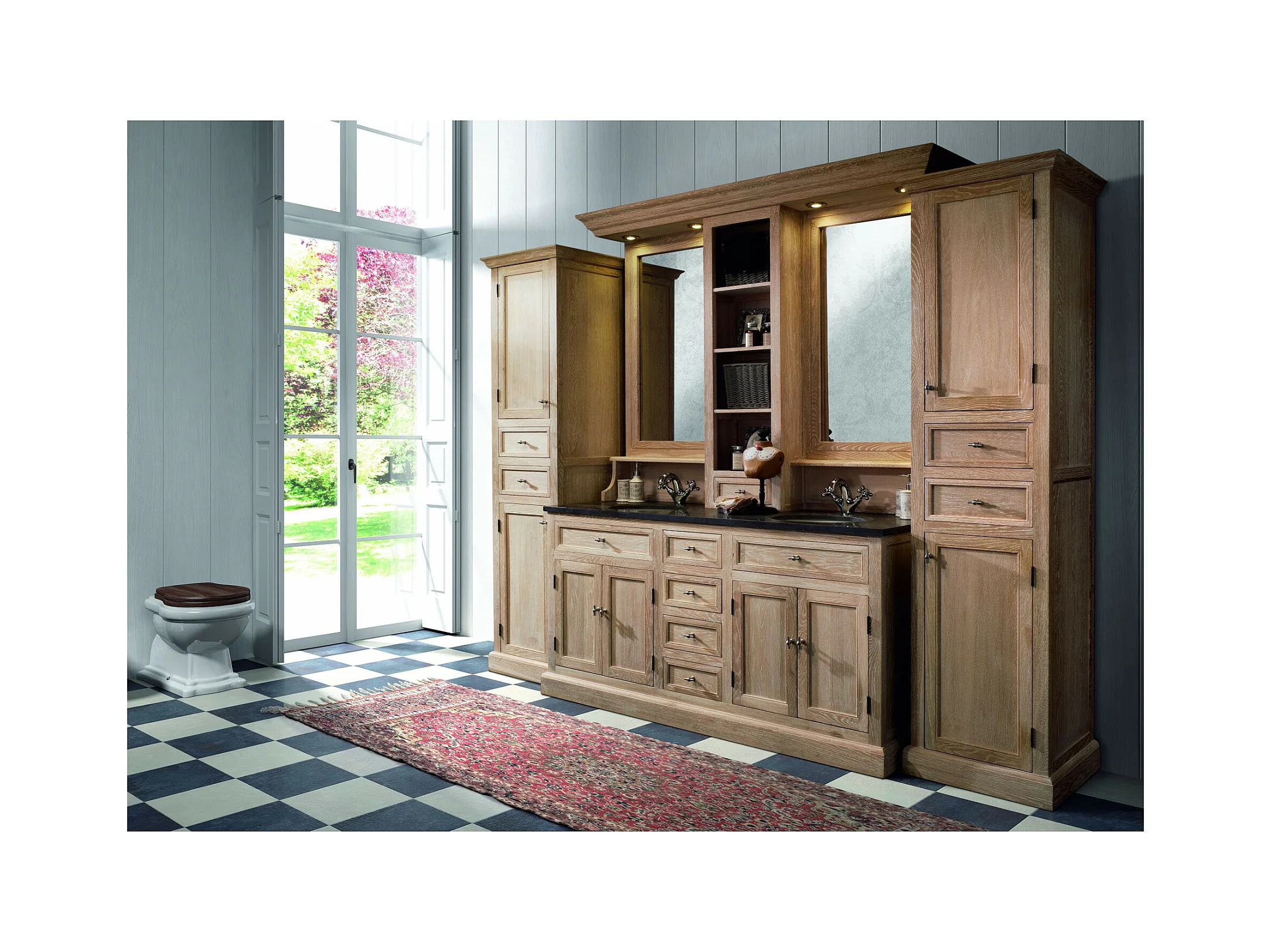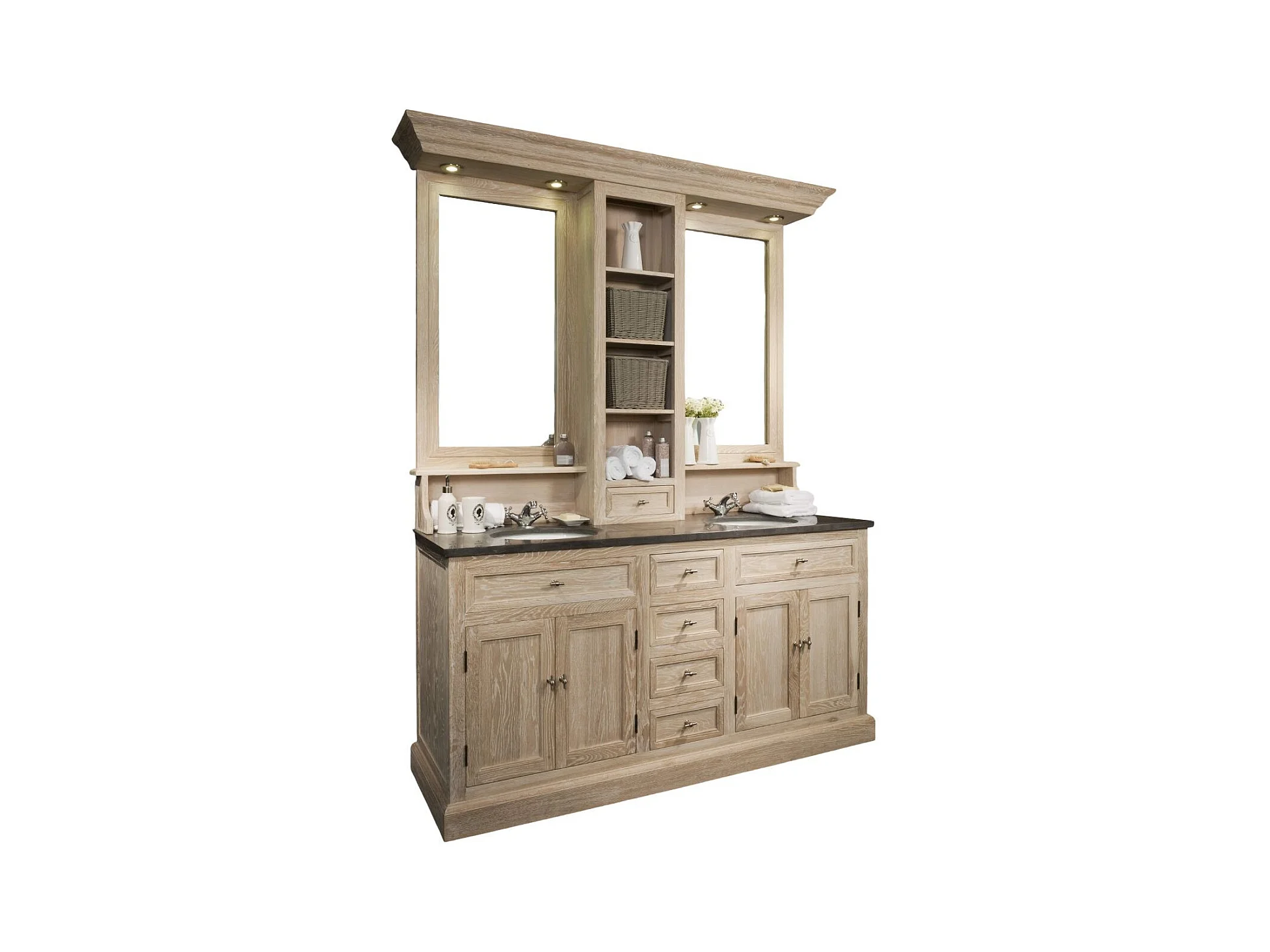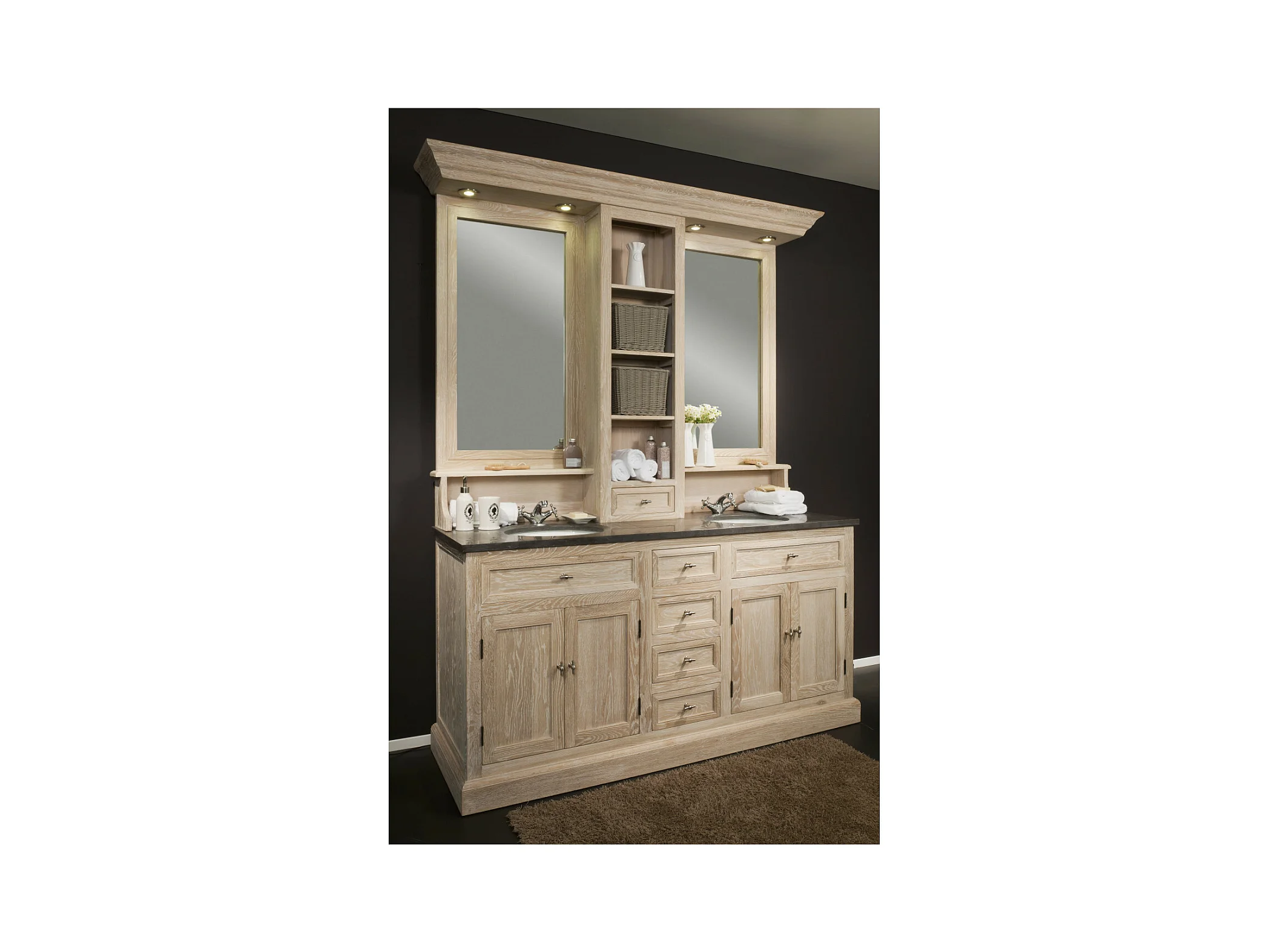 Meuble de salle de bain double vasque en chêne massif et sa crédence - VÉRONE