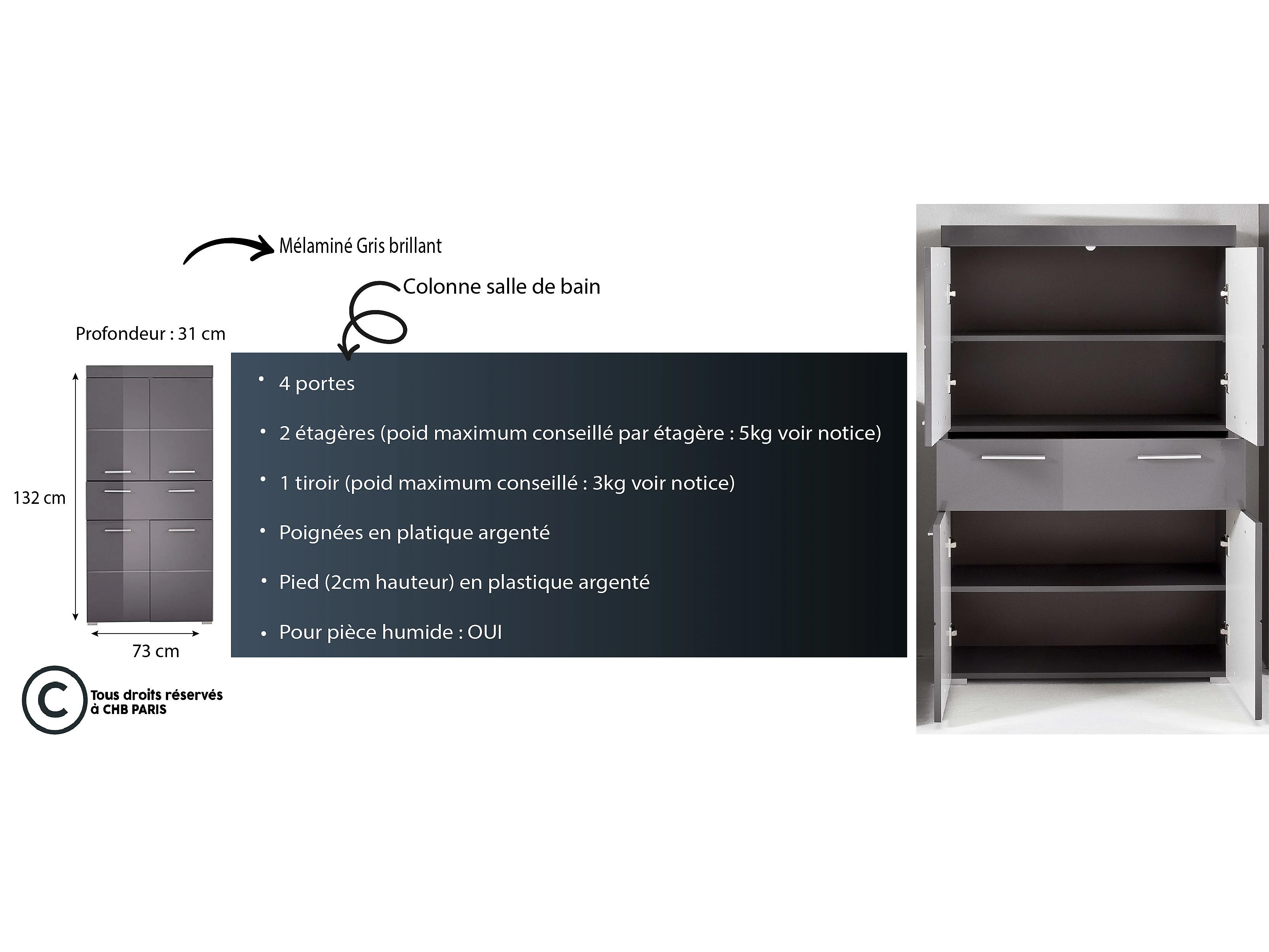 Meuble de salle de bain mélaminé - Meuble Commode. Gris. L-H-P : 73 - 132 - 31 cm