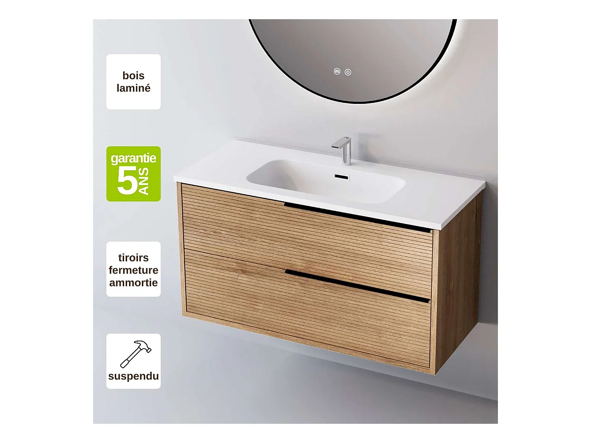Meuble Salle de Bain LISTELLO (81 cm x H54 x P45 cm), Plan Vasque Céramique WB, 2 Tiroirs Impression 3D Poignée Noir, Chêne Naturel