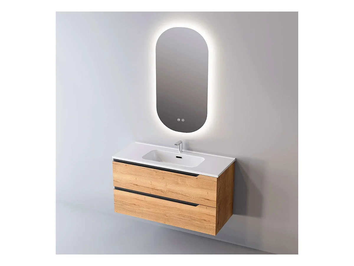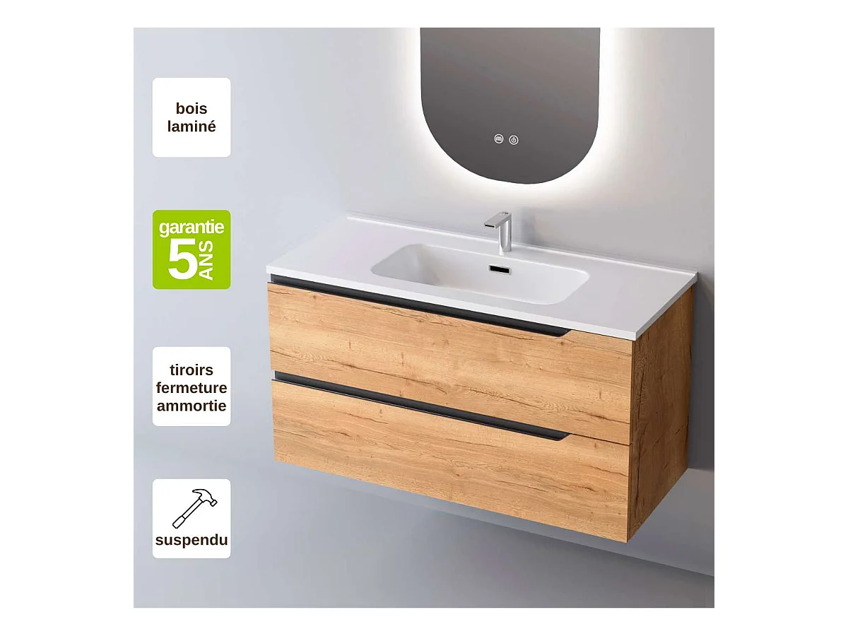 Meuble Salle de Bain DUO (101 cm x H54 x P45 cm), Plan Vasque Céramique WB, 2 Tiroirs, Chêne Clair