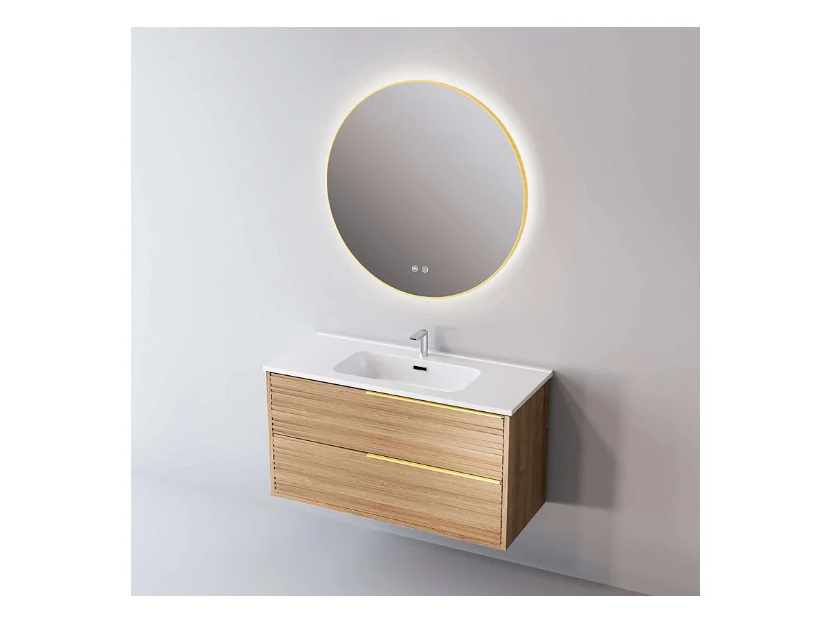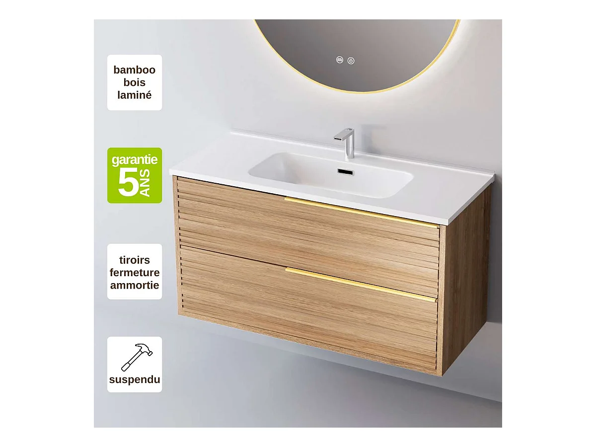 Meuble Salle de Bain BAMBOO (101 cm x H54 x P45 cm), Plan Vasque Céramique WB, 2 Tiroirs Poignée Or, Chêne Naturel