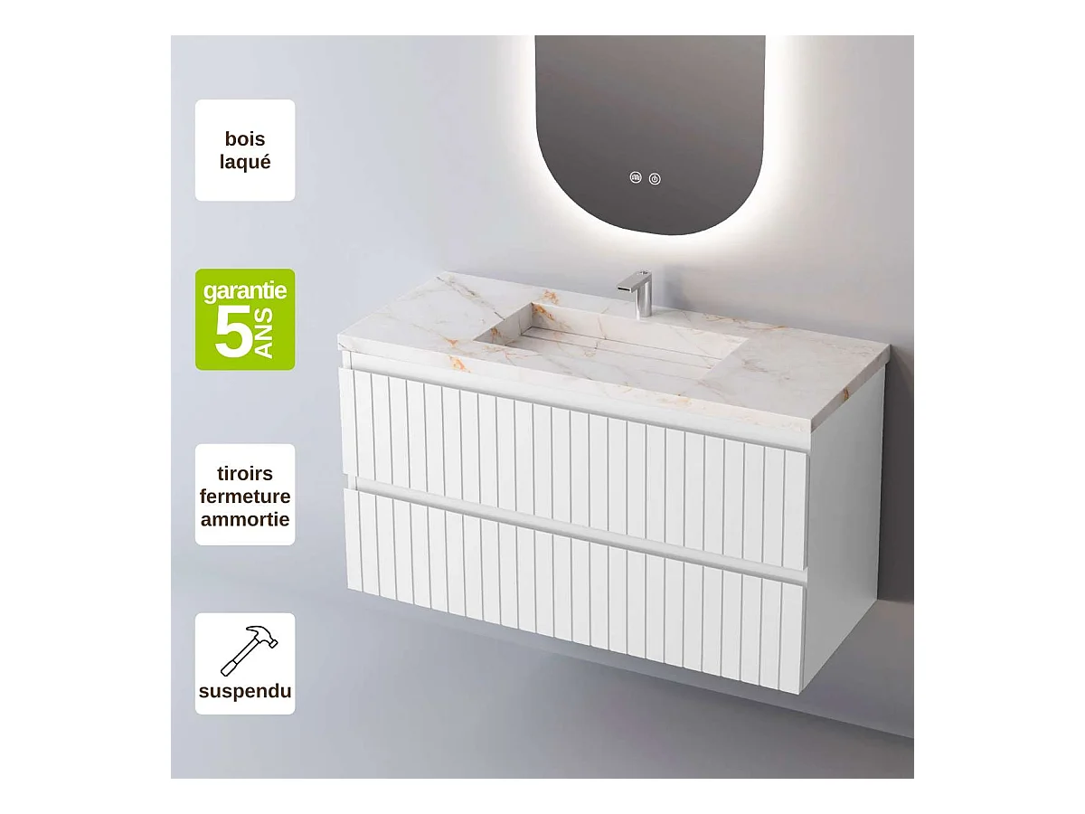 Meuble Salle de Bain GLOW (61 cm x H54 x P45 cm), Plan Vasque Grès Cérame BS, 2 Tiroirs, Laqué Blanc Mat