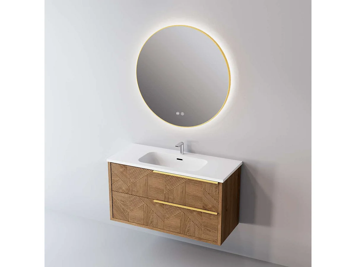 Meuble Salle de Bain REEL (101 cm x H54 x P45 cm), Plan Vasque Solide Surface, 2 Tiroirs Impression 3D Poignée Or, Chêne Moyen
