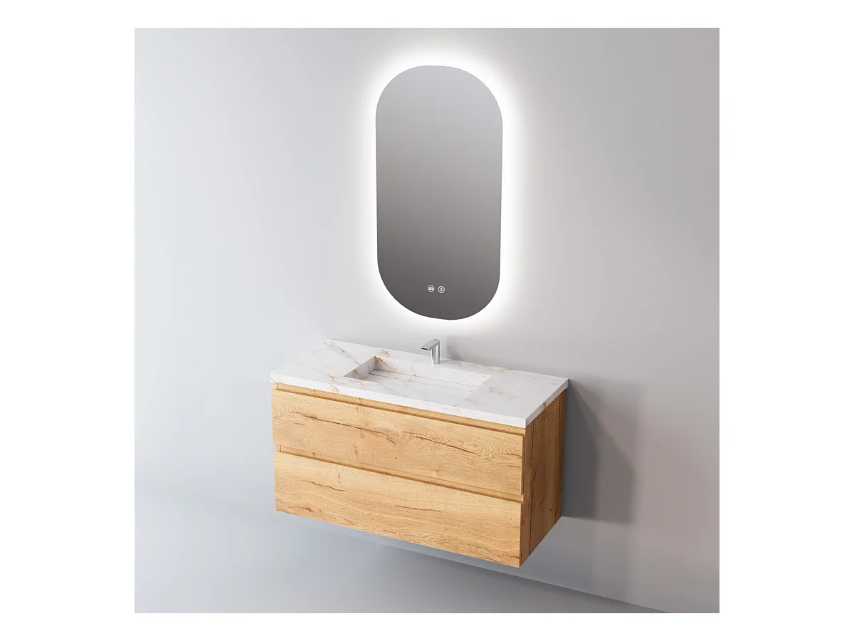 Meuble Salle de Bain STEP (101 cm x H54 x P45 cm), Plan Vasque Solide Surface, 2 Tiroirs, Finition Chêne Clair