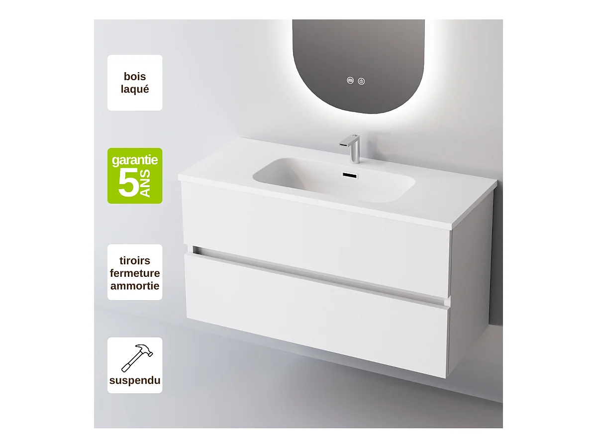 Meuble Salle de Bain ANCONA (61 cm x H54 x P45 cm), Plan Vasque Solide Surface, 2 Tiroirs, Blanc Brillant