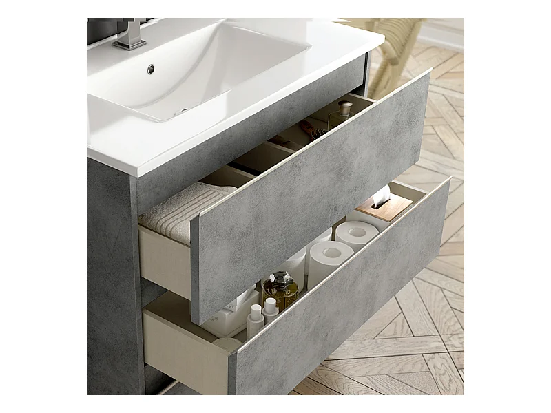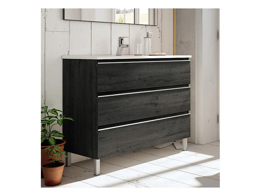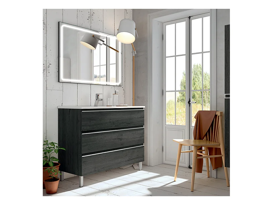 Meuble de salle de bain simple vasque - 3 tiroirs - PALMA et miroir Led VELDI - ebony (bois noir) - 100cm