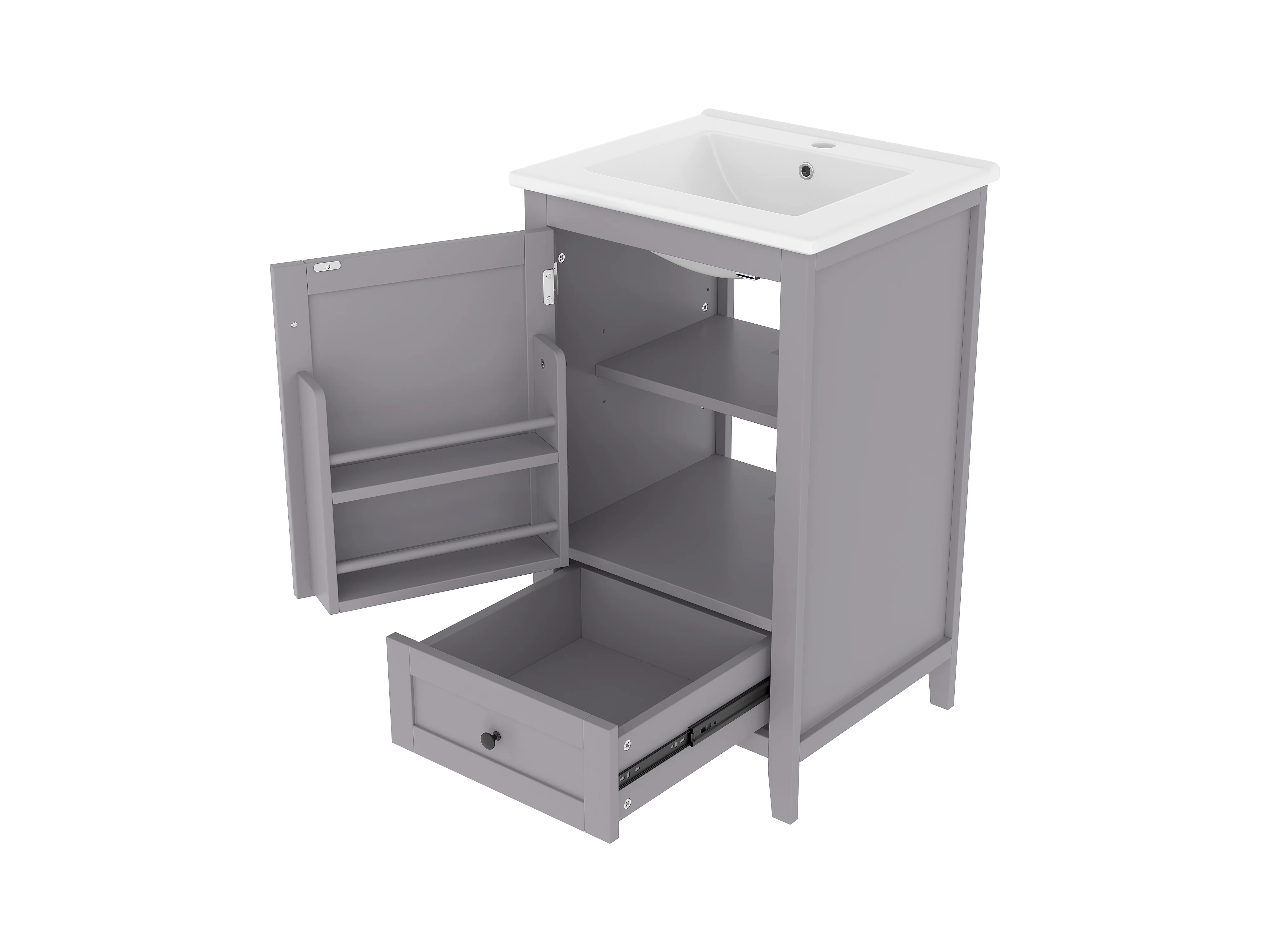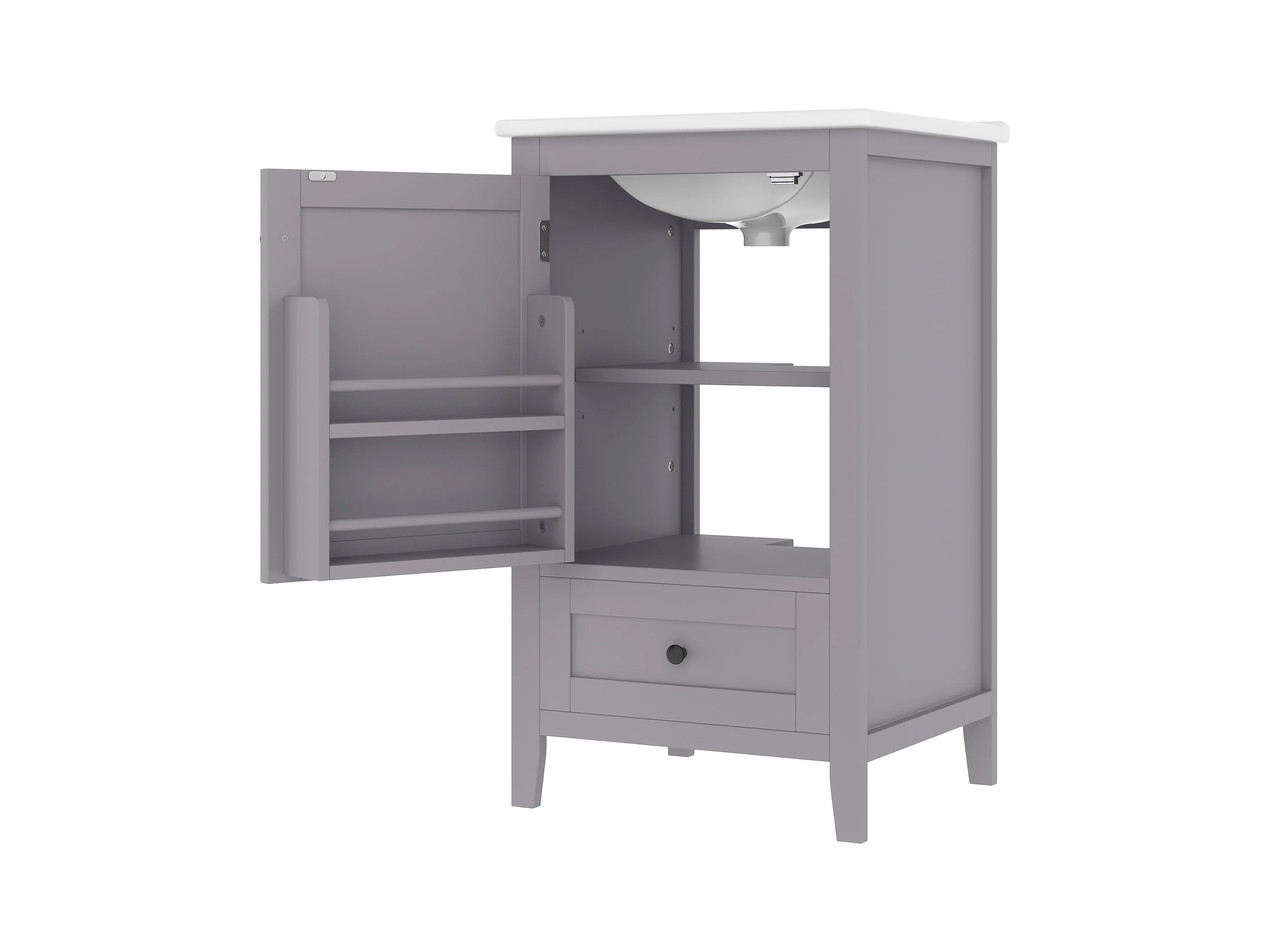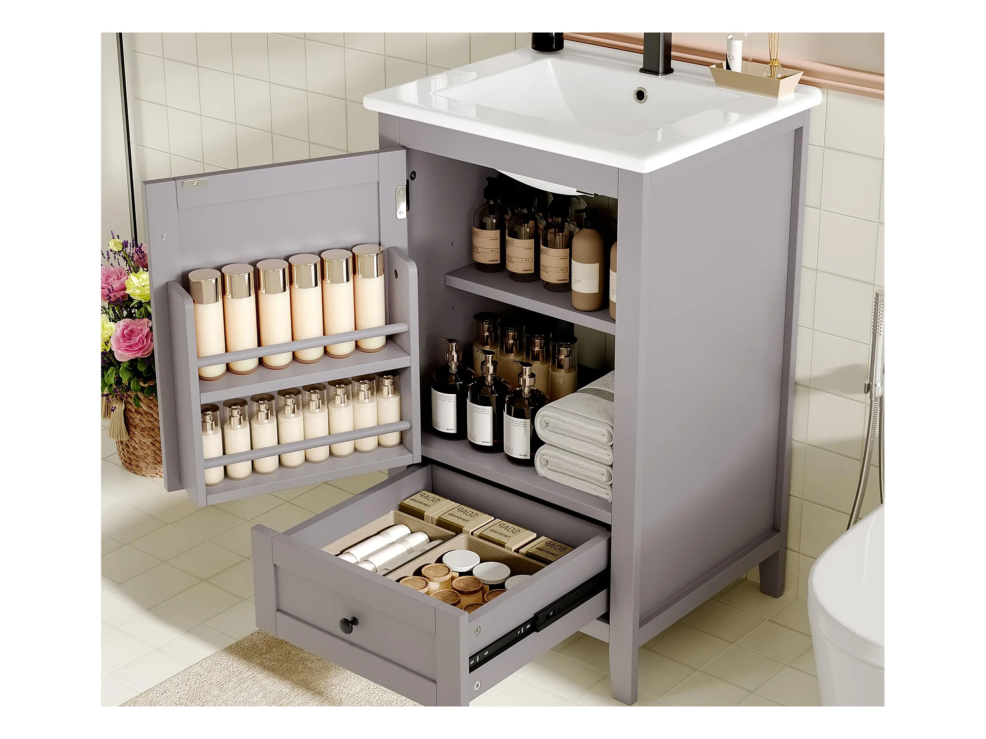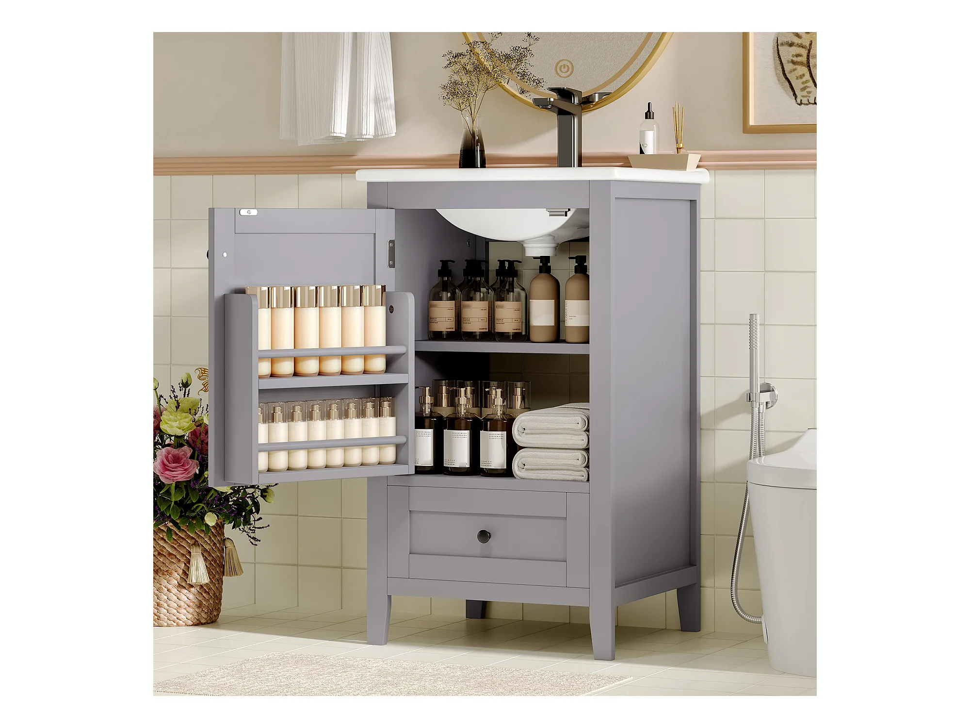 Meuble de salle de bain sur pied - avec une vasque en céramique - 1 porte et 1 tiroir - Gris(robinet non inclus)