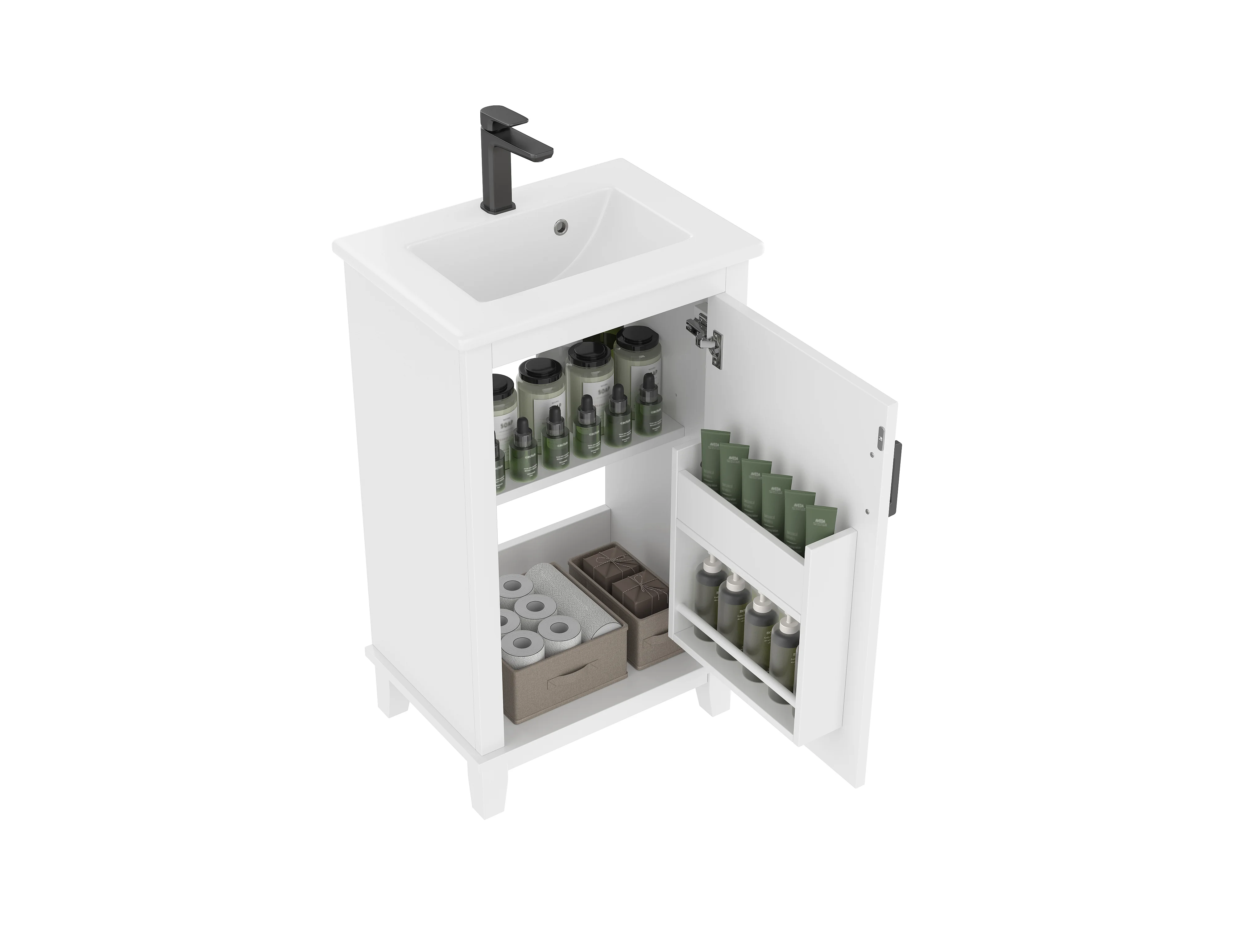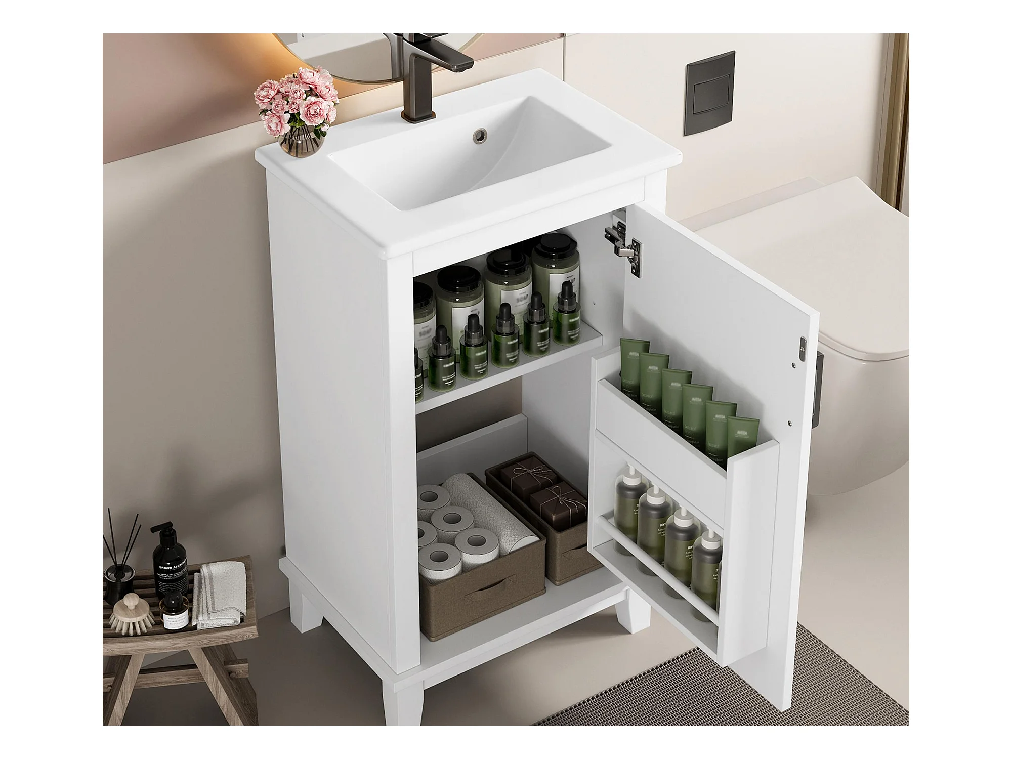 Meuble de salle de bain sur pied - avec une vasque en céramique - 1 porte - étagères réglables - Blanc(robinet non inclus)