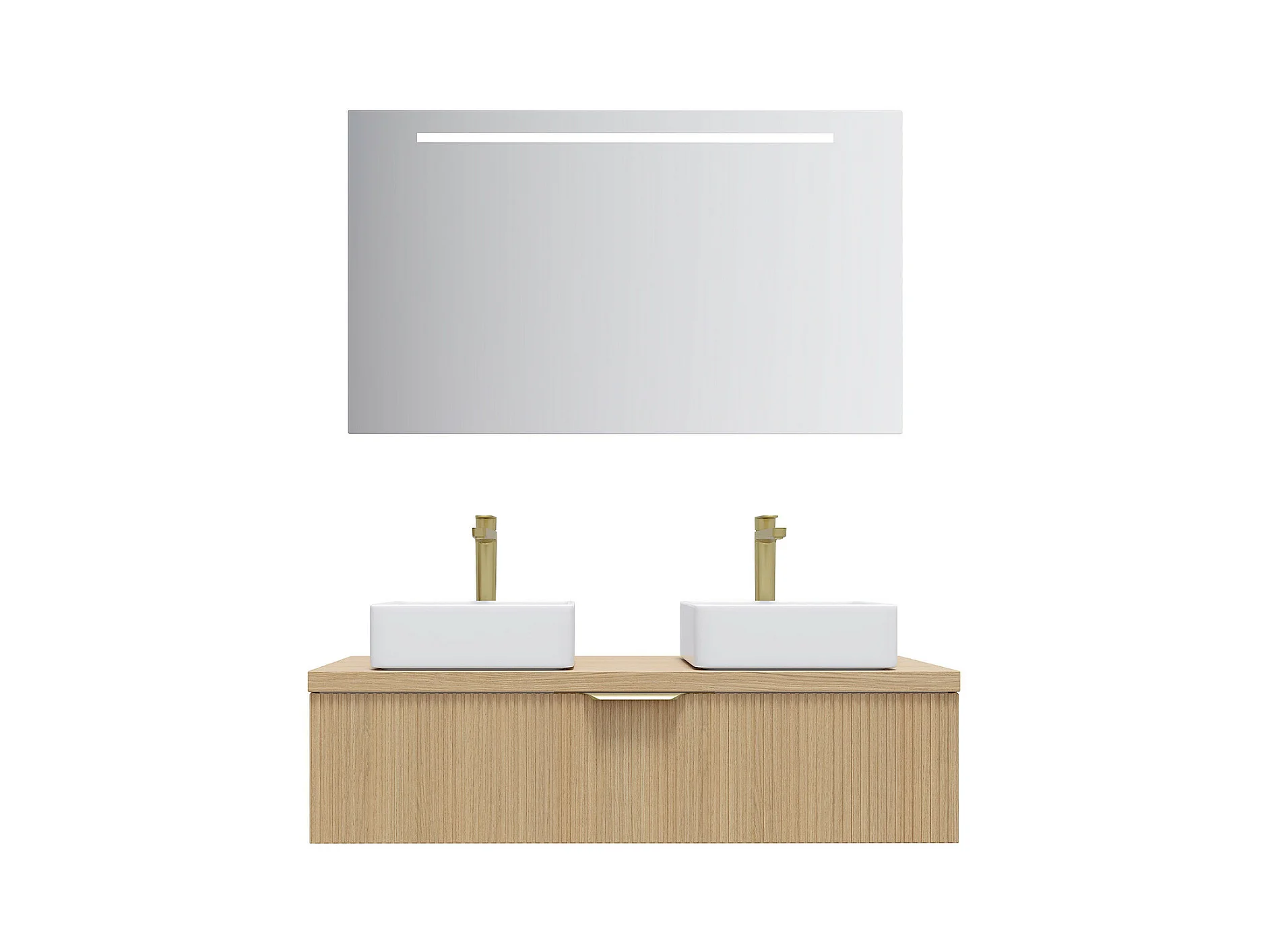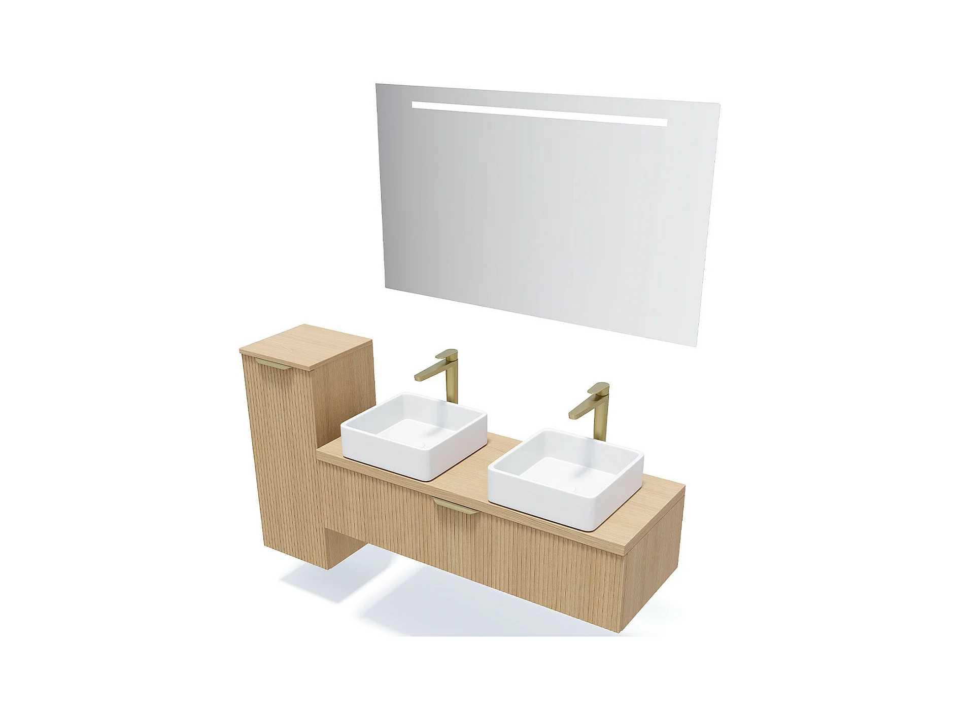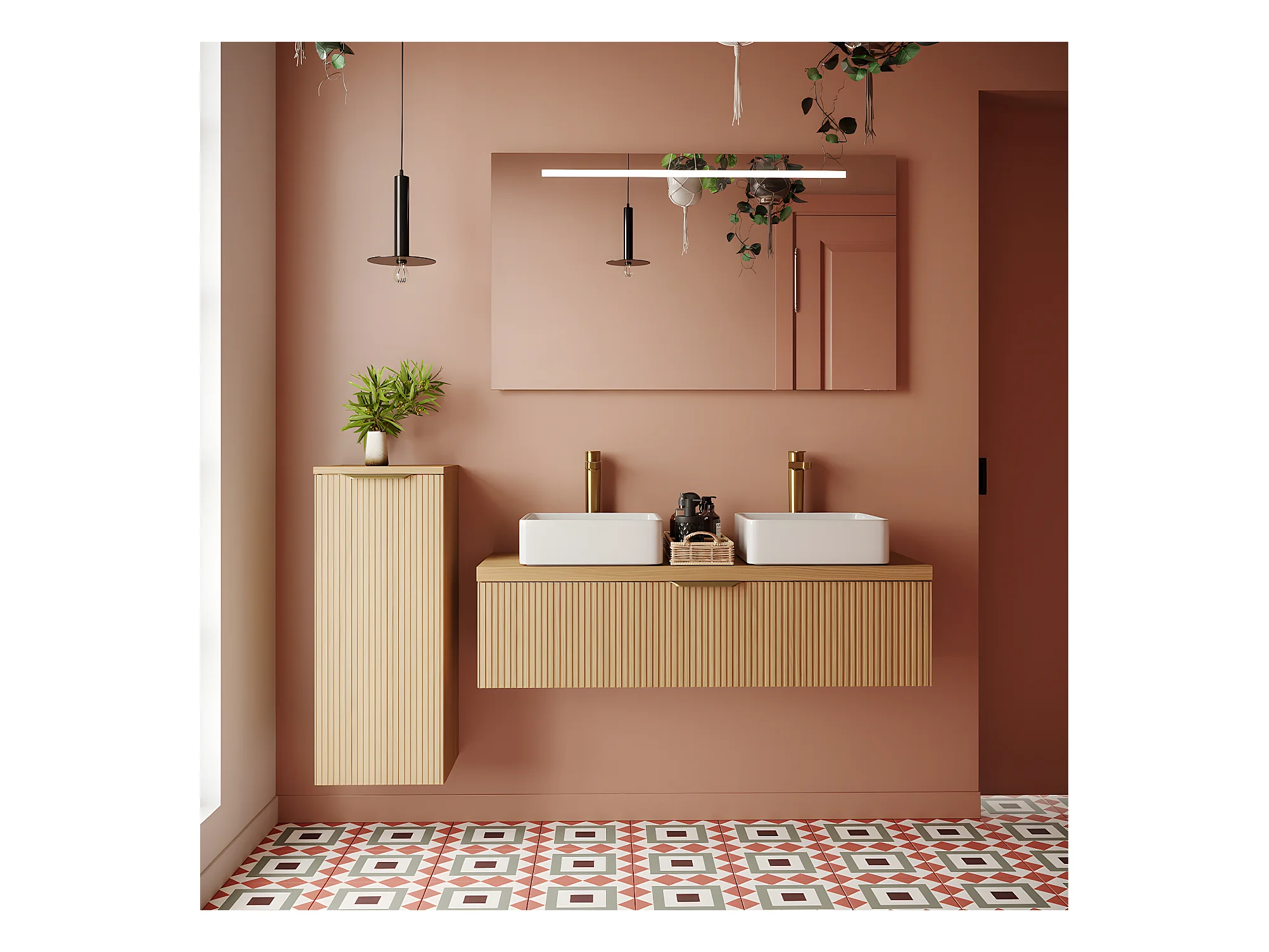 Meuble de salle de bain suspendu 2 vasques à poser 120cm 1 tiroir Chêne cannelé + miroir - Venice