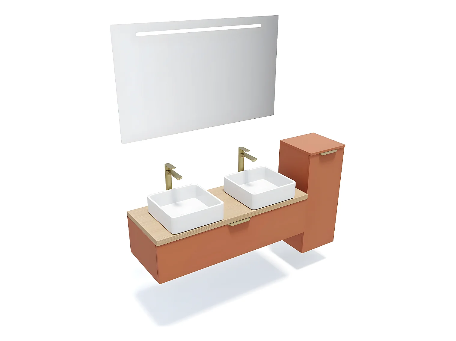 Meuble de salle de bain suspendu 2 vasques à poser 120cm 1 tiroir Terracotta + miroir + colonne ouverture droite - Venice
