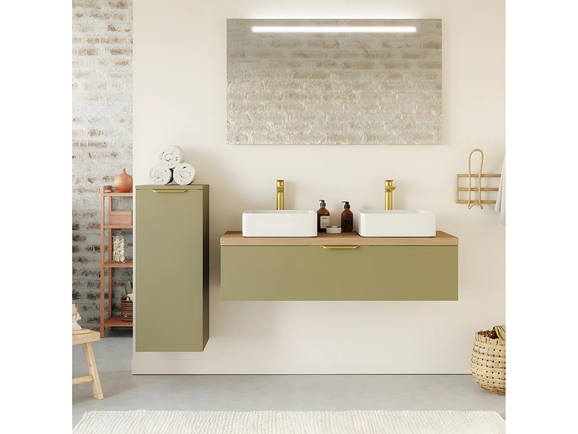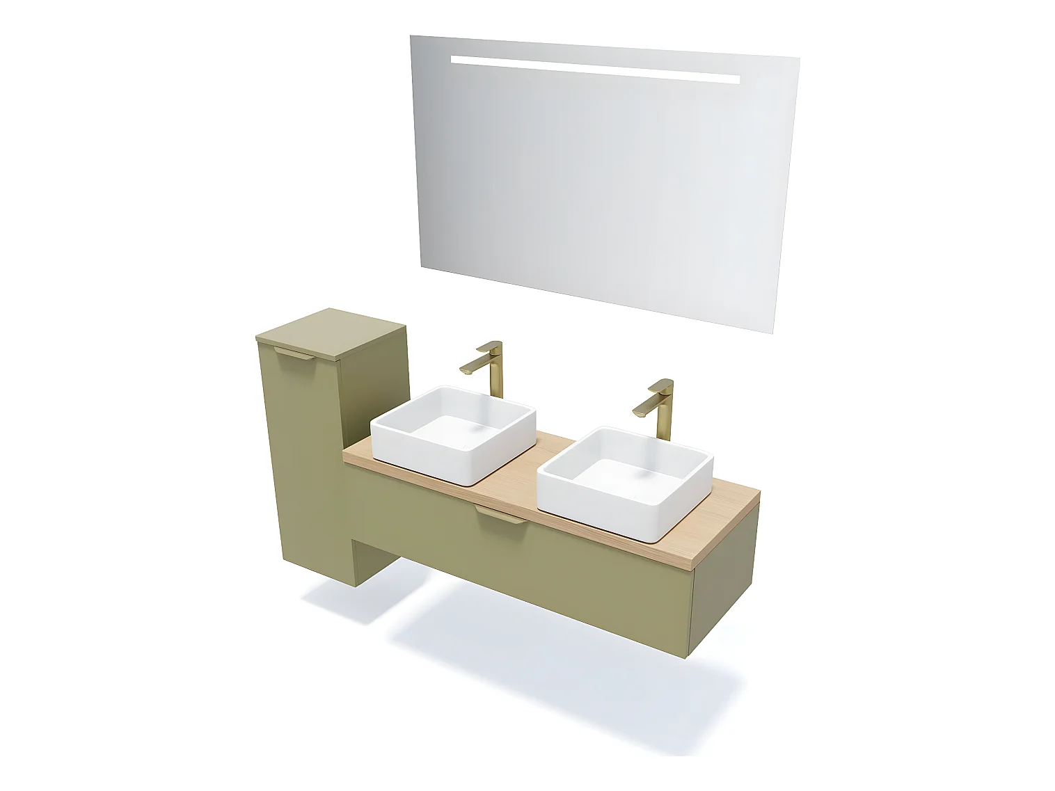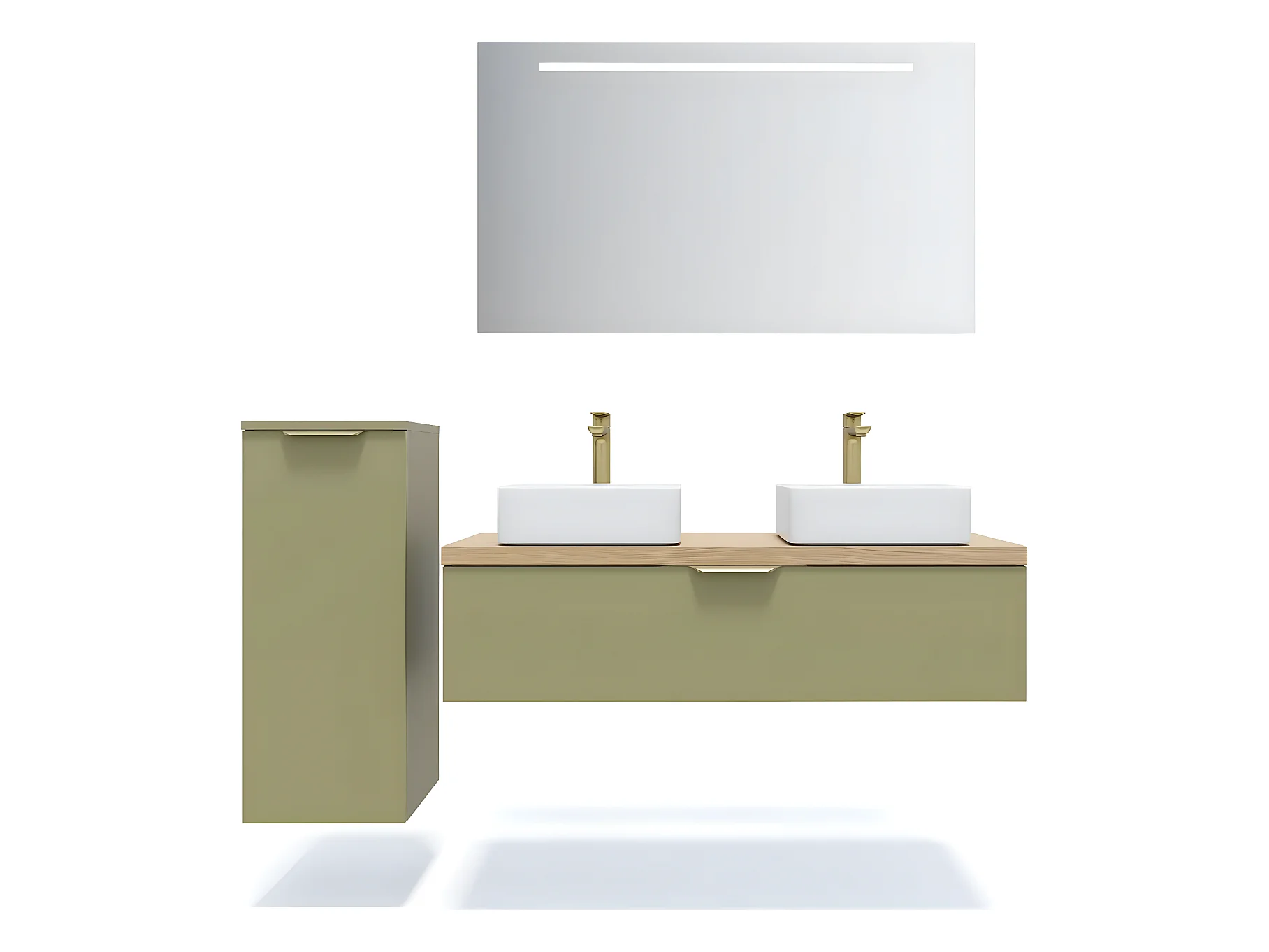 Meuble de salle de bain suspendu 2 vasques à poser 120cm 1 tiroir Vert olive + miroir + colonne ouverture gauche - Venice