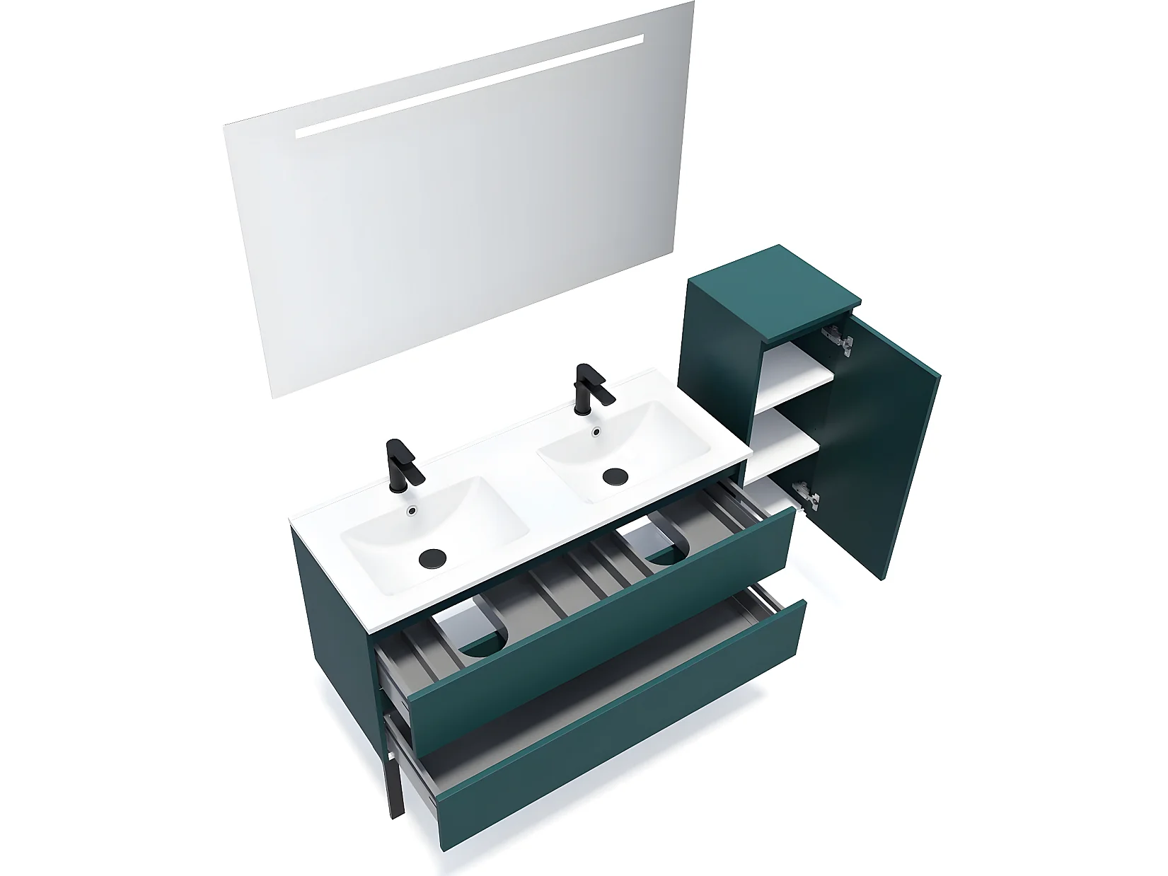 Meuble de salle de bain suspendu 2 vasques à poser 120cm 2 tiroirs Bleu + miroir + colonne ouverture droite - Hudson
