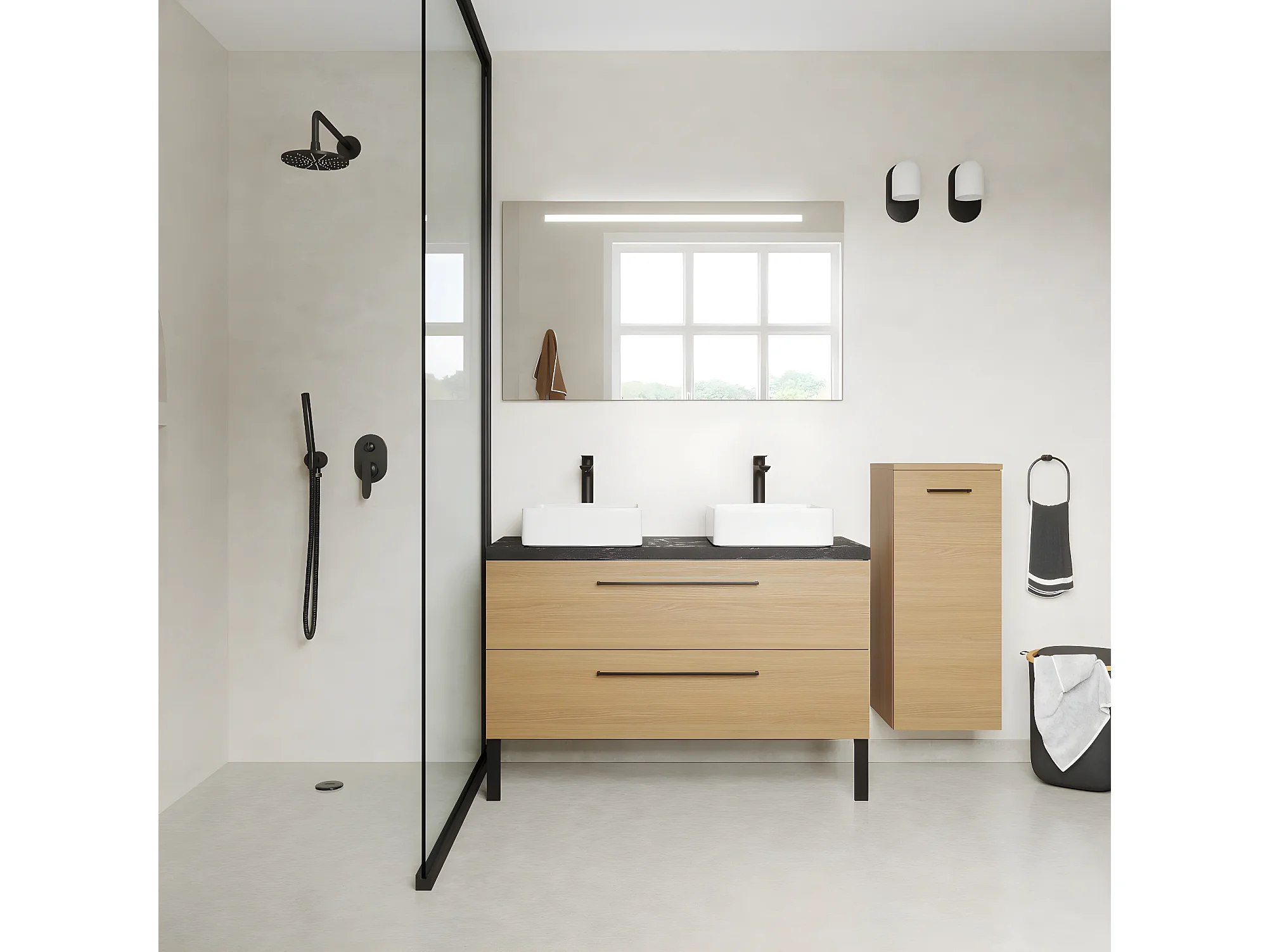 Meuble de salle de bain suspendu 2 vasques à poser 120cm 2 tiroirs Chêne clair + miroir + colonne ouverture droite - Glasgow
