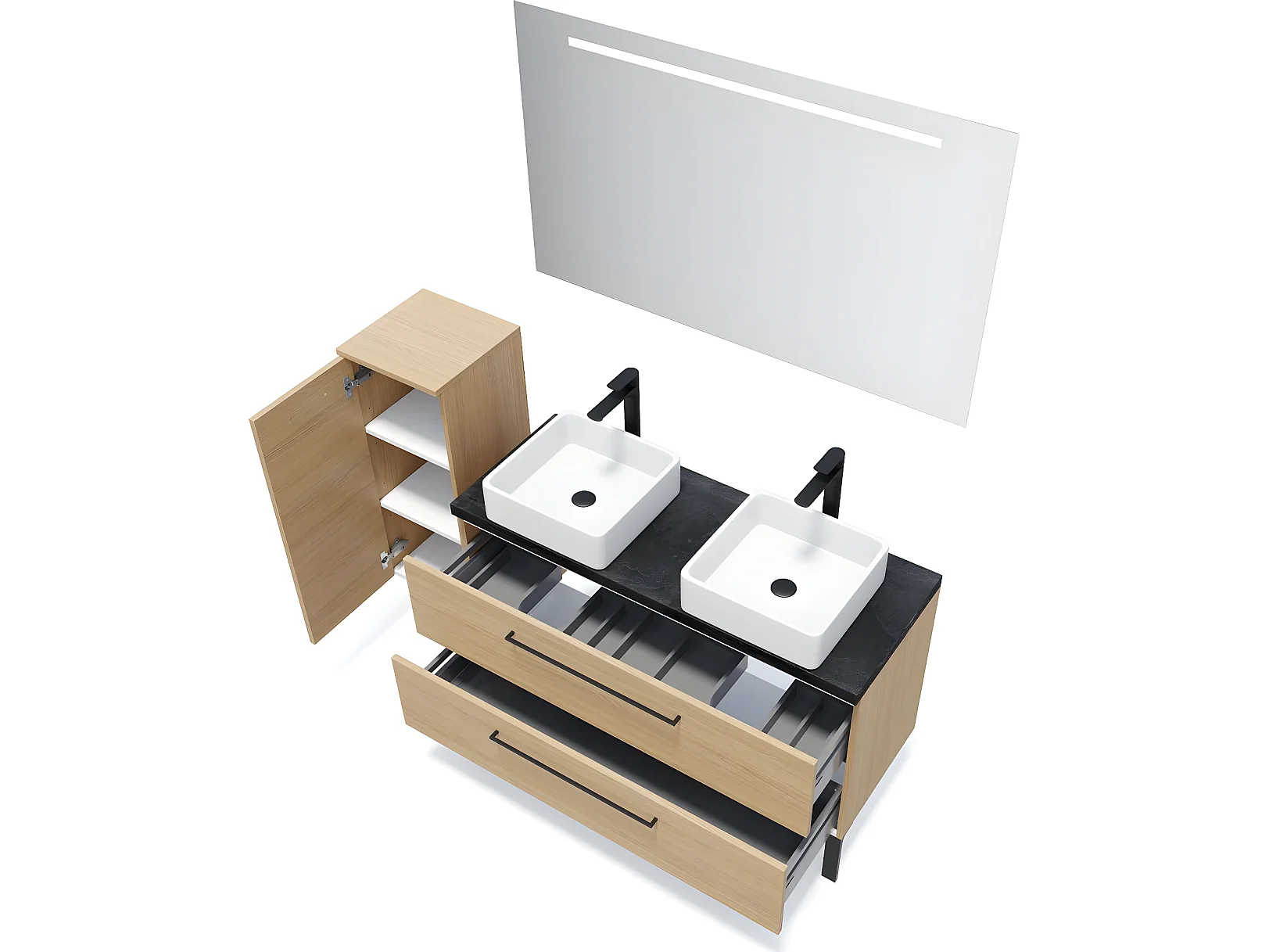 Meuble de salle de bain suspendu 2 vasques à poser 120cm 2 tiroirs Chêne clair + miroir + colonne ouverture gauche - Glasgow