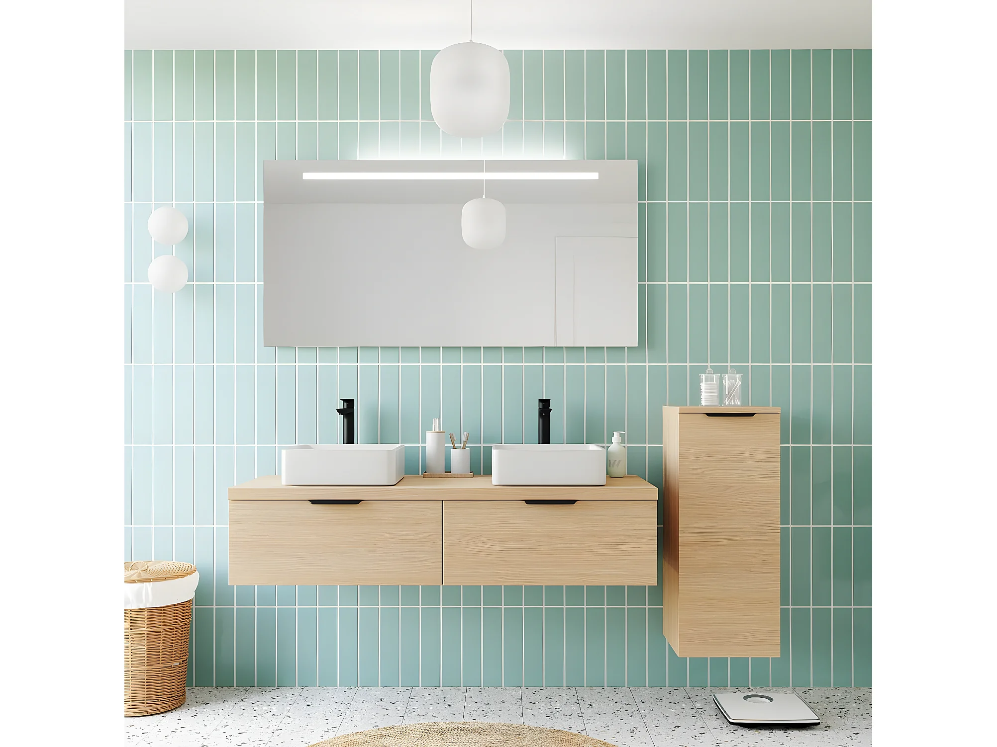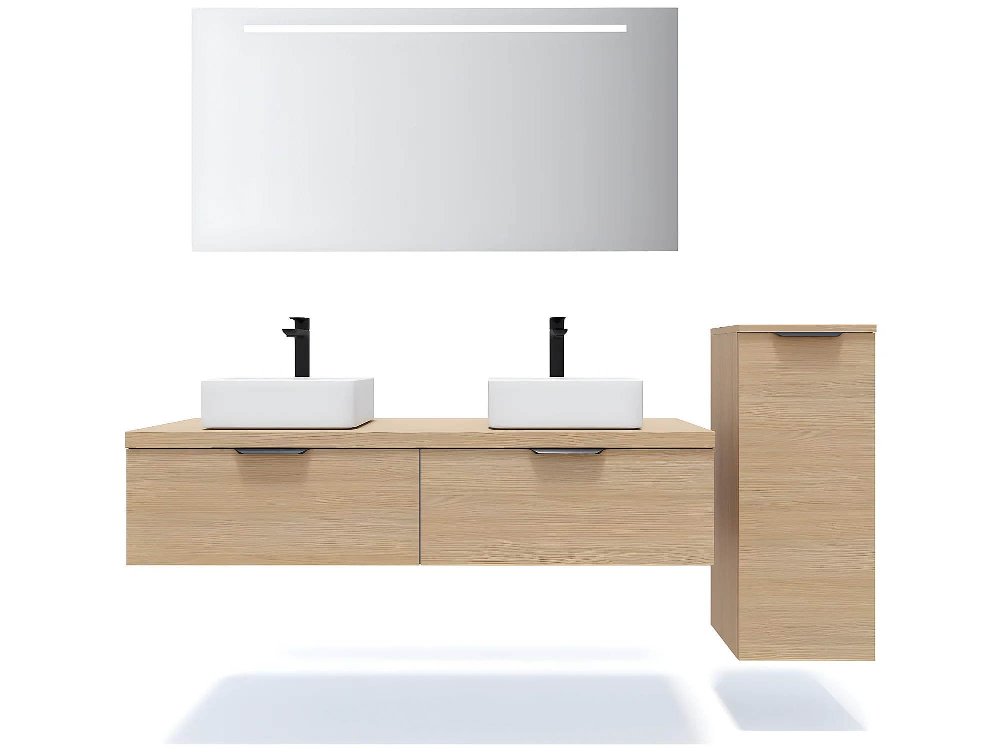 Meuble de salle de bain suspendu 2 vasques à poser 140cm 2 tiroirs Chêne clair + miroir + colonne ouverture droite - Soho