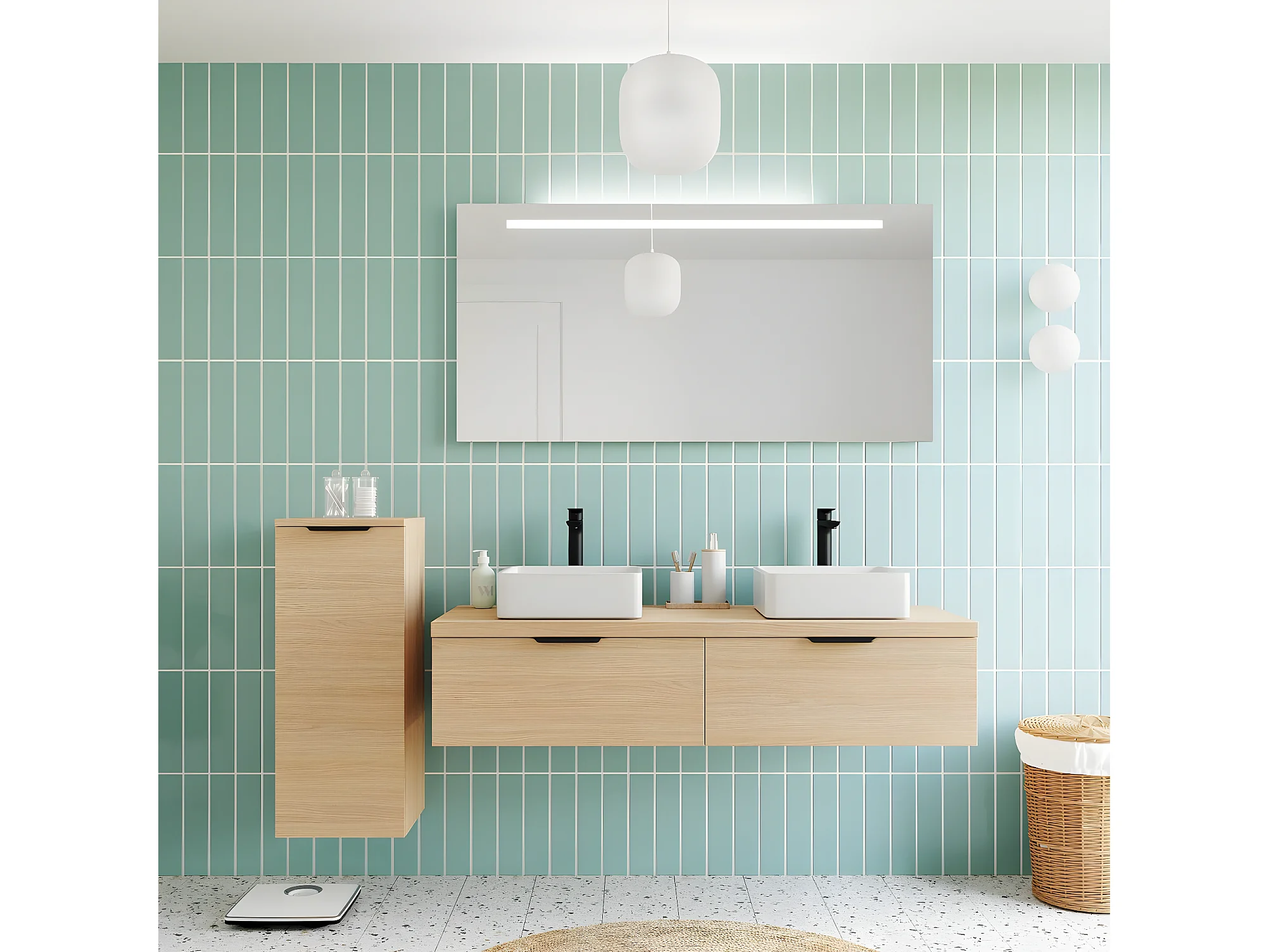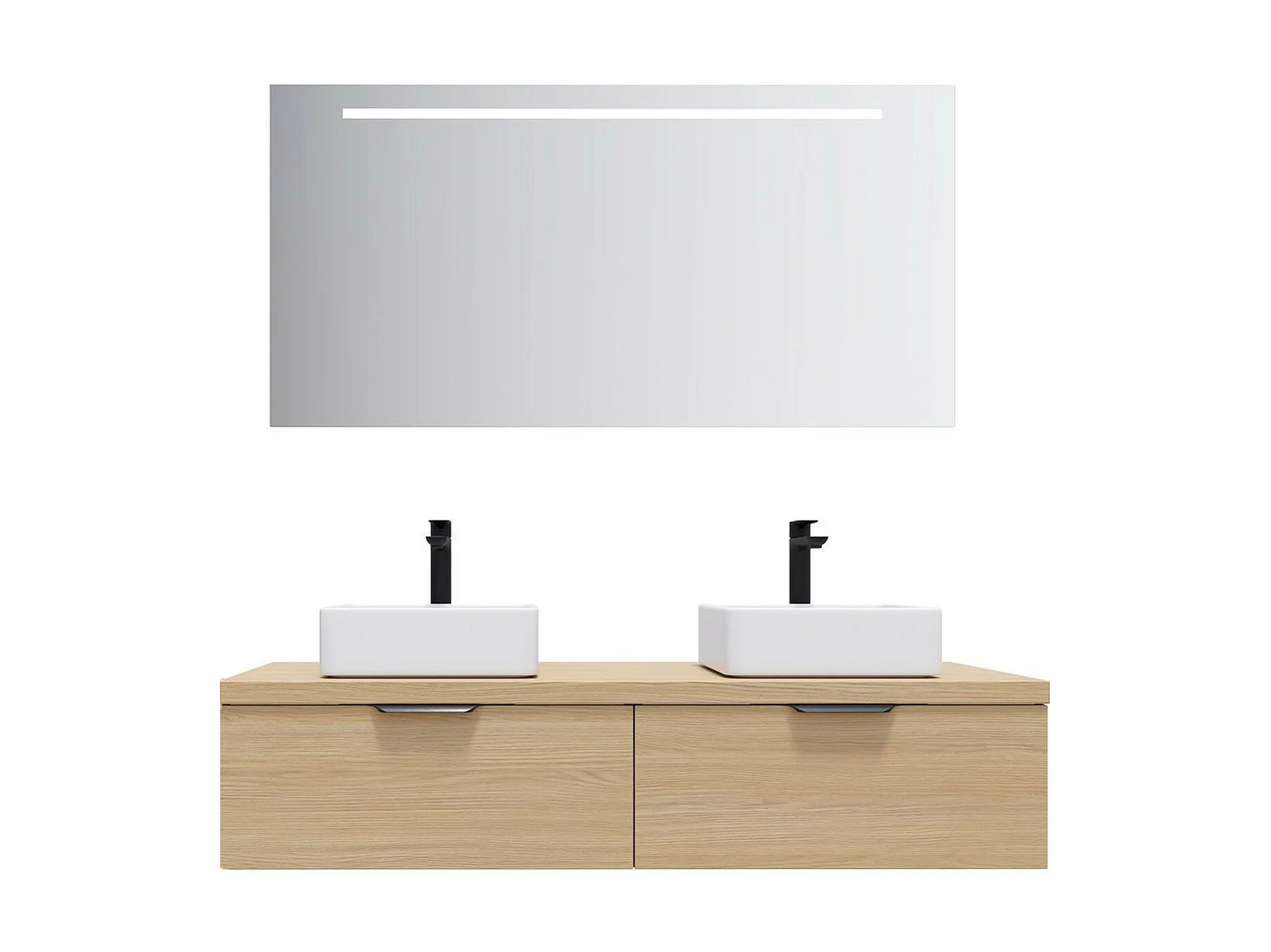 Meuble de salle de bain suspendu 2 vasques à poser 140cm 2 tiroirs Chêne clair + miroir - Soho
