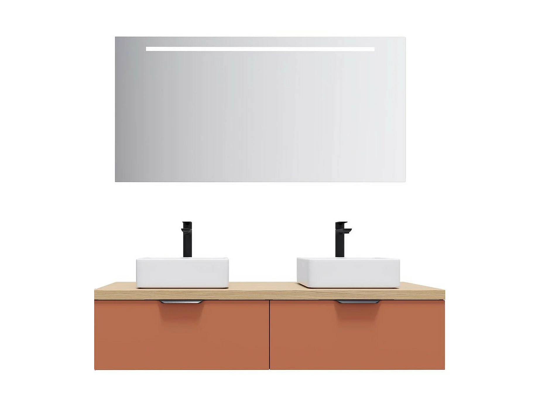 Meuble de salle de bain suspendu 2 vasques à poser 140cm 2 tiroirs Terracotta + miroir - Soho
