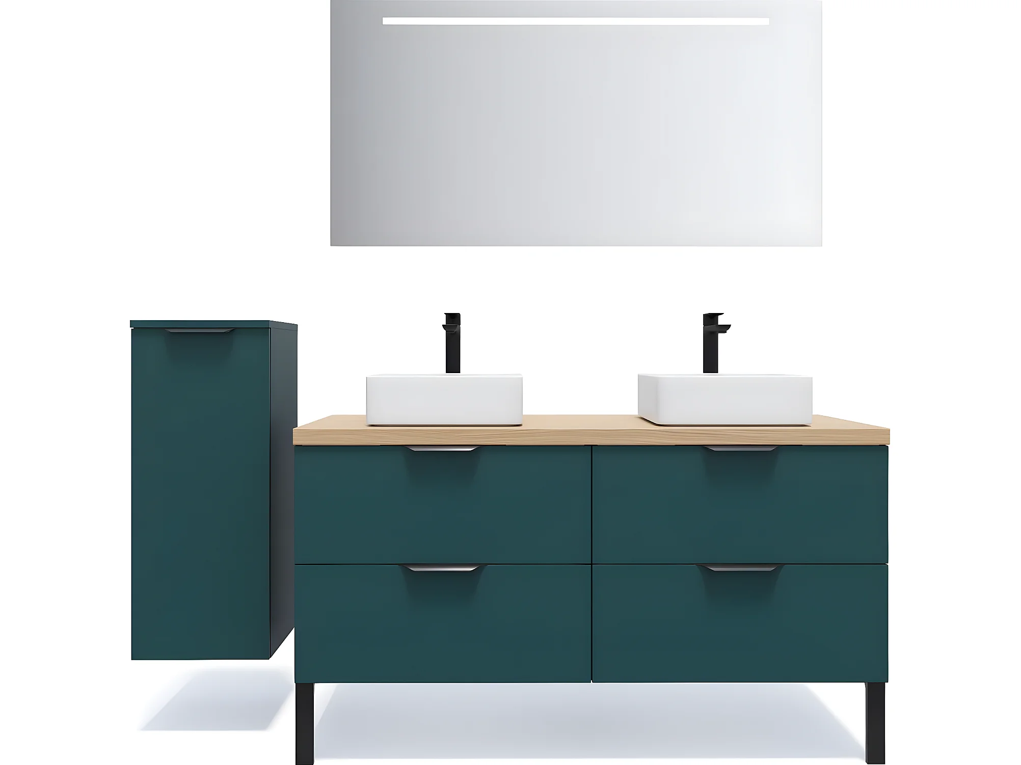 Meuble de salle de bain suspendu 2 vasques à poser 140cm 4 tiroirs Bleu + miroir + colonne ouverture gauche - Soho