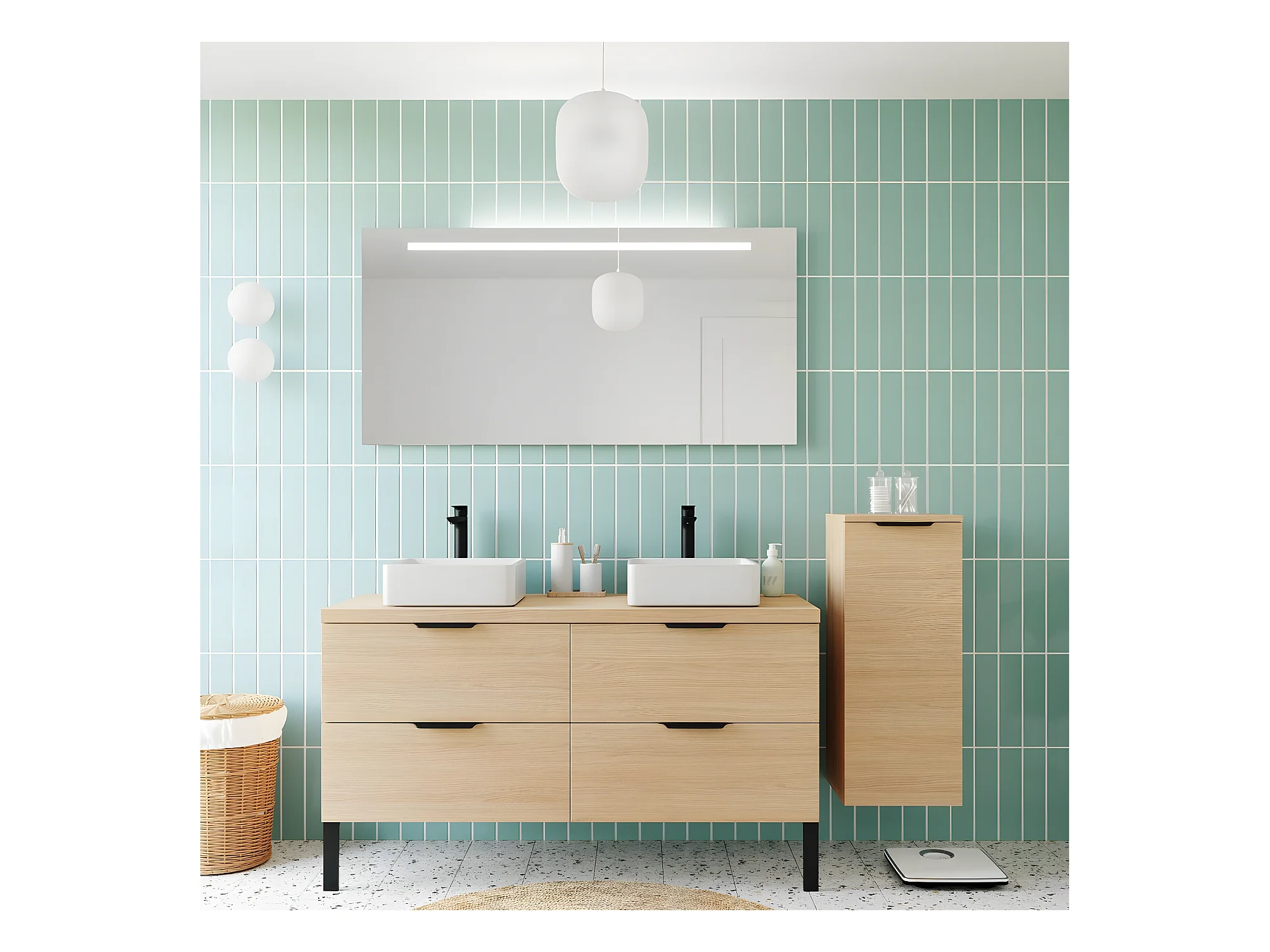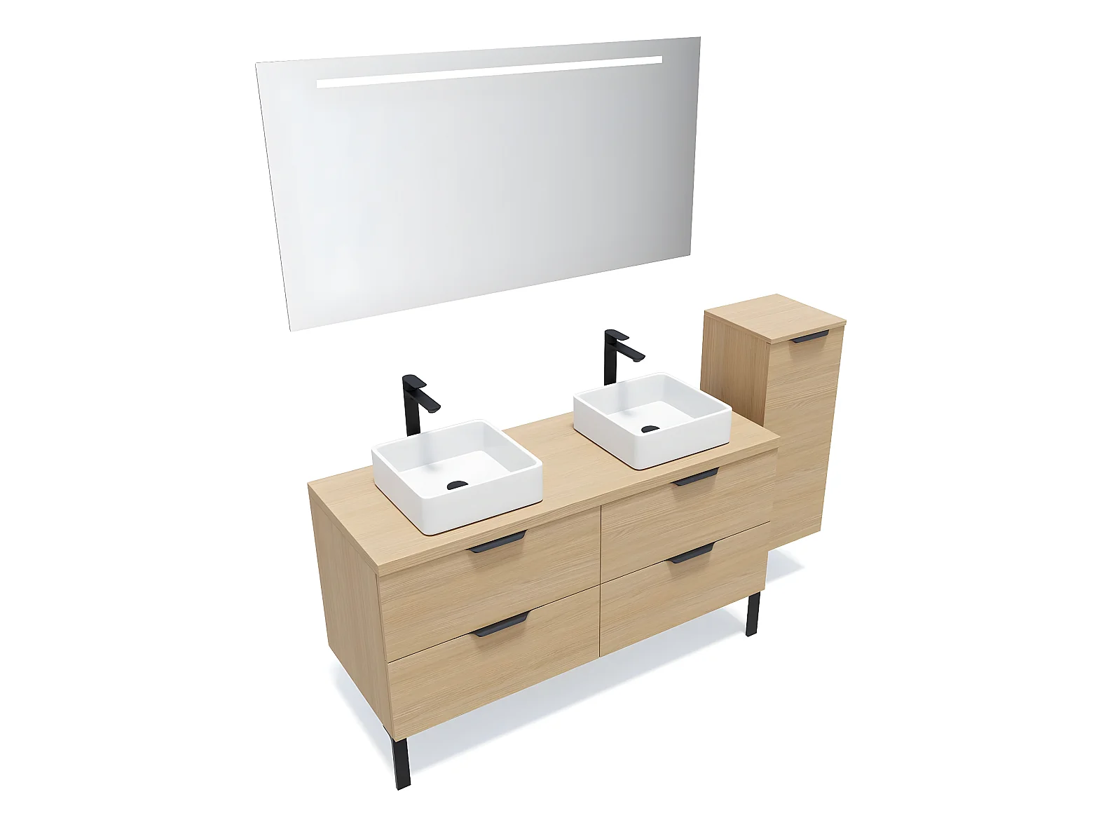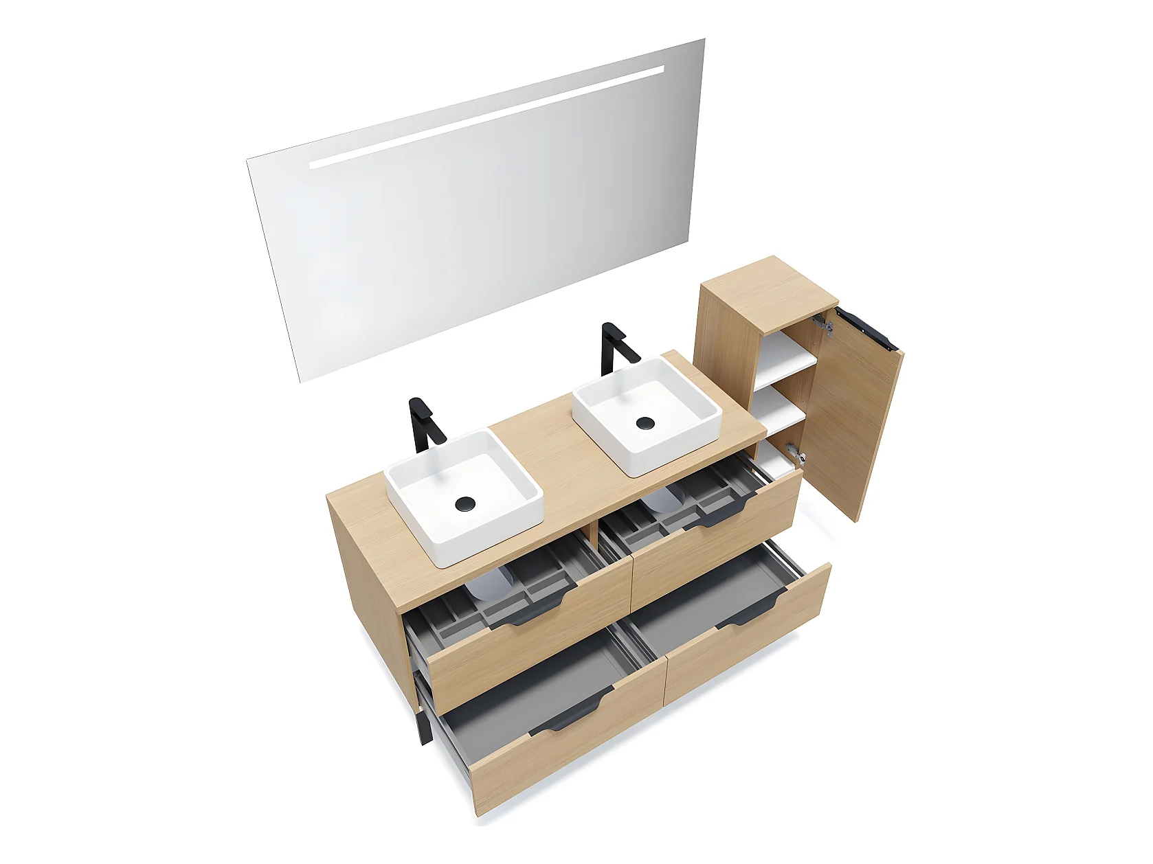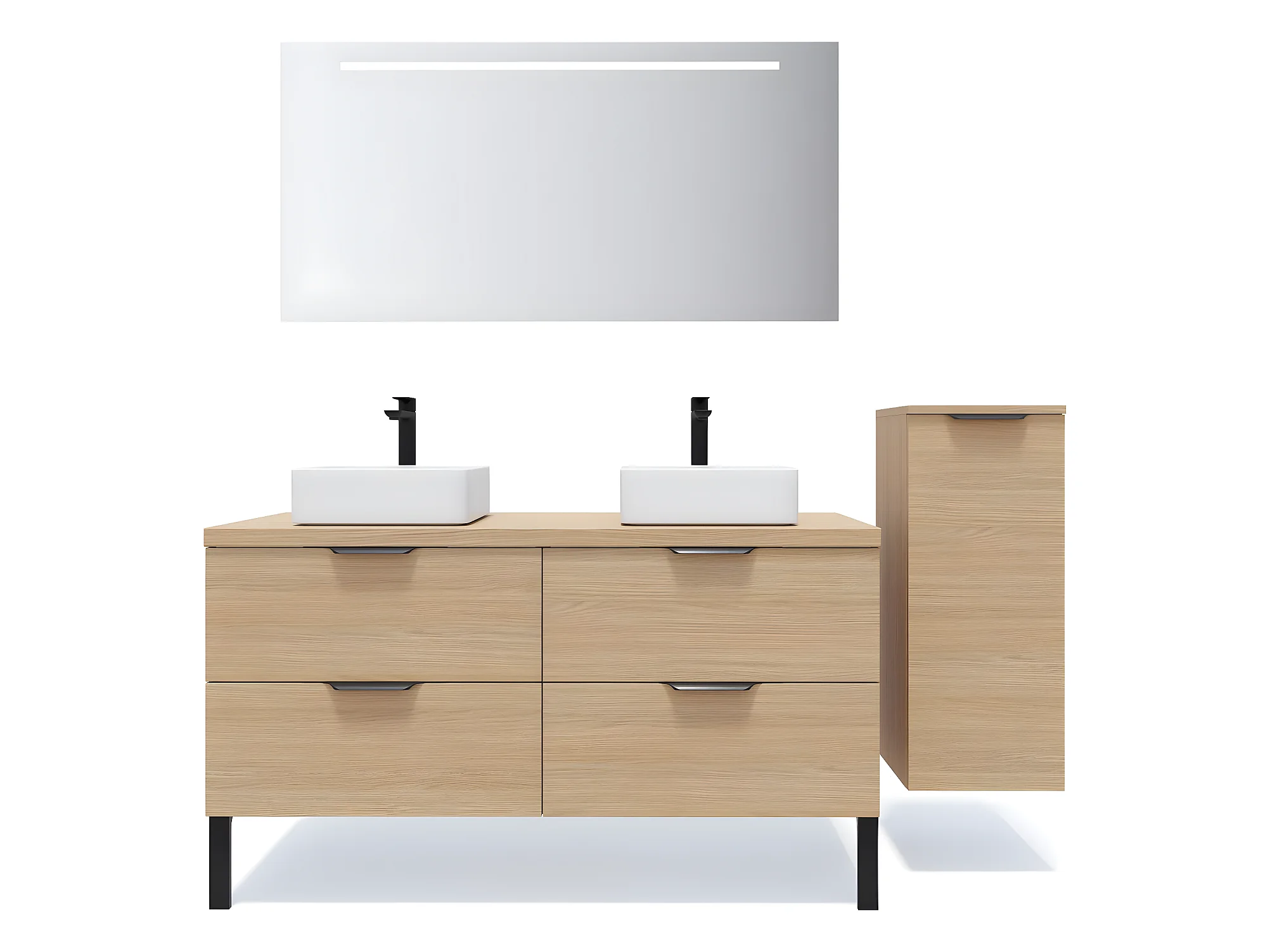 Meuble de salle de bain suspendu 2 vasques à poser 140cm 4 tiroirs Chêne clair + miroir + colonne ouverture droite - Soho