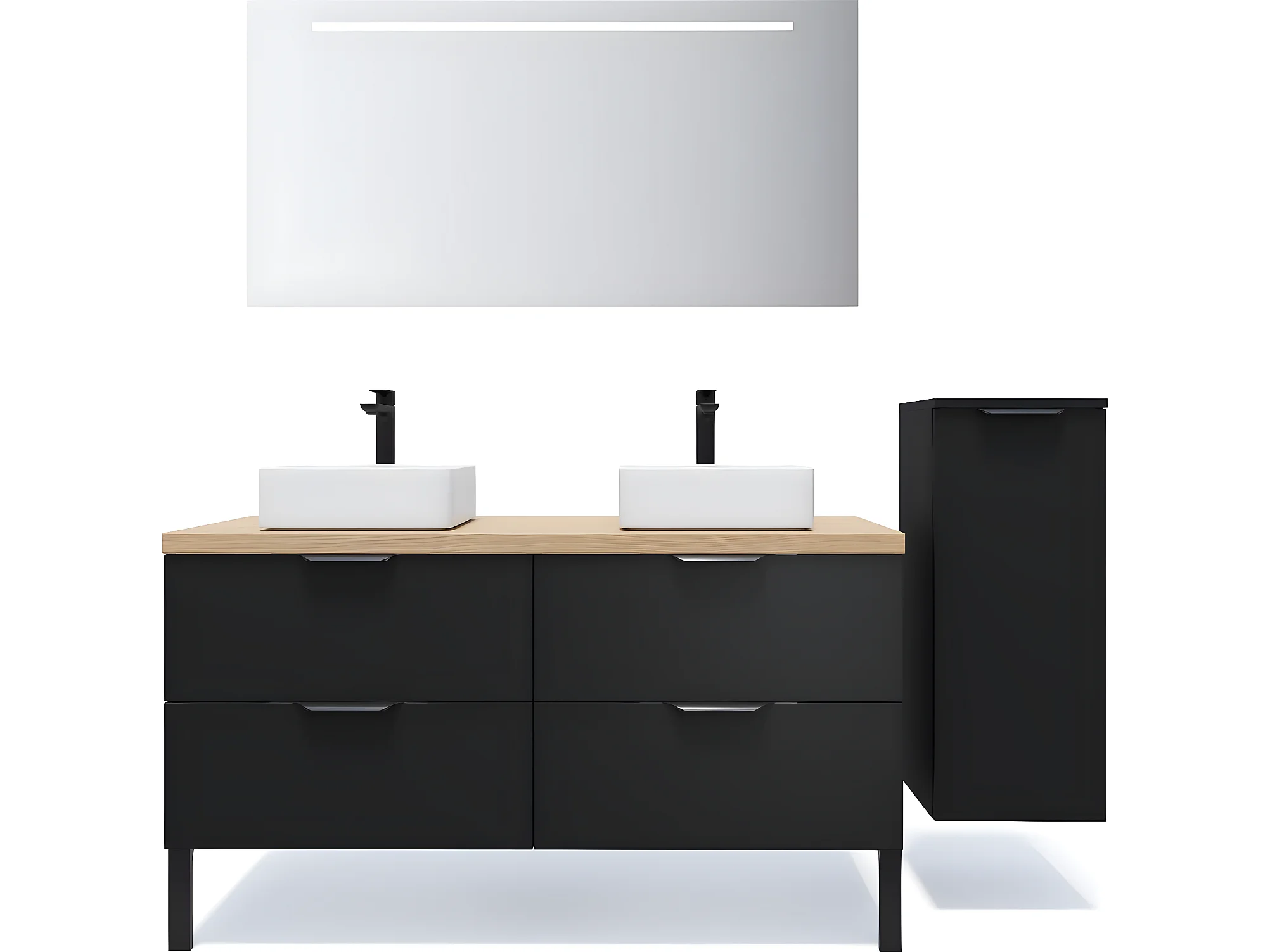 Meuble de salle de bain suspendu 2 vasques à poser 140cm 4 tiroirs Noir + miroir + colonne ouverture droite - Soho