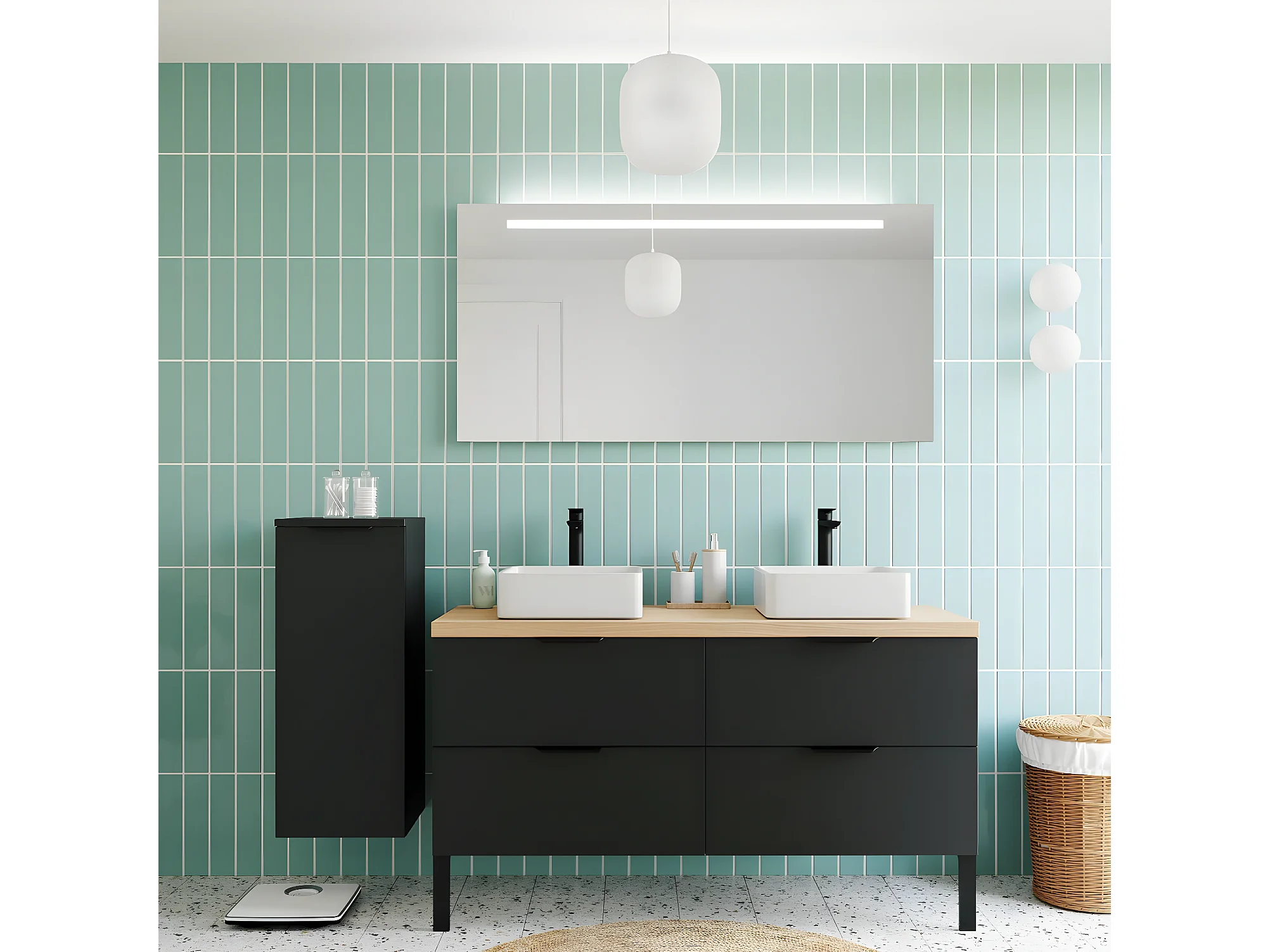Meuble de salle de bain suspendu 2 vasques à poser 140cm 4 tiroirs Noir + miroir + colonne ouverture gauche - Soho