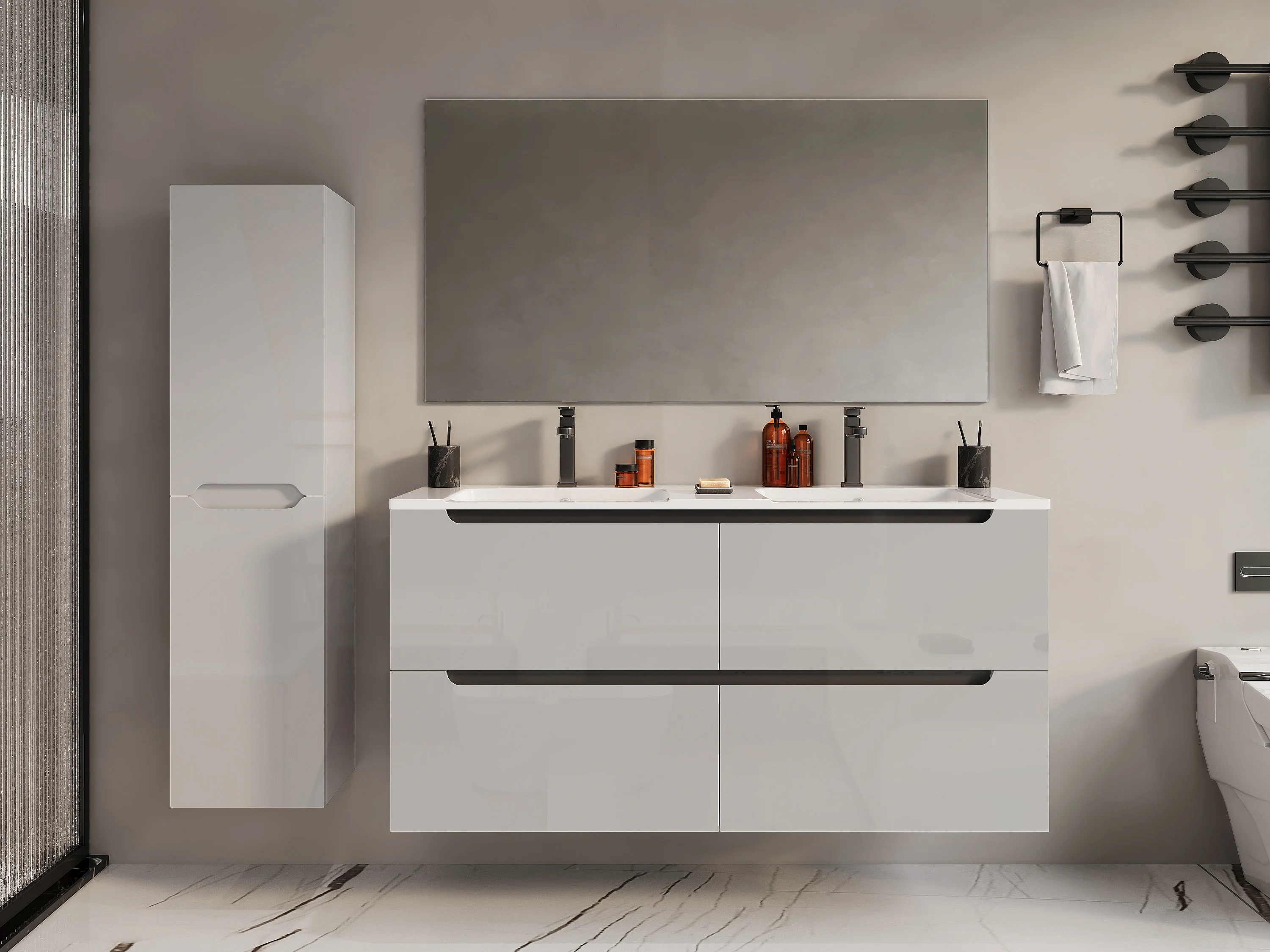 Meuble de salle de bain suspendu avec double vasque à encastrer et colonne - Blanc - 120 cm - SELITA