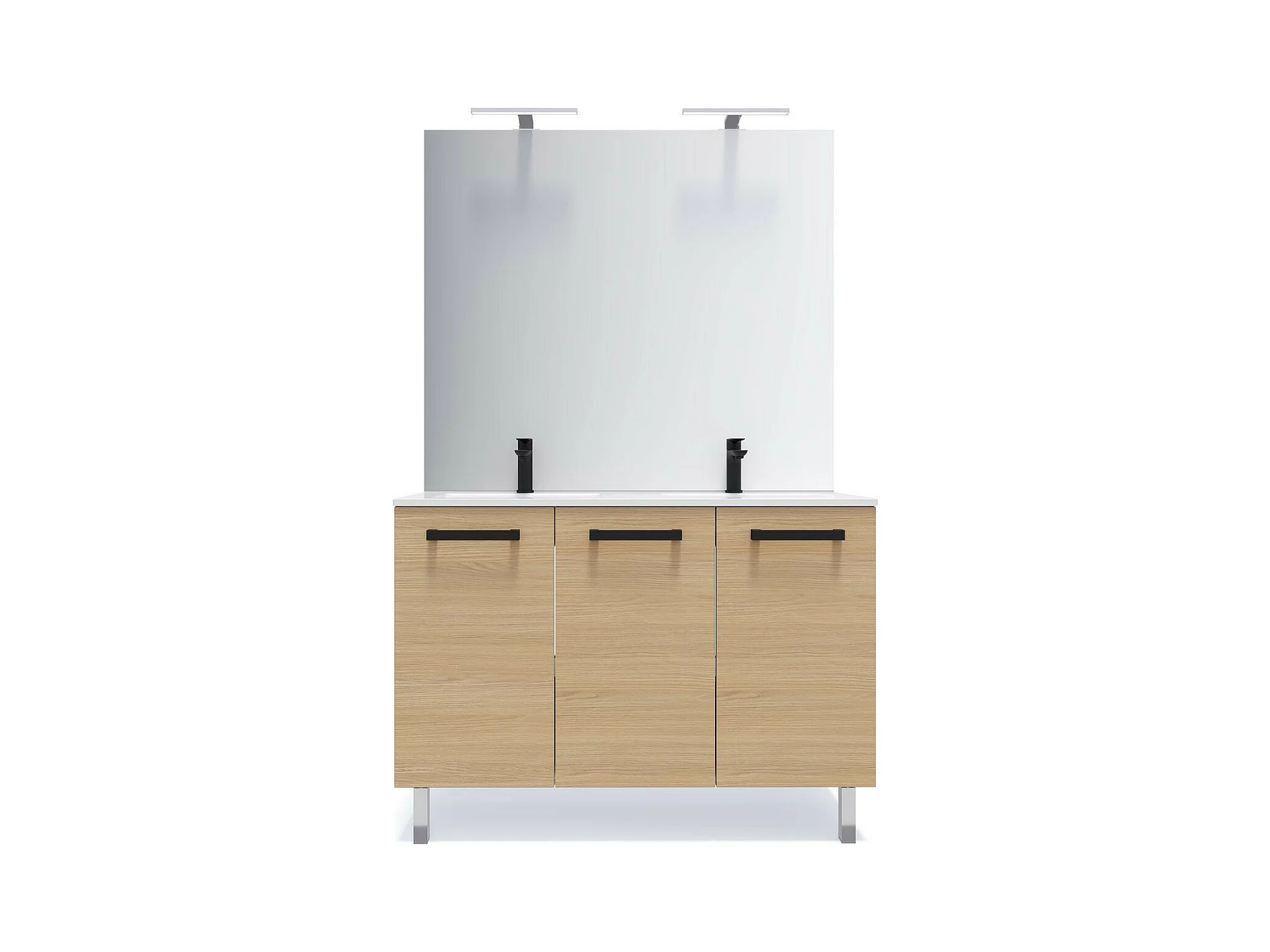 Meuble de salle de bain suspendu avec pieds double vasque intégrée 120cm 3 portes Chêne clair + miroir - Chelsea