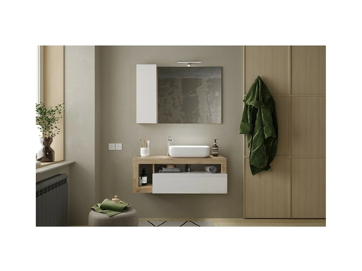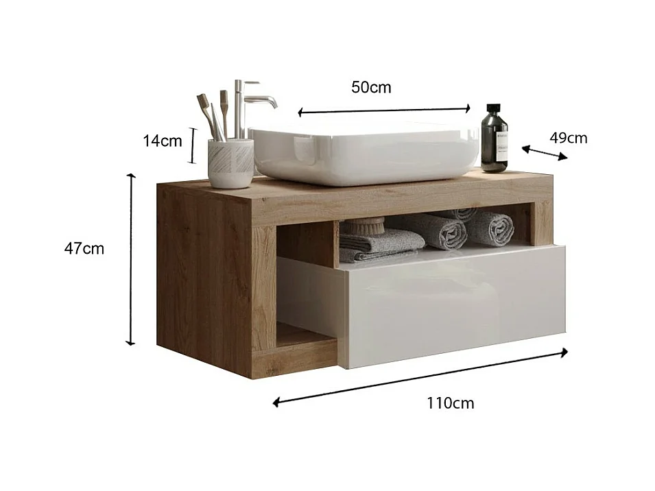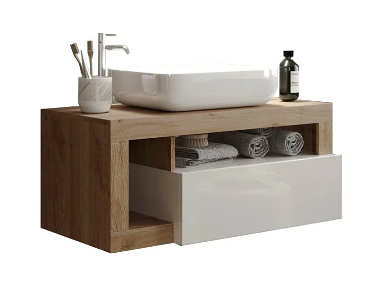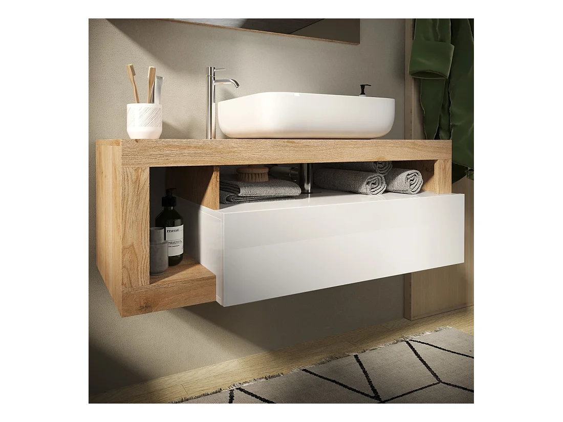 Meuble de salle de bain suspendu avec vasque et tiroir, collection BURA, blanc brillant/chêne clair