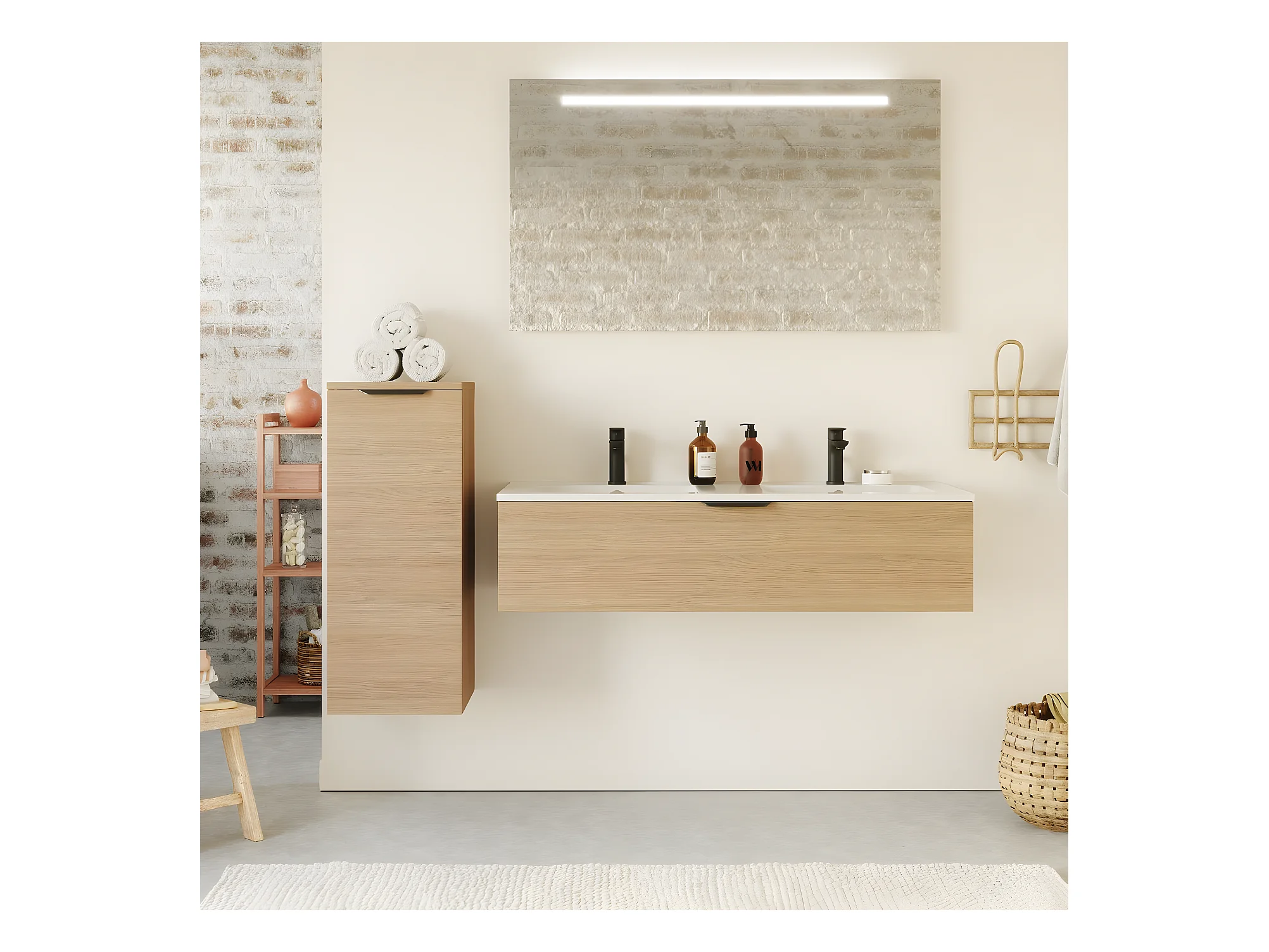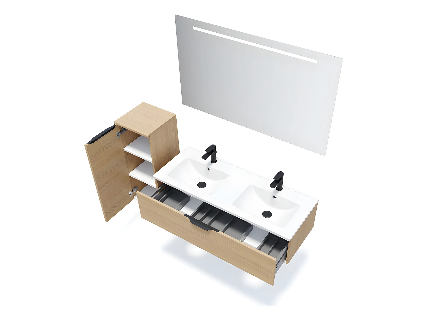 Meuble de salle de bain suspendu double vasque intégrée 120cm 1 tiroir Chêne clair + miroir + colonne ouverture gauche - Venice