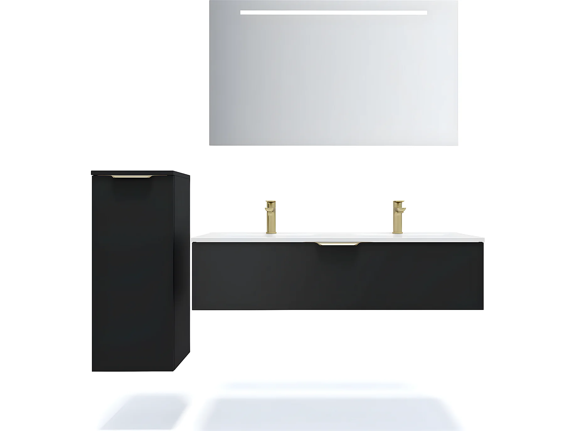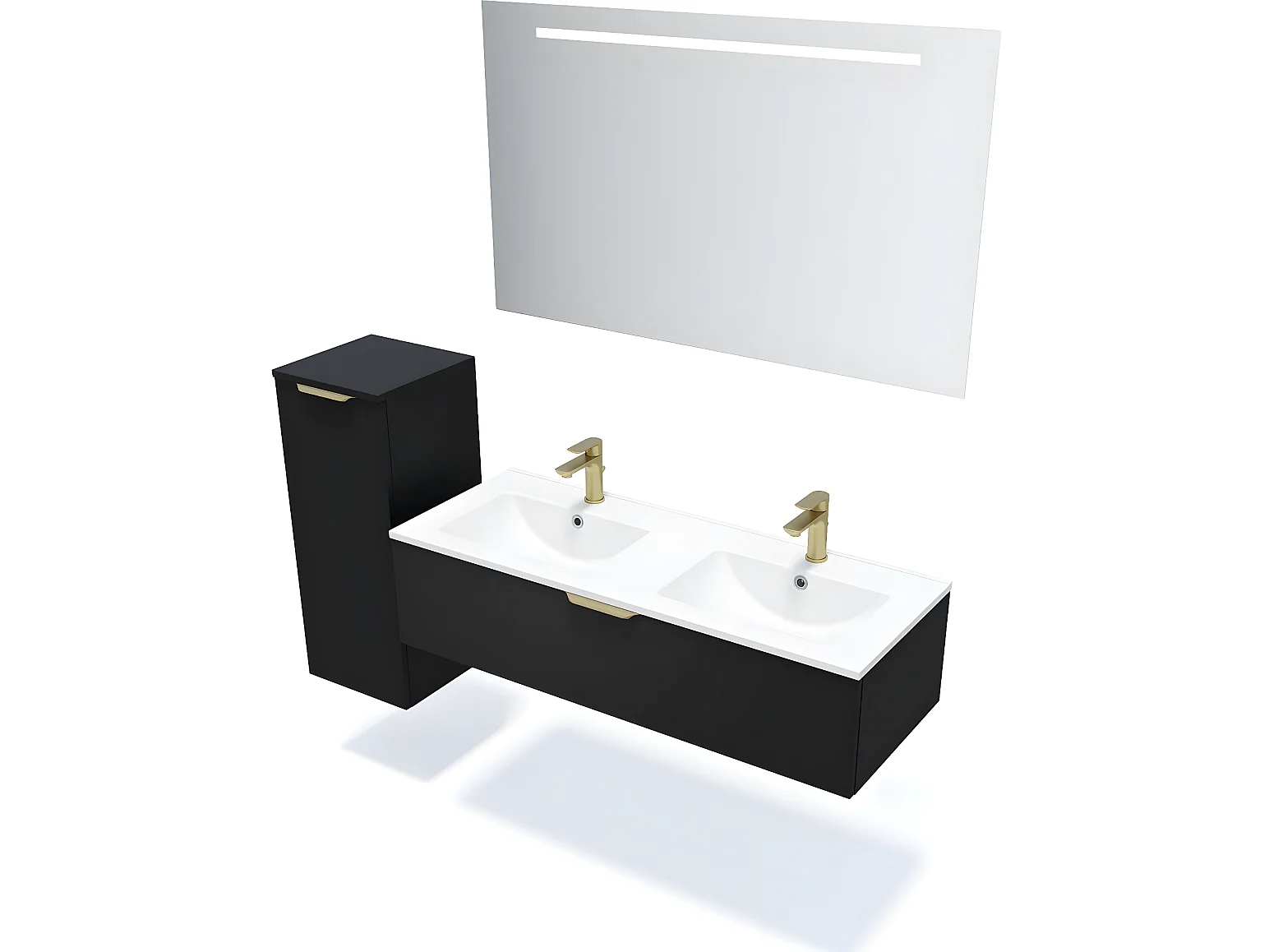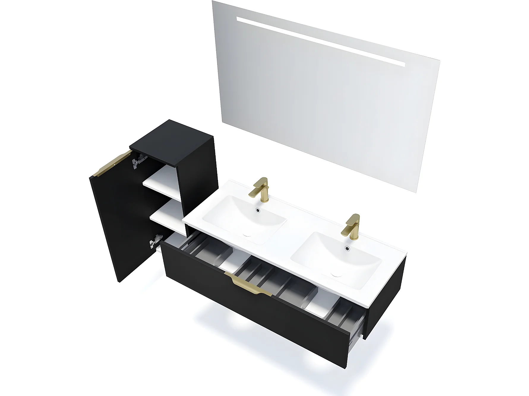 Meuble de salle de bain suspendu double vasque intégrée 120cm 1 tiroir Noir + miroir + colonne ouverture gauche - Venice