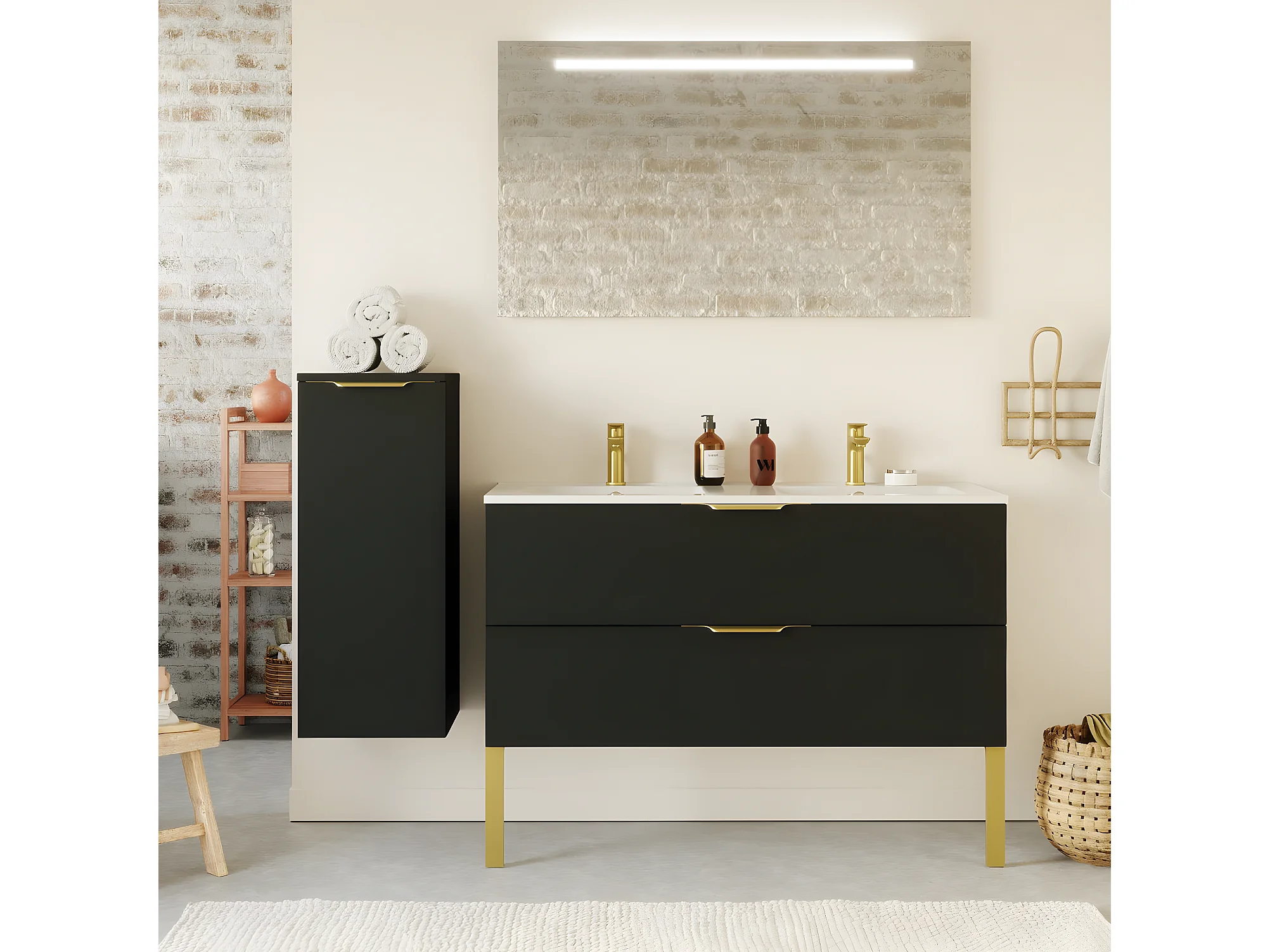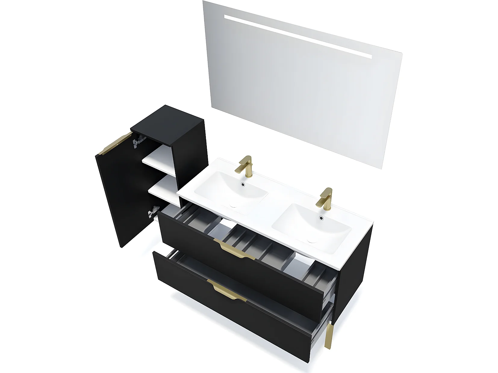 Meuble de salle de bain suspendu double vasque intégrée 120cm 2 tiroirs Noir + miroir + colonne ouverture gauche - Venice
