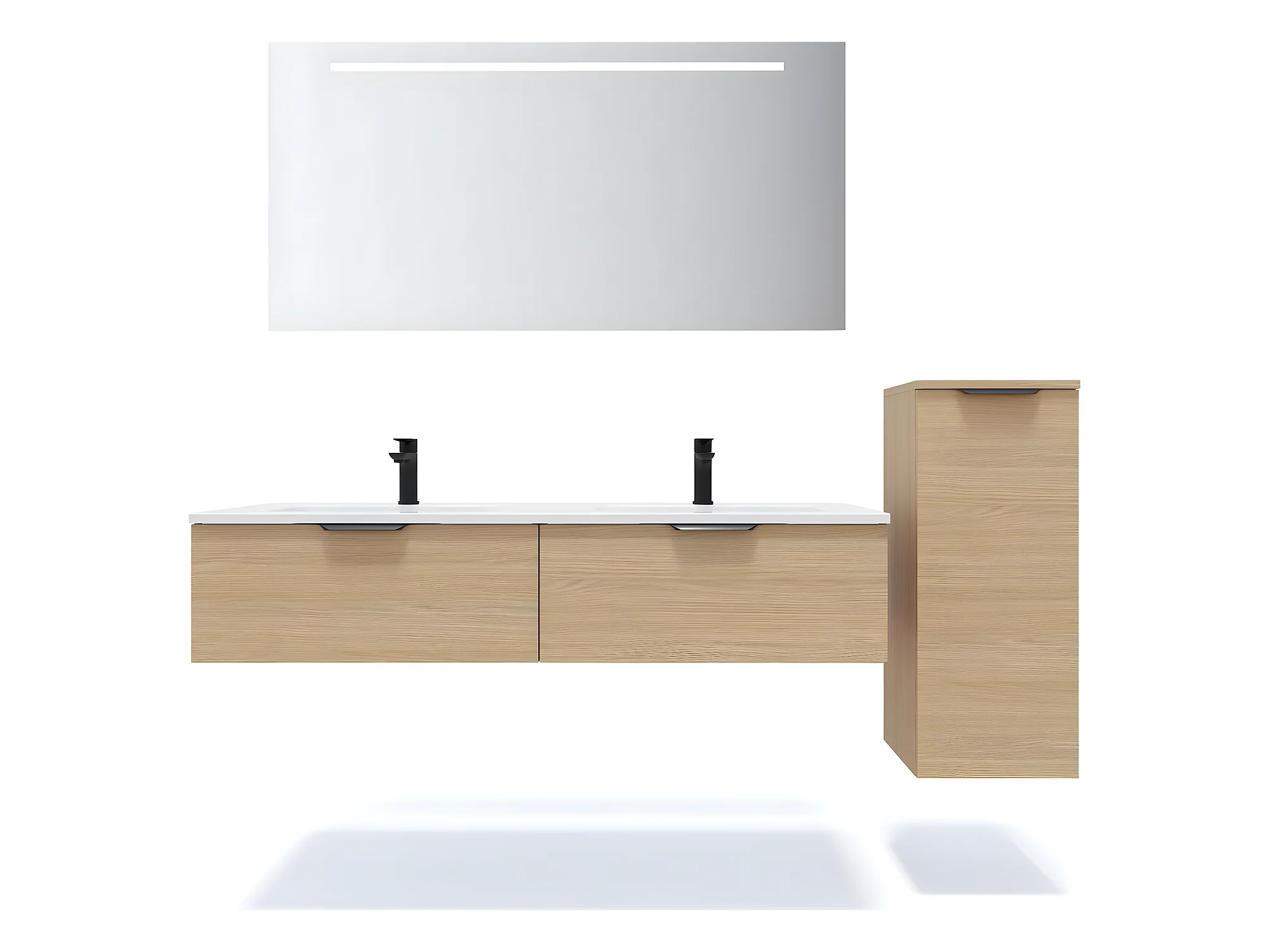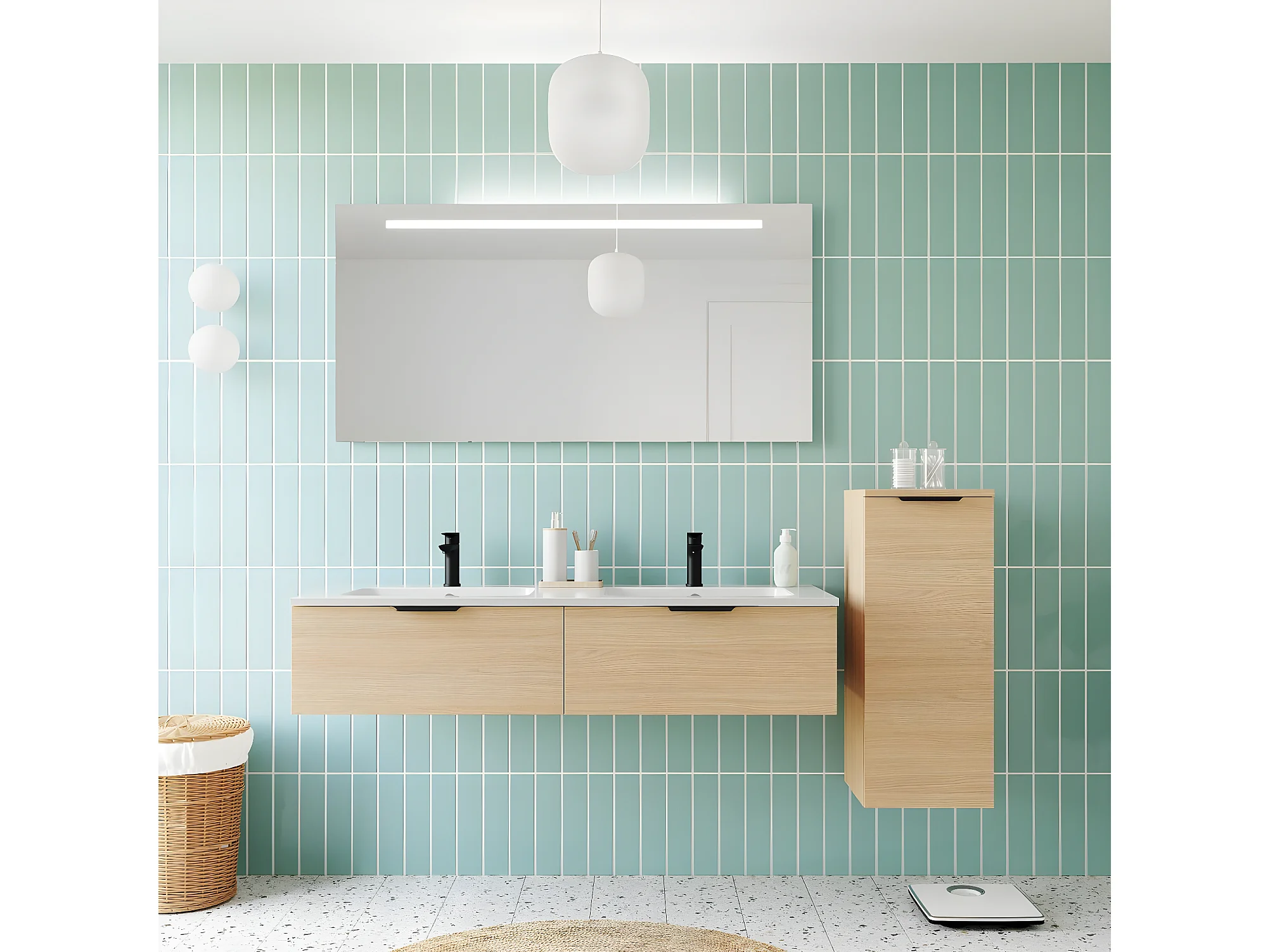 Meuble de salle de bain suspendu double vasque intégrée 140cm 2 tiroirs Chêne clair + miroir + colonne ouverture droite - Soho