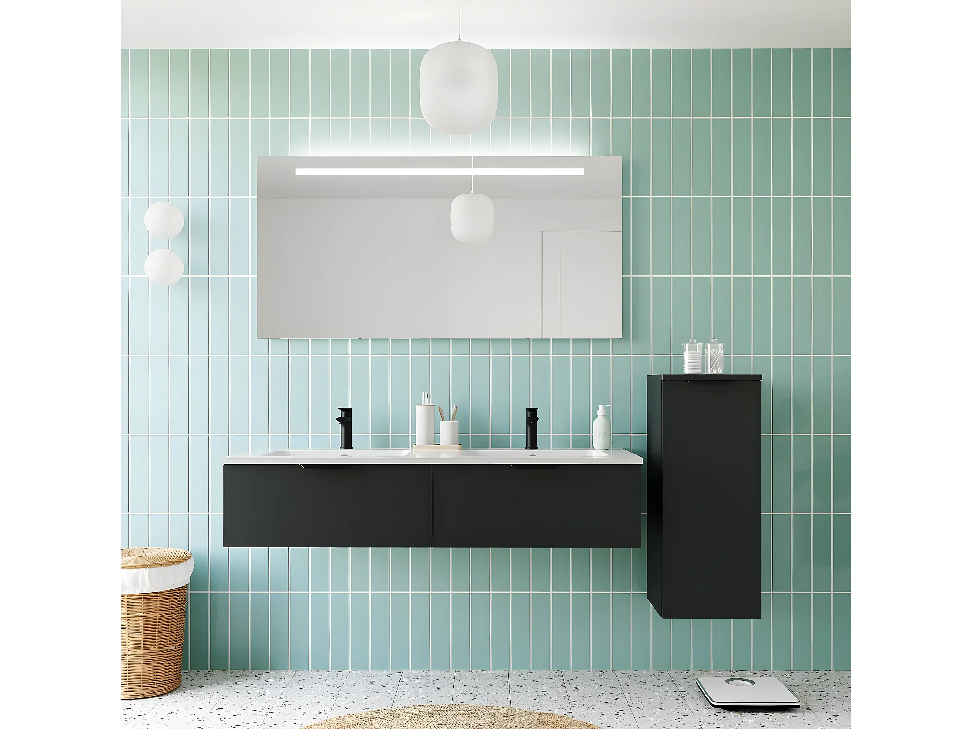Meuble de salle de bain suspendu double vasque intégrée 140cm 2 tiroirs Noir + miroir + colonne ouverture droite - Soho