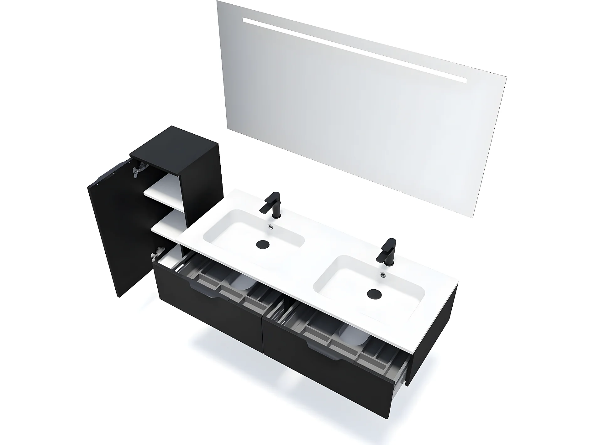 Meuble de salle de bain suspendu double vasque intégrée 140cm 2 tiroirs Noir + miroir + colonne ouverture gauche - Soho