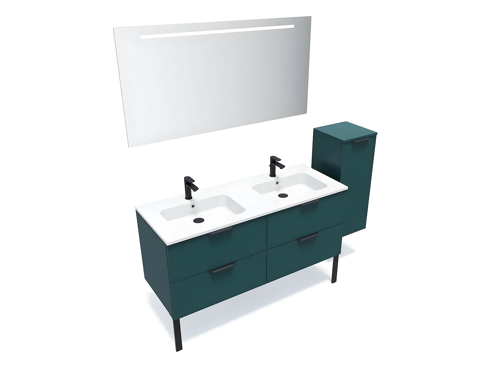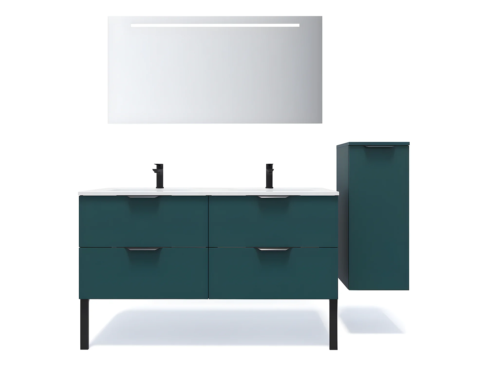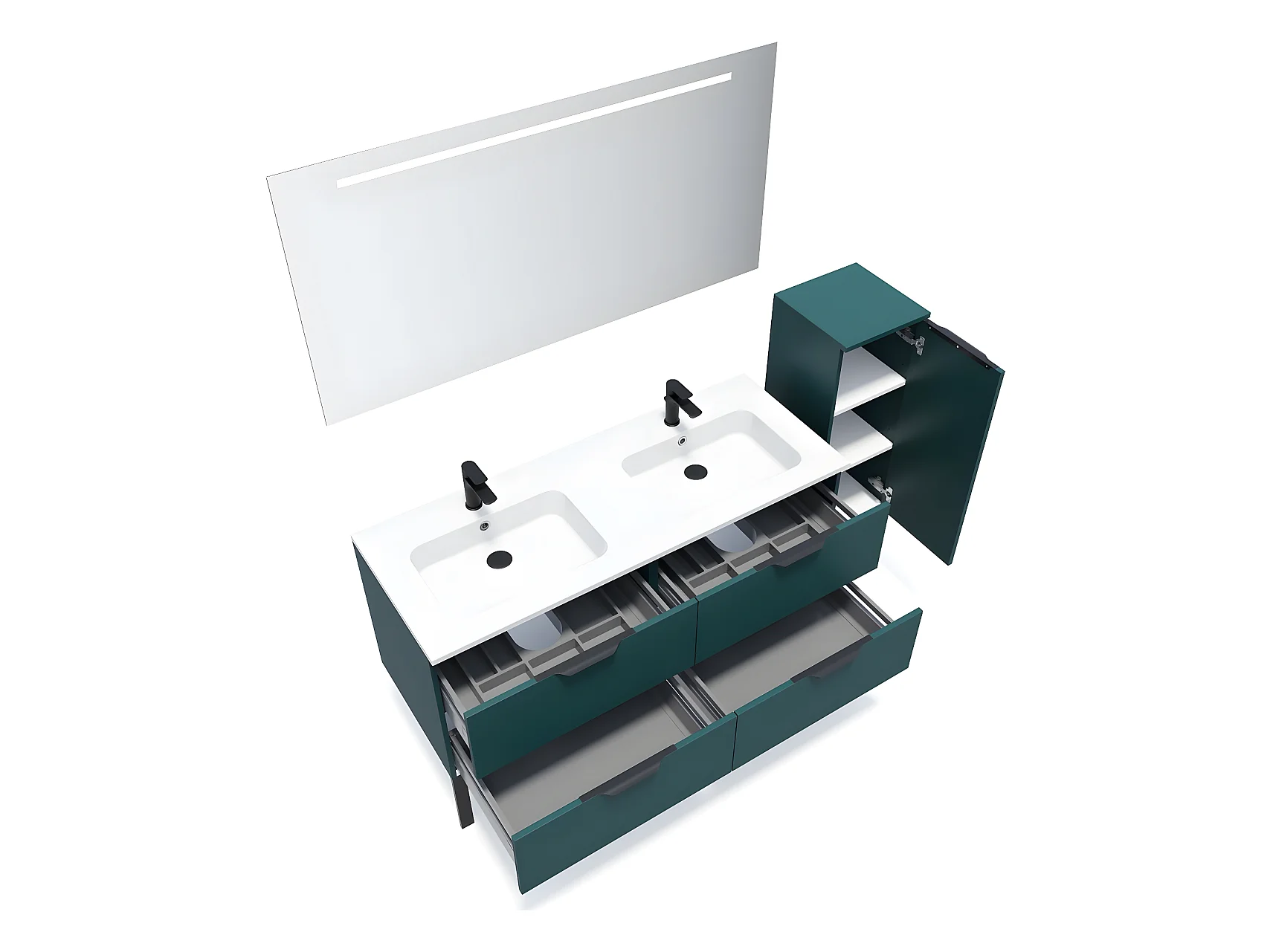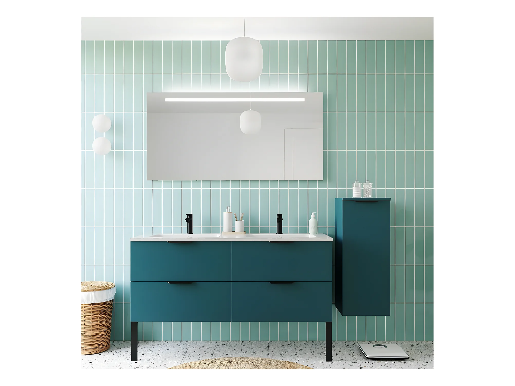 Meuble de salle de bain suspendu double vasque intégrée 140cm 4 tiroirs Bleu + miroir + colonne ouverture droite - Soho