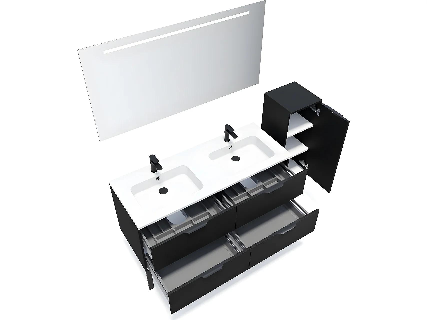 Meuble de salle de bain suspendu double vasque intégrée 140cm 4 tiroirs Noir + miroir + colonne ouverture droite - Soho