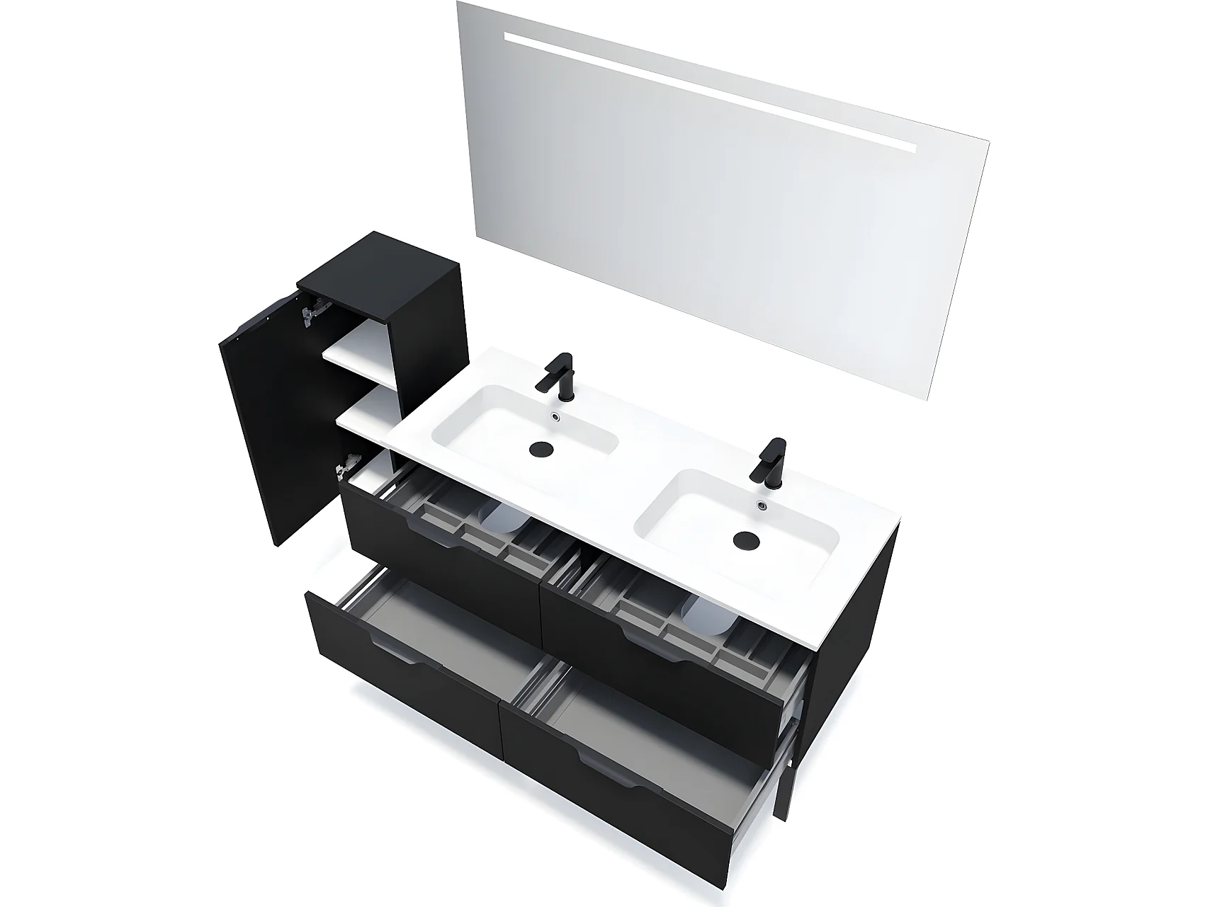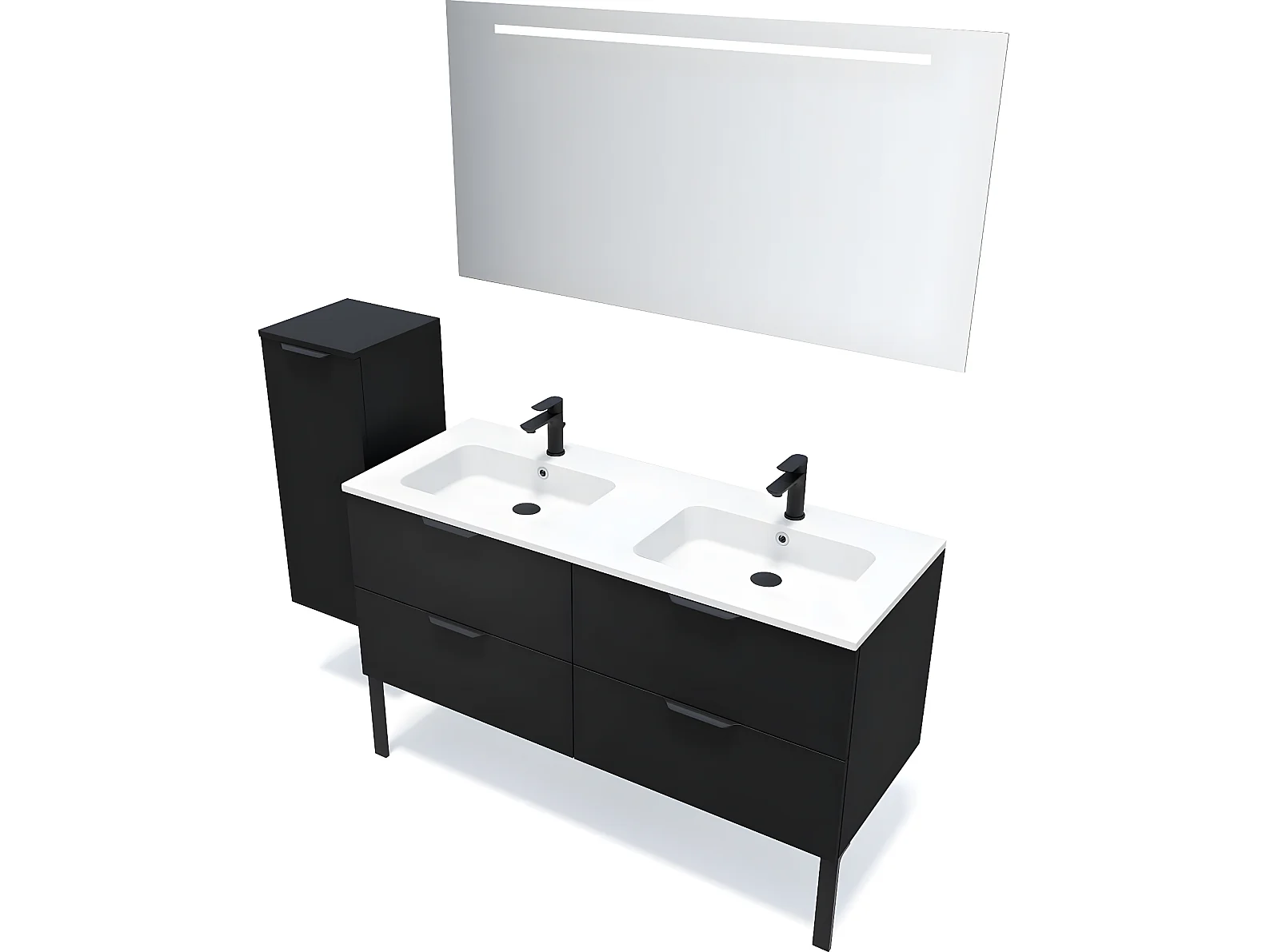 Meuble de salle de bain suspendu double vasque intégrée 140cm 4 tiroirs Noir + miroir + colonne ouverture gauche - Soho