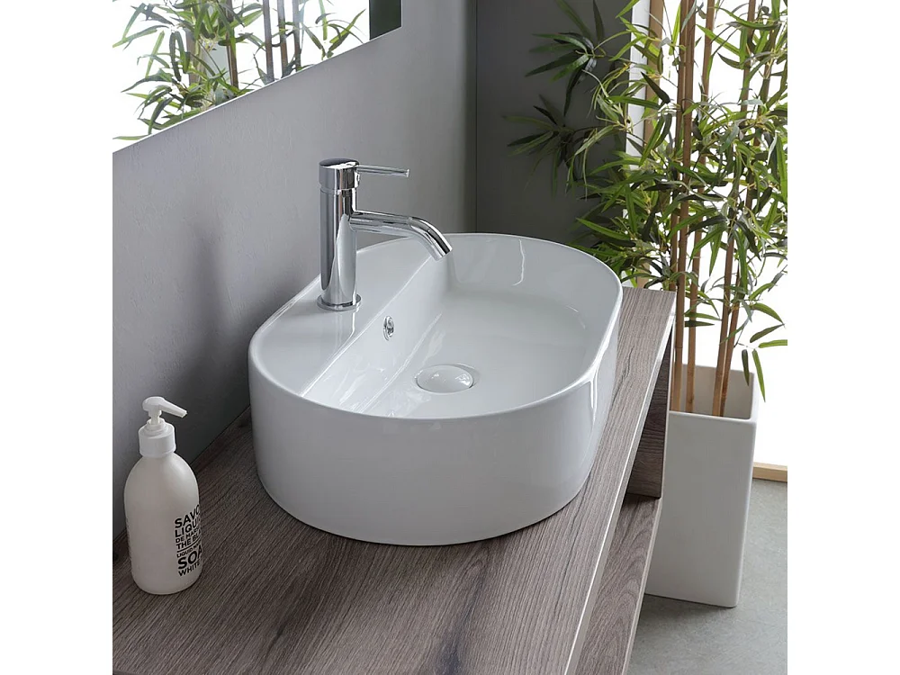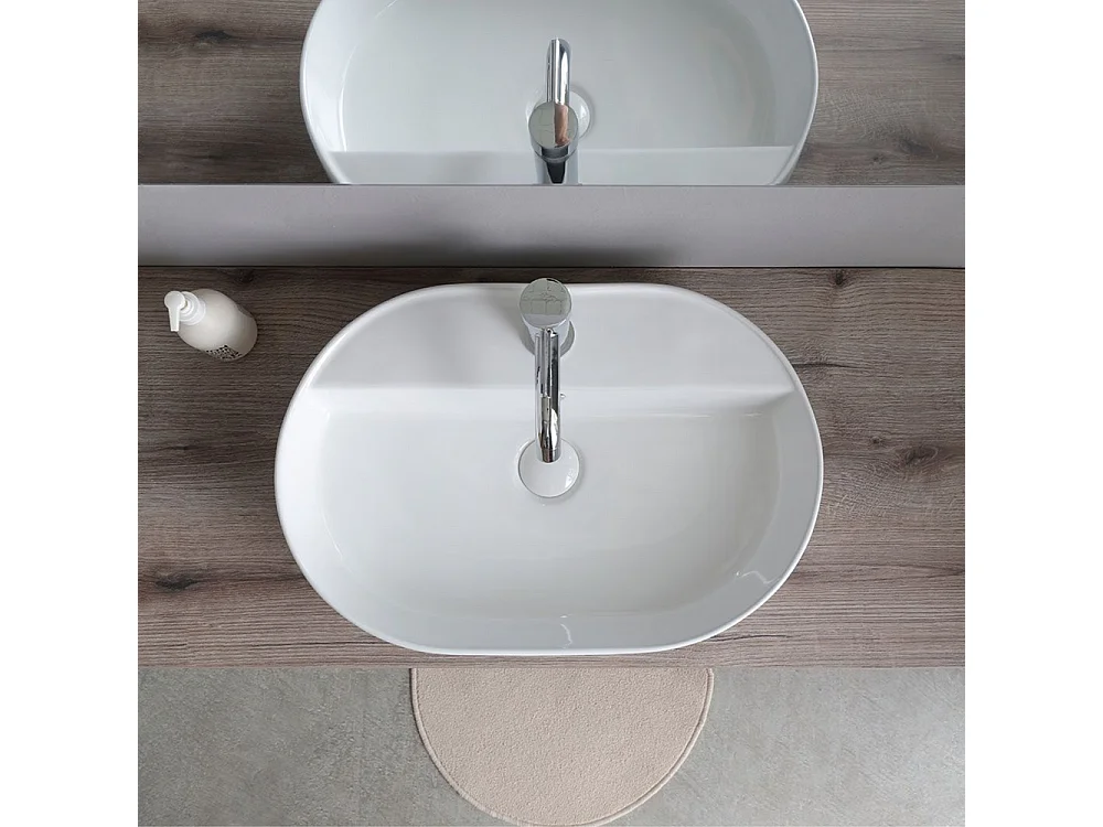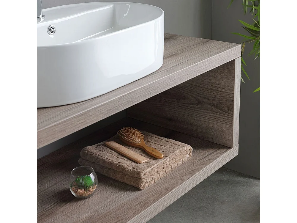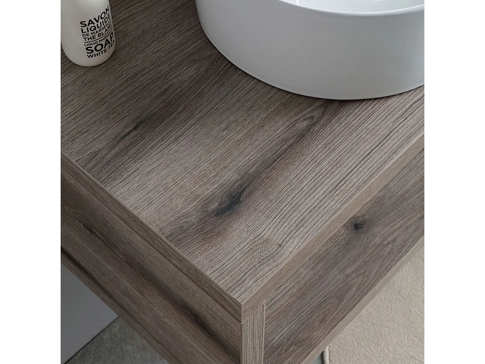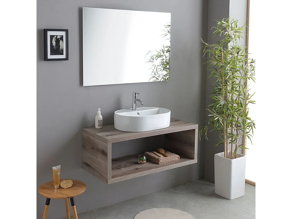Meuble de salle de bain suspendu "Kos" 100 cm en chêne fossile avec vasque ovale en céramique blanche et miroir rectangulaire
