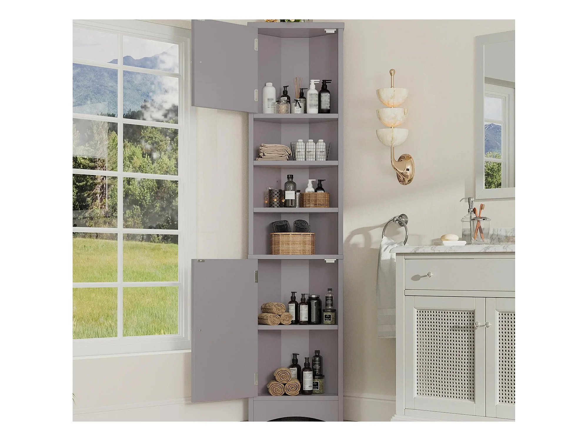 Meuble de salle de bain triangulaire 36.5x24.5x170 cm - 3 compartiments ouverts - 2 portes - gris