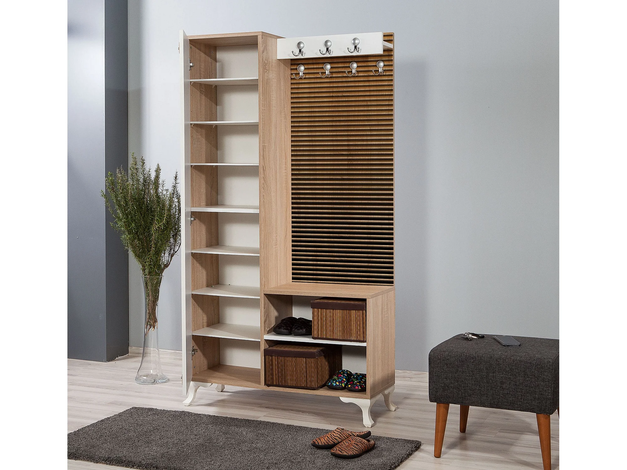 Meuble d'entré avec miroir Ayfara L100xH190cm Bois clair, Blanc et Motif rayures dégradé Jaune