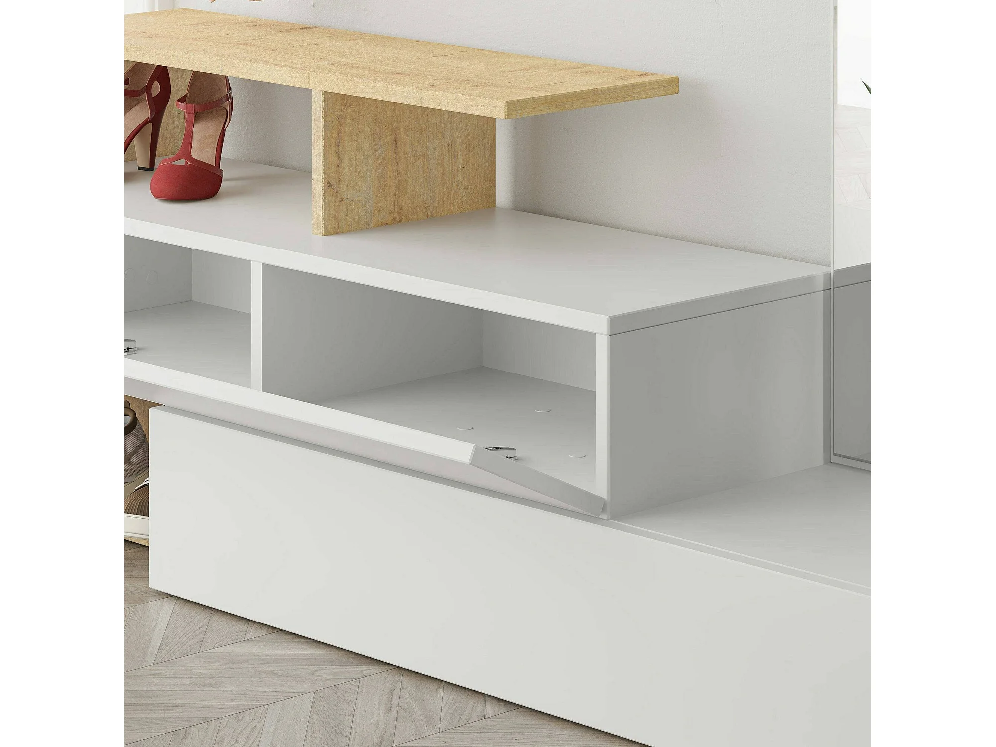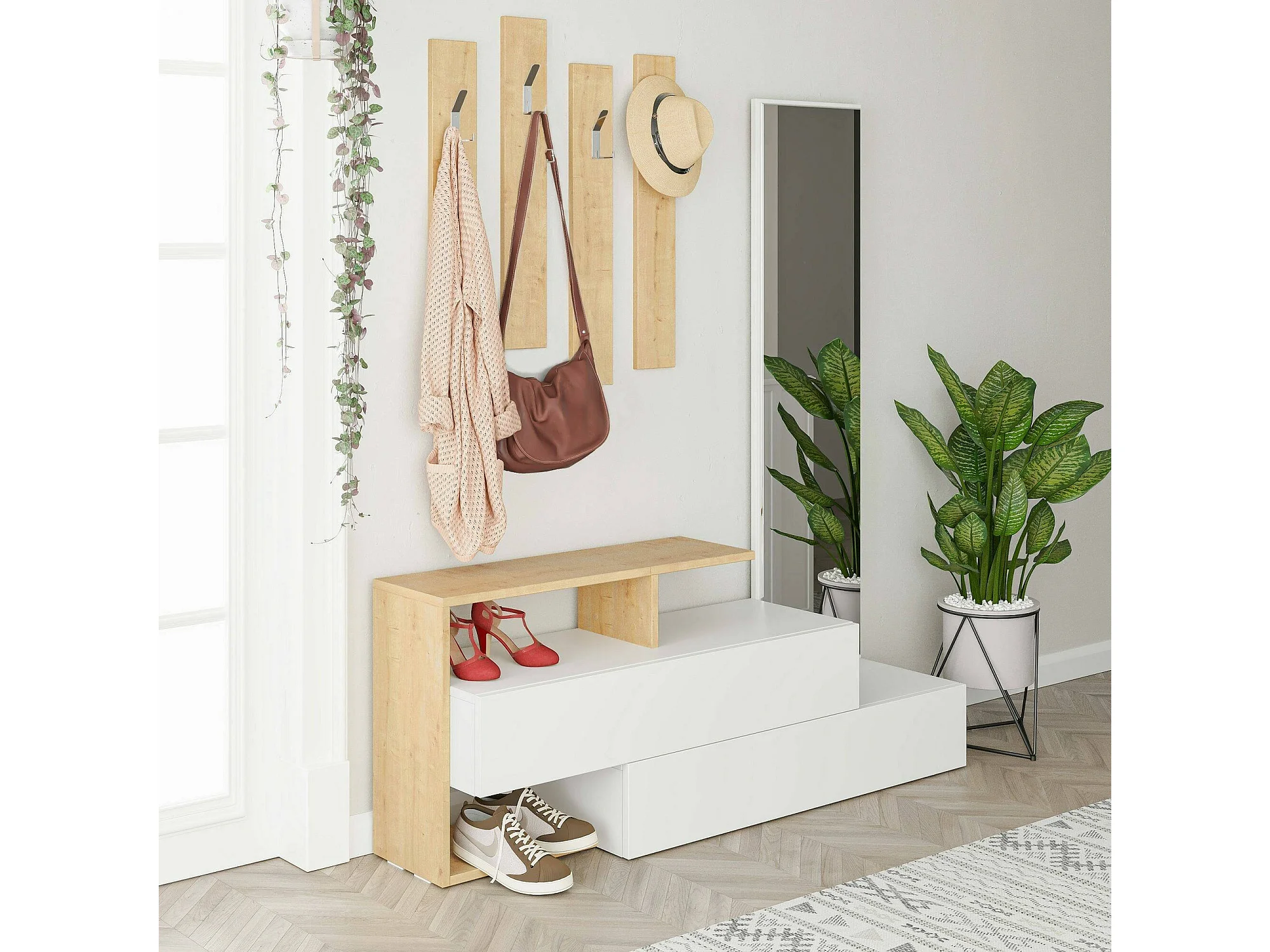Meuble d'entrée Himalia, Crochet d'entrée, Composition pour l'atrium, Console de rangement multifonction, 137x35h55 cm, Blanc et chêne