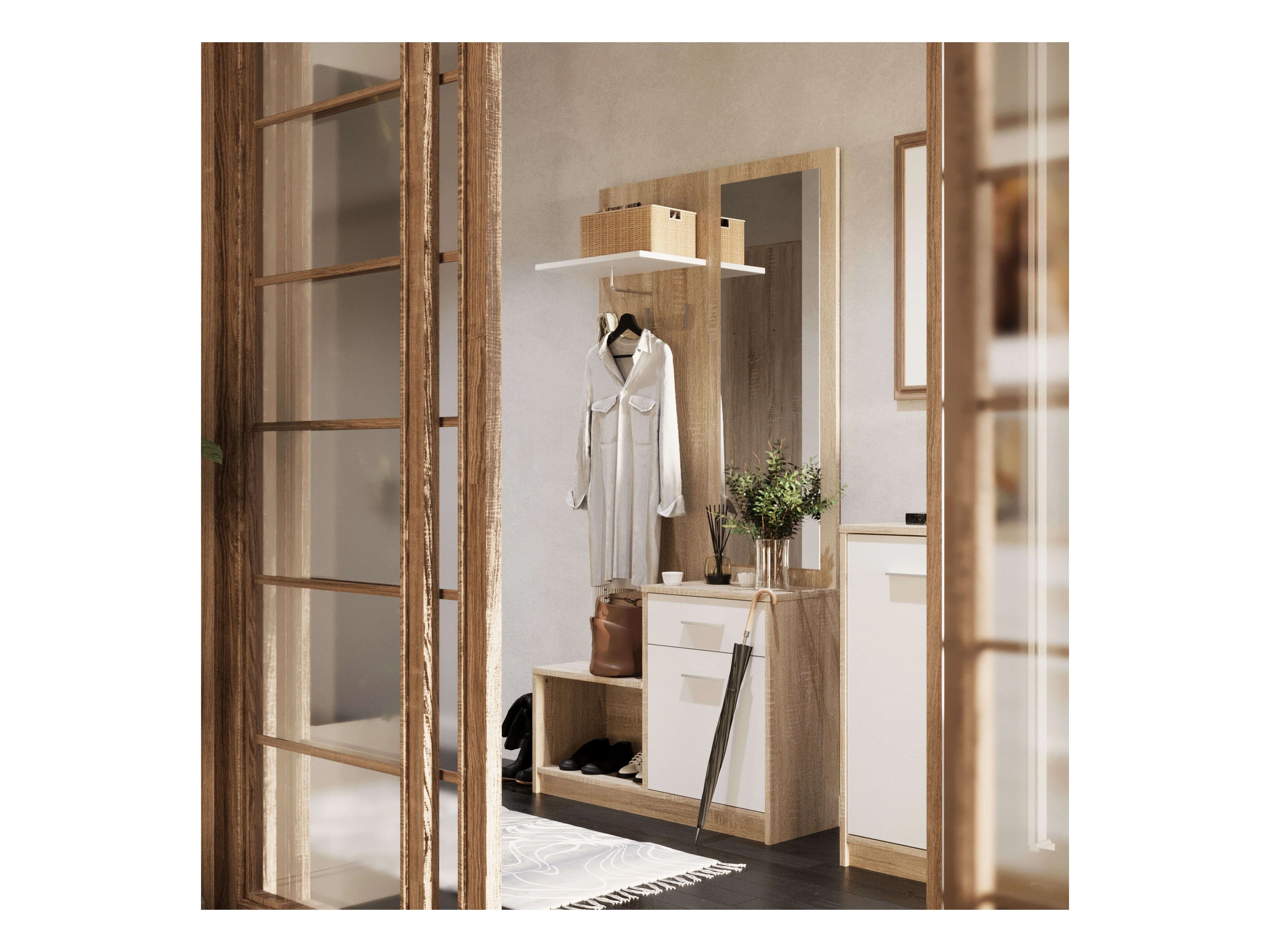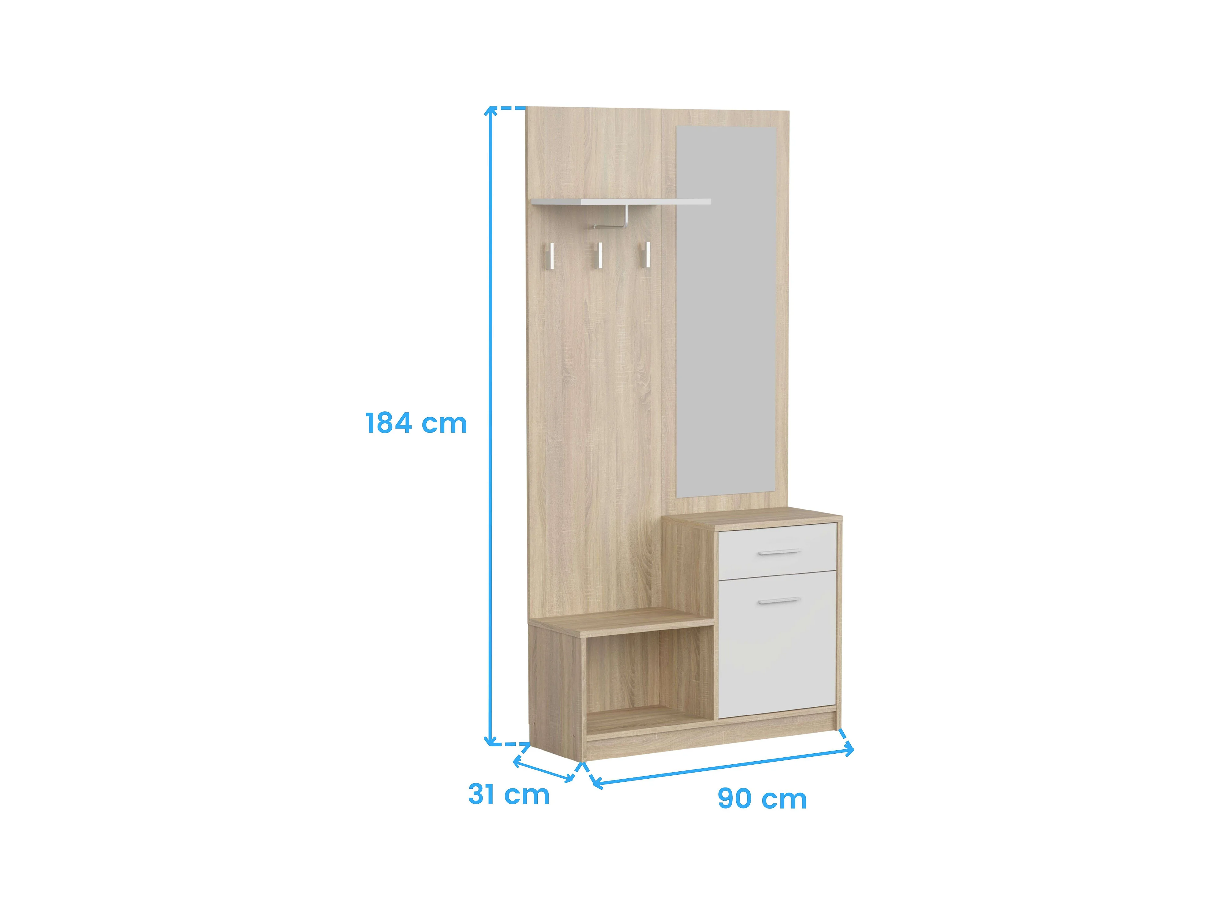 Meuble d'entrée Sett Miroir 1 tiroir 1 porte Étagère creuse Chêne blanc 90 cm